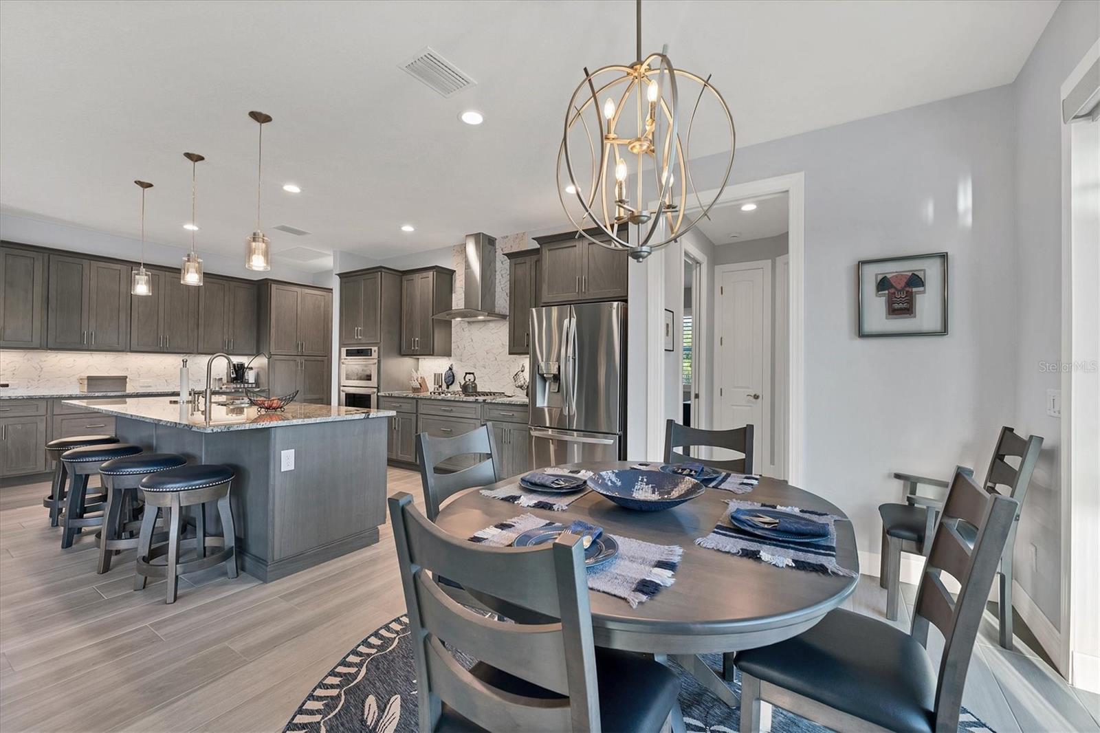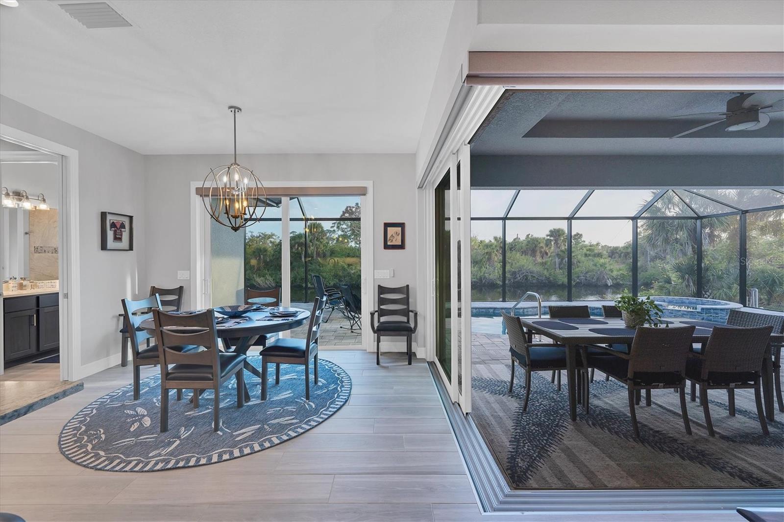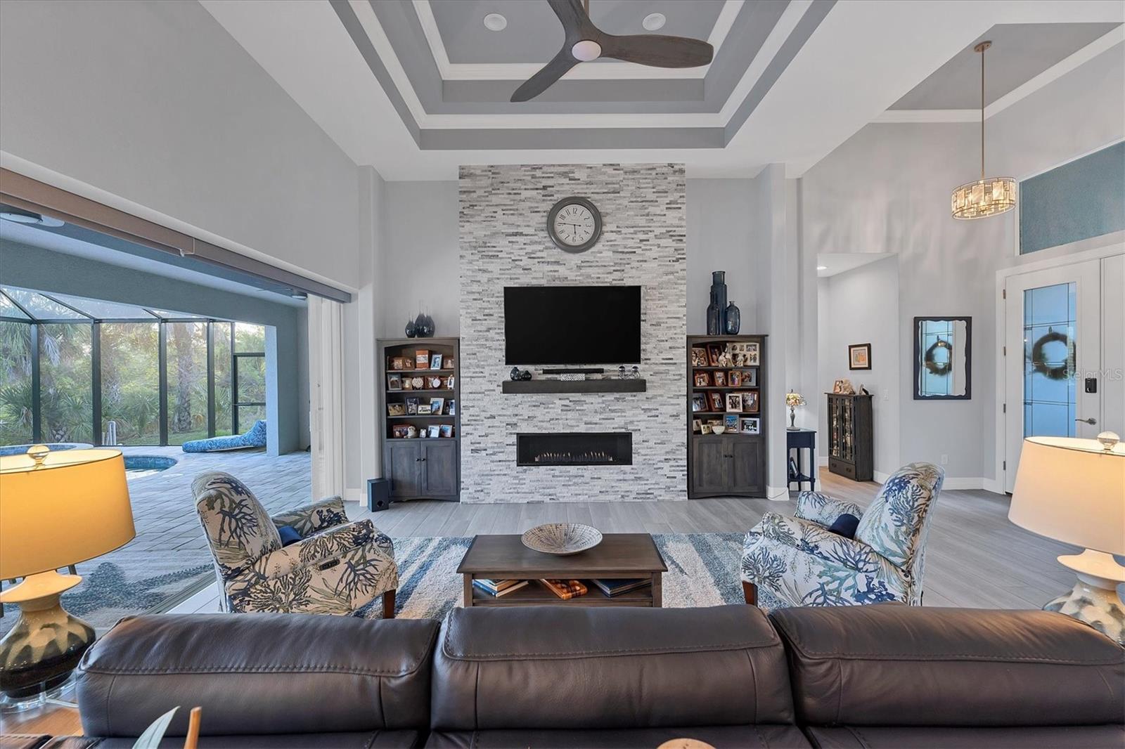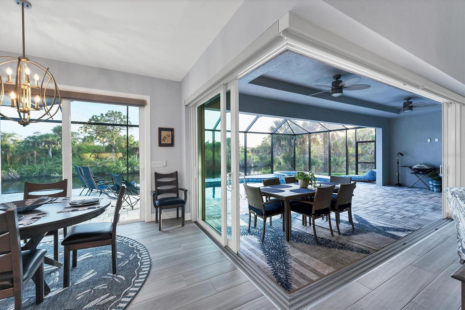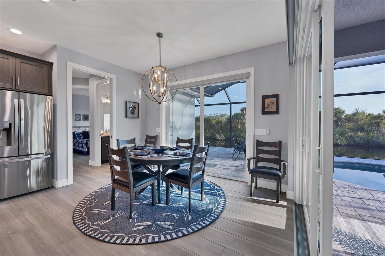 Stepping through the front door your eye is drawn to the beautiful, spacious interior, the pool right outside, and the water view beyond. Your first impression will be “Wow”, and the closer you look the more you will love it.This three-bedroom two-bath house has the open floor plan you want with the large kitchen, living area, and dining area combined as one. Slide the impact doors open and enjoy the large covered lanai for even more room. The owner’s suite is located on one side and the laundry room, garage, second bath and two bedrooms are on the other. The den is just to your left as you enter. This is a perfect place for someone who works from home or you could set up a cozy sitting area away from the main living area.This DM Dean home was completed in 2023 and is better than standard new construction in so many ways. If you purchase this home you will know the exact cost and it will be ready for you to move in the day you close. These are significant improvements over the new construction process. Beyond this, the list of upgrades is long and impressive. All are available in a list for you to review; many are obvious as you look through the house. The building is very energy efficient due to the spray foam insulation and impact windows. The flooring is upgraded plank look porcelain tile throughout. All shower entries are wide and with no barrier so it is easy for everyone. This house is equipped with a 500 gallon propane tank that is used for the whole house generator that will come on automatically when needed. The propane also feeds the fireplace, cook top, oven, and dryer. There custom closets, central vacuum, and upgraded appliances and cabinets speak to the overall quality of the home. This house is on a quiet street already and this property is a triple lot to ensure your privacy in the future. Audio/visual recording equipment may be in operation inside and outside the house.