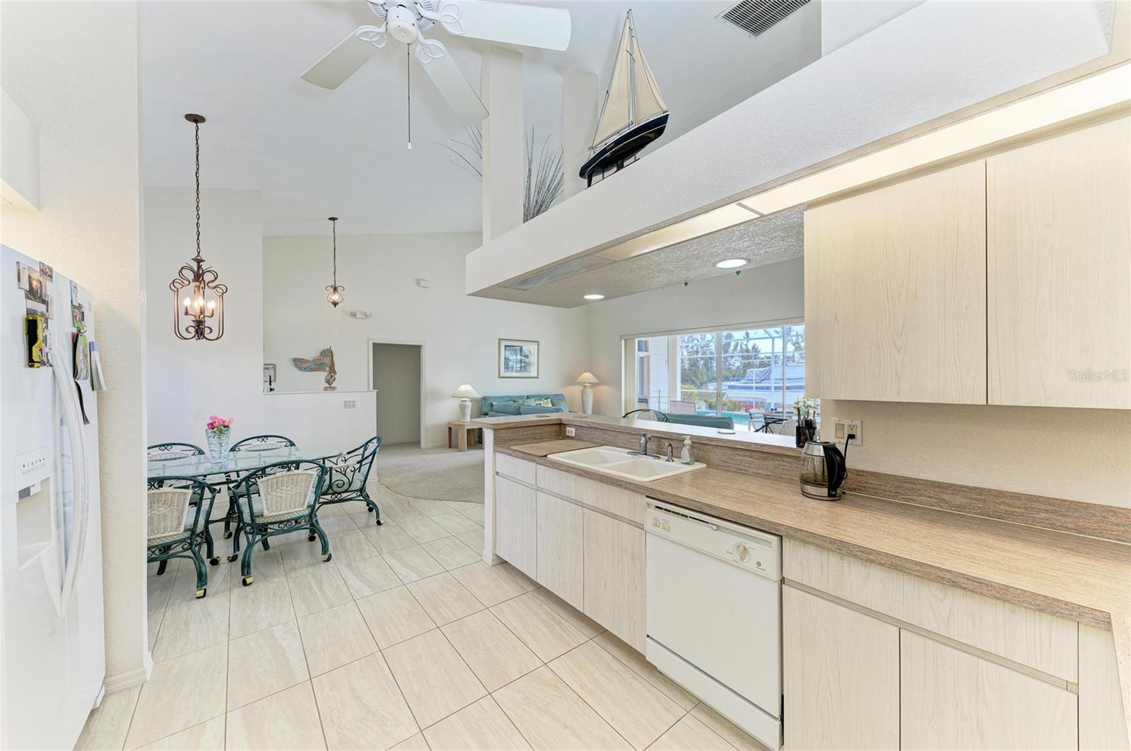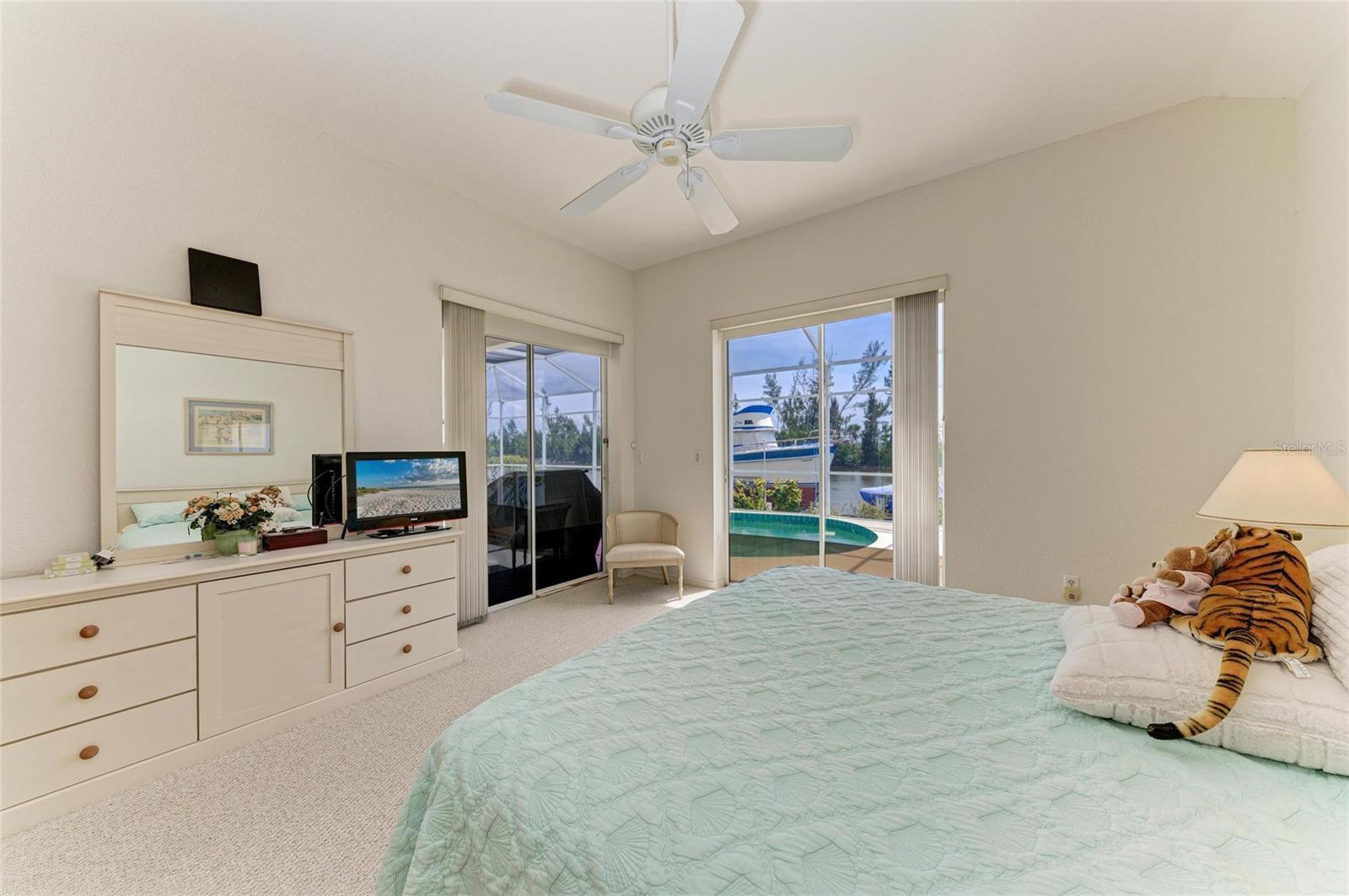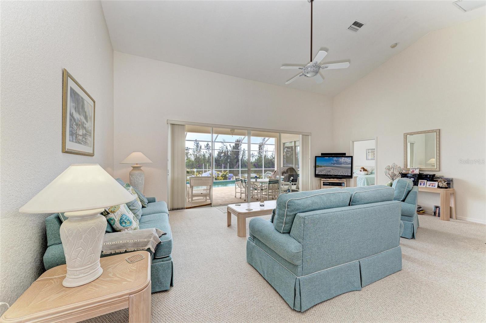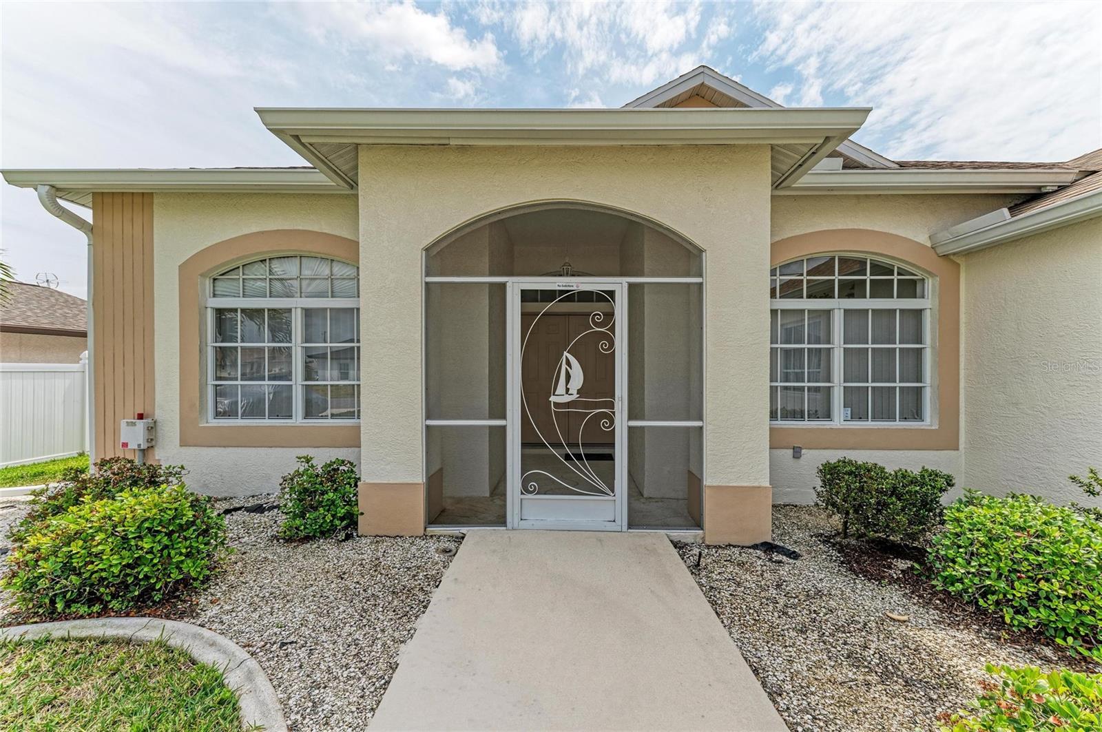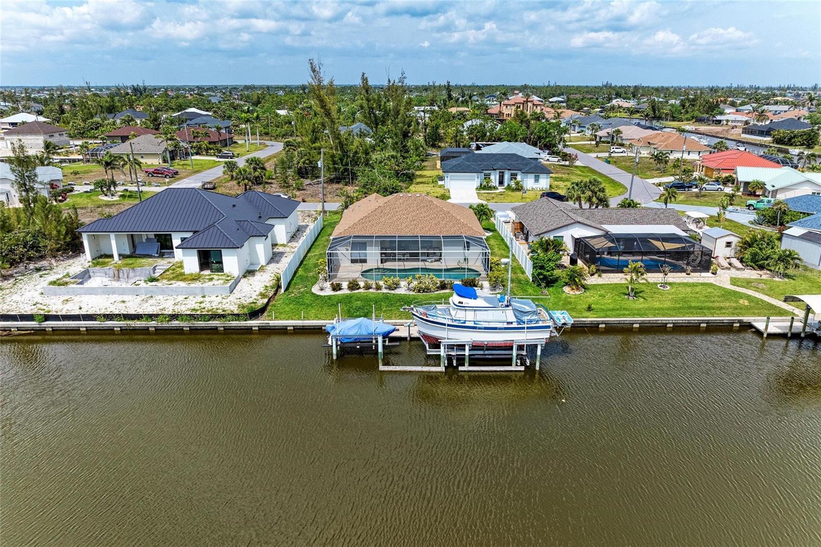 This waterfront home offers breathtaking, unobstructed views across the serene Santa Cruz Canal to a designated preserve area, ensuring privacy and tranquility. Abutting sailboat waters, this property provides the ideal setting for waterfront living. Upon arriving, you’re greeted by a pristine white vinyl fence that runs from the front down both sides of the home, leading to the spacious lanai. Step through double doors into a tiled entryway, where natural light pours in through the transom above, illuminating the soaring cathedral ceiling. The expansive open floor plan flows seamlessly between the kitchen, dinette, and great room, creating an inviting and airy space perfect for both everyday living and entertaining. The kitchen-dinette combo features rectangular tile floors, a convenient pantry, breakfast bar, and all essential appliances. The adjacent great room is carpeted and opens up through sliders, inviting in fresh air and sunlight, enhancing the light, bright ambiance of the home. For privacy, two guest bedrooms are tucked away behind a pocket door, creating a quiet retreat. One of these rooms boasts an ensuite bath with a shower stall, single vanity, and serves as the pool bath with convenient access from the lanai. The second guest bath, located in the hallway, features a single vanity and a combo tub/shower unit. The spacious primary bedroom, located on the opposite side of the home, is a private sanctuary with two sets of sliders leading directly to the lanai and pool area. The suite also offers his-and-her walk-in closets and an ensuite bath with a double vanity, separate tub, and shower, all accented with wall to wall carpet. Step outside to discover your own private oasis—an oversized heated pool (approximately 36' x 12') with a cool deck that promises comfort underfoot. The lanai (22' x 11') and pool area are screened, ensuring peaceful enjoyment of the beautiful views and refreshing breezes. At water's edge, a two-tiered dock (26' x 6') with dual boat lifts (40K lbs & 6K lbs) awaits your watercraft, making this home a true boater's dream. The canal waters also flow through the property’s sprinkler system, keeping your landscaping lush and vibrant year-round. Recent upgrades include a new pool pump, irrigation pump, and water heater all replaced in 2025, and a new roof installed in 2022. With several airports in southwest Florida nearby, as well as a wealth of dining, hiking and biking trails, and Gulf Coast beaches, this location provides both convenience and recreation. The area is renowned for world-class tarpon fishing and abundant outdoor activities. This is a great opportunity to own a waterfront property that blends comfort and privacy with nature's beauty. Bring your vision to life and start living the waterfront lifestyle you deserve.