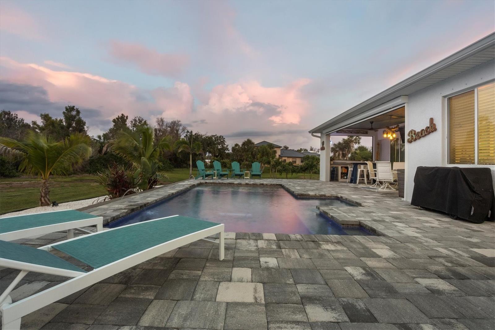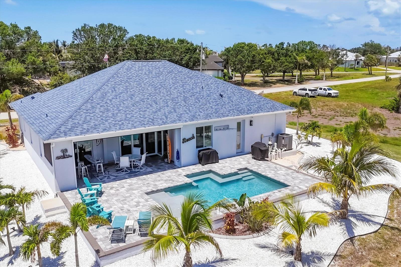 Built in 2019 this stunning 3 bed, plus den/study, 2 bath home sits on over half an acre of land, with a gorgeous heated pool and lanai and a car lover's dream 3 car garage. Located in the historic Vanderbilt developed neighborhood of Cape Haze with banyan lined streets, sidewalks to stroll to shopping and dining. Like all the homes in the neighborhood the house sits nicely back from the street, with a wide paver driveway and walkway up to the front door. Tall ceilings, large open kitchen and great room, custom wood cabinetry, stone counter tops, designer tile backsplash, high end appliances, plank tile flooring throughout, 8-foot zero corner sliding glass doors to the lanai, a full roll down screen and an outdoor kitchen on the lanai. Expansive paver lanai, beautifully designed pool with a sun shelf and in-pool seating. An incredible jumbo size 3 car garage with oversized stall doors, with two doors that are 9' wide by 10' tall and one 10'x10' middle door. Extra deep and tall ceilings, perfect for car lifts, storing boats, a workshop, and tremendous storage space. The home also comes with a very handy 10'x16' shed, perfect for even more storage. Cape Haze is a special waterfront community with membership in the Cape Haze POA there is usage of a dock and private beach on Don Pedro Island. A phenomenal location, Cape Haze is close to three full service marinas, numerous public and private golf courses, historic Boca Grande, miles of pristine sandy beaches and world-class fishing and boating.