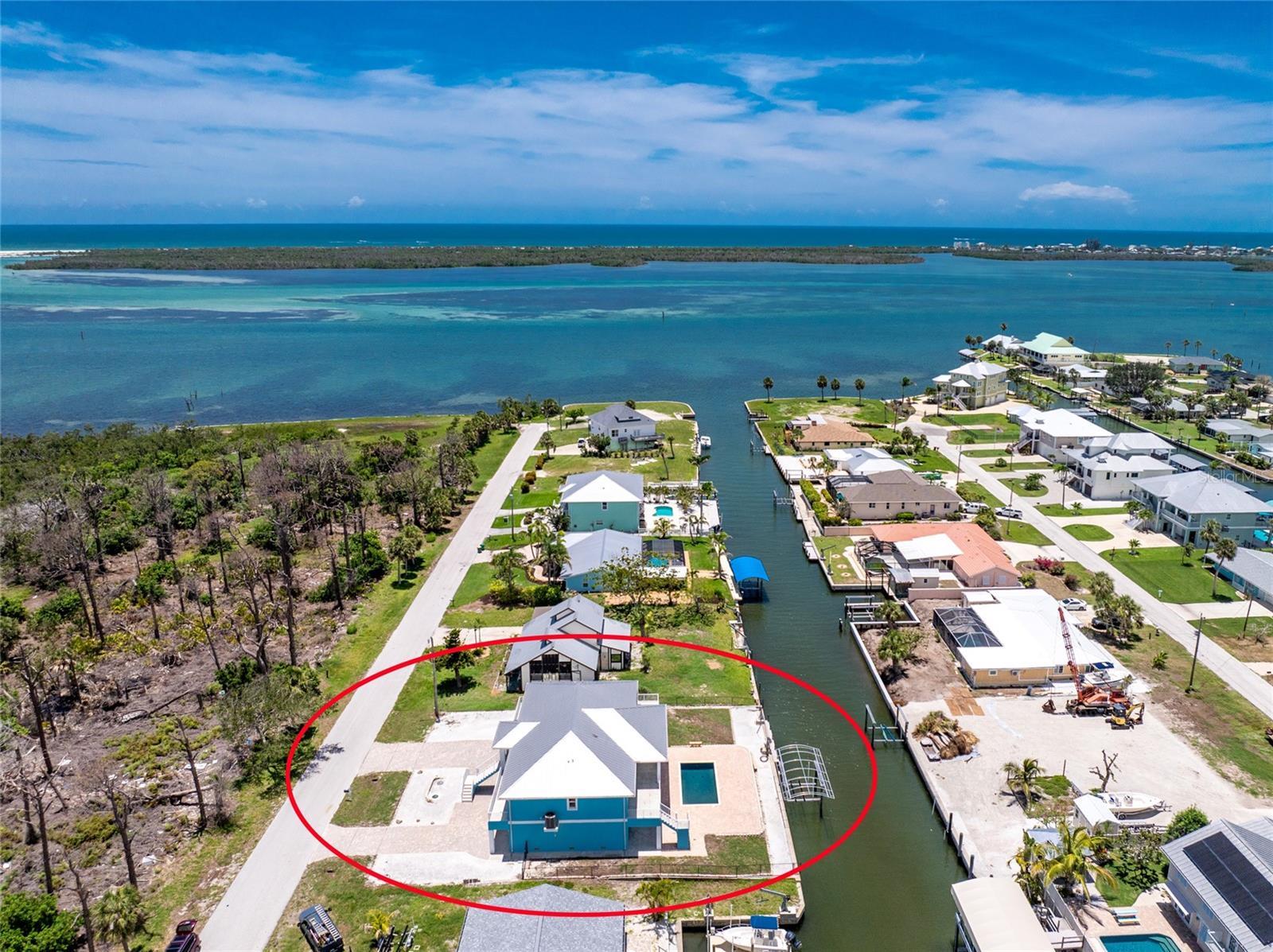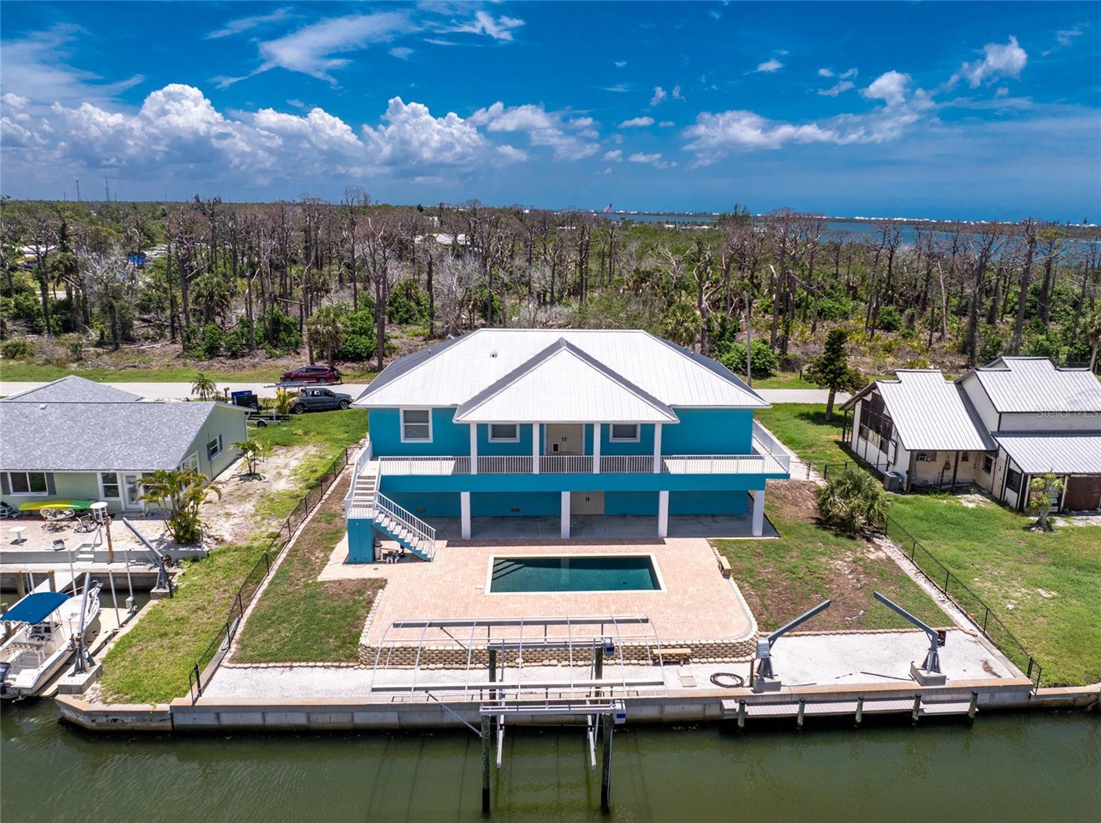 One or more photo(s) has been virtually staged. This WATERFRONT - NO BRIDGES TO BAY - HOME IS BUILT LIKE A FORTRESS! Concrete block stucco construction all the way up, with poured slab concrete flooring, and a METAL roof! Impact doors and windows! Finished floor elevation is over 18 feet, so flood insurance will be very affordable. Don't worry about all the steps as there is an elevator. With 100' ft of seawall and a covered 7000# boat lift, you can walk right out of your home, jump in the boat, and be in Lemon Bay in minutes, with fast access to Stump Pass and the Gulf of America! Very open great room design floor plan allows furniture placement in all kinds of different configurations! The kitchen features maple cabinetry, and solid surface countertops, and pantry for extra storage. Stainless appliance package includes: smooth top stove, dishwasher, built in microwave, and French door refrigerator. (all Kenmore) Laundry room is handily located just off the kitchen, and includes Kenmore front load washer and dryer. The primary bedroom has a walk in closet, ceiling fan, and ensuite bath, with double vanities w/solid surface countertops and a step in shower with easy clean solid surface walls. Guest bedrooms both have ceiling fans and walk in closets, and share a Jack and Jill bathroom, which features a combo tub/shower w/solid surface walls, linen closet, and vanity w/double basins. Each bedroom has it's OWN AC CONTROL PANEL AND ZONE! Half bath is conveniently located just off the Great room. The existing stained concrete flooring provides an opportunity to install whatever kind of flooring you like. Home is equipped with both central vacuum and a security system. Water heater was new in 2024, and AC system in 2020. Huge garage has all the storage you may need, with two automatic garage door openers. Catch some rays in your Pretty Pebbletec pool with paver decking. There's a 1300 gallon cistern that is filled from rainwater, providing an easy and inexpensive way to fill the pool or water your plants! Huge covered area downstairs would be just perfect for an outside kitchen. This home sustained NO HURRICANE DAMAGE AT ALL FROM HURRICANE IAN, and only about 27" of water in the garage from Milton. (concrete block walls made for easy cleaning!) Call today for your private appointment to see this home!