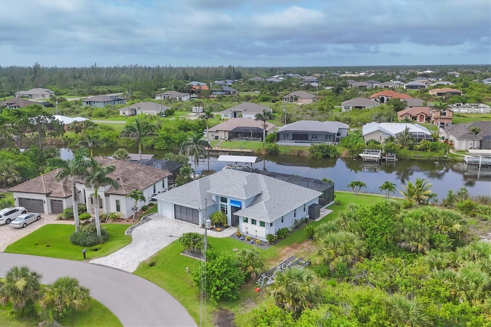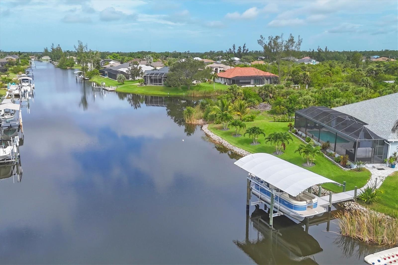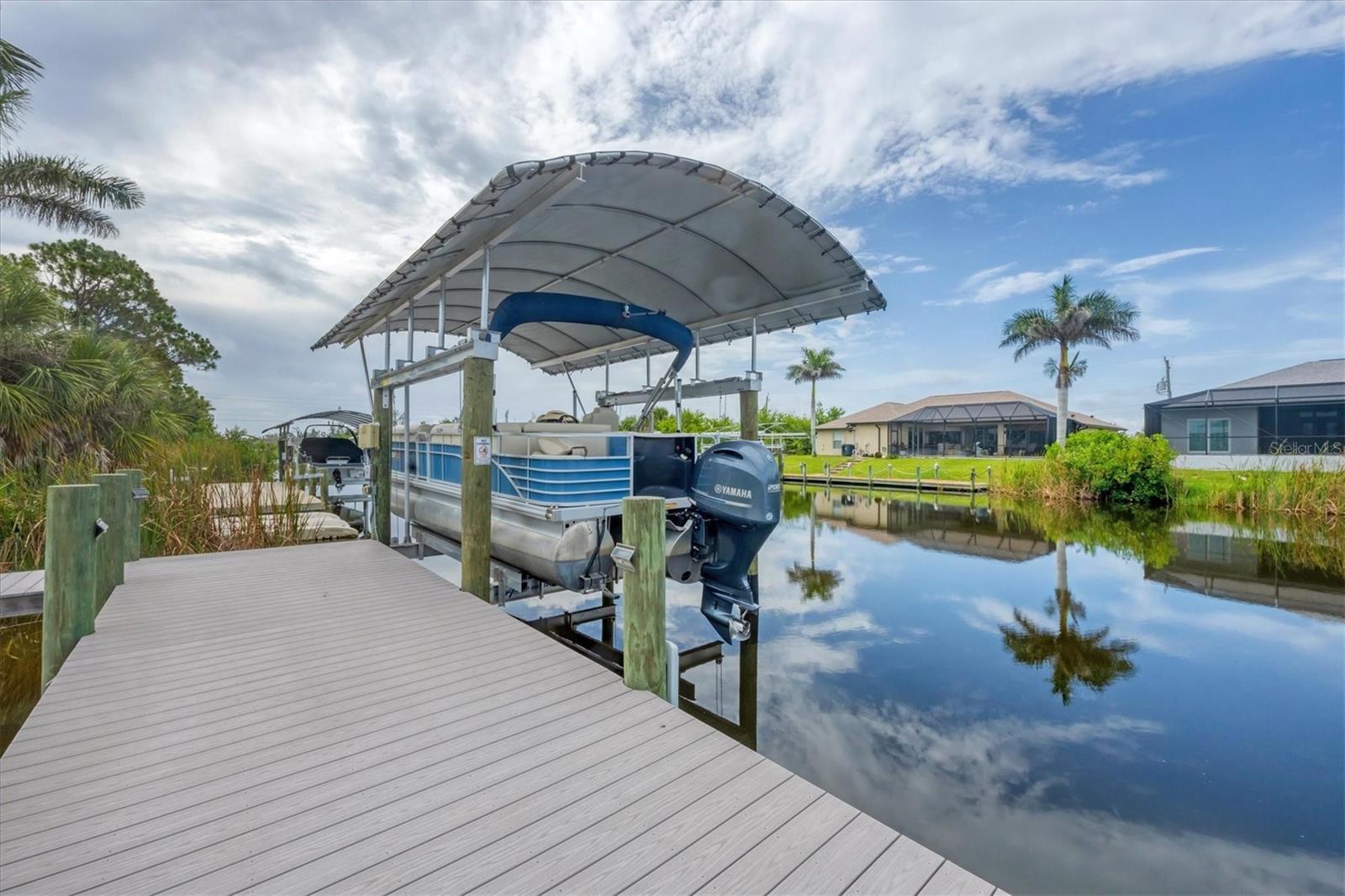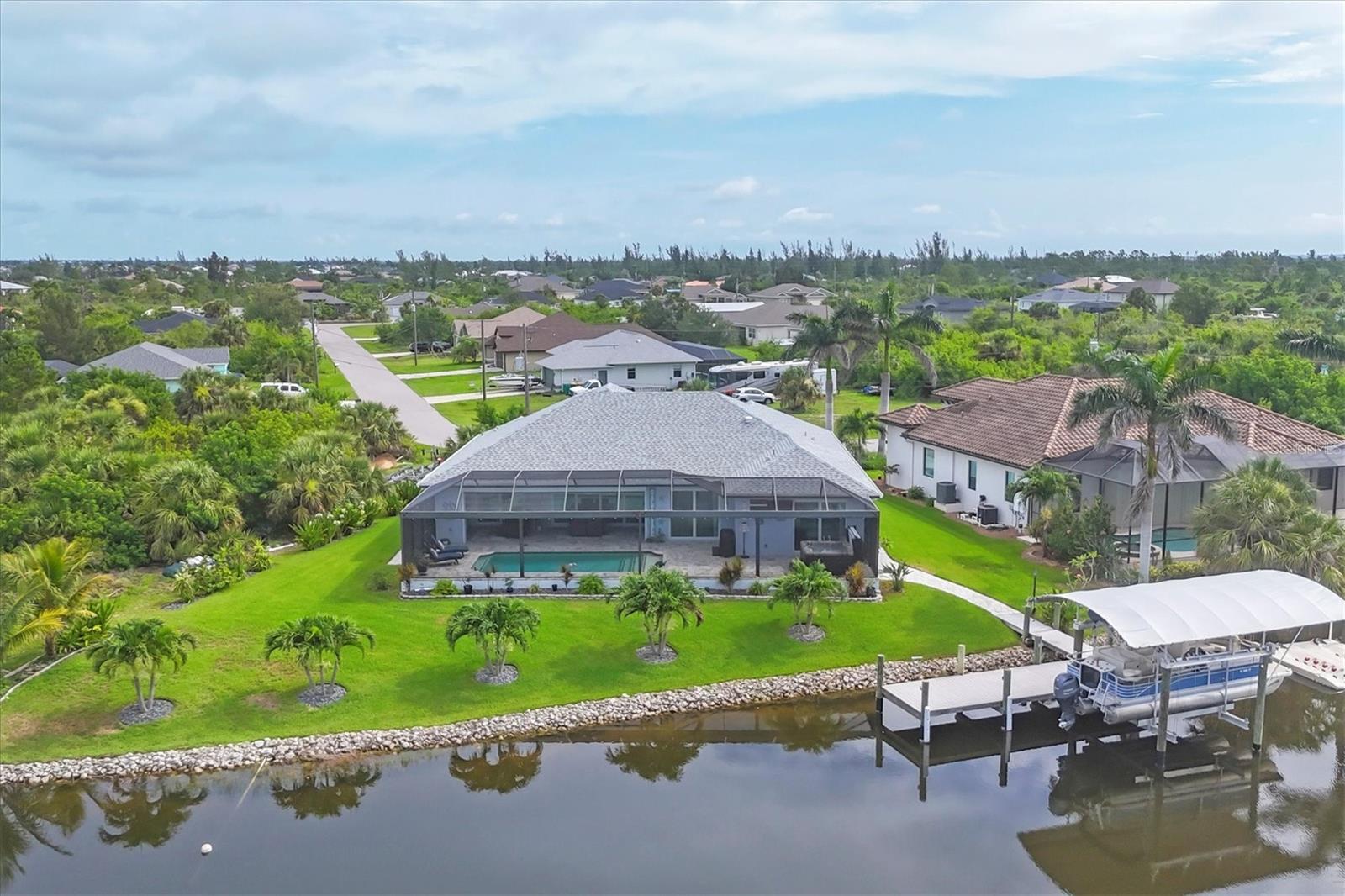 Prime location, luxury, and lifestyle come together beautifully in this gorgeous 3-bedroom, 2-bath coastal retreat in the highly sought-after waterfront community of South Gulf Cove. Situated on an oversized half-tip lot with 145 feet of rip-rapped waterfront and southwest exposure, you’ll enjoy breathtaking sunsets and serene water views every evening. A boater’s paradise, this property offers quick access to open water with only one bridge and a 2-minute ride to fast water. The 10,000 lb. boat lift with canopy, water, and electric sits alongside a maintenance-free 8' x 30' composite dock, making your waterfront adventures seamless and stress-free. This home is loaded with high-end upgrades and thoughtful design throughout. The screened front porch welcomes in the Florida breeze, while impact-resistant windows and doors provide peace of mind and storm protection. As you enter through the double front doors, you’re greeted by an airy, open-concept living area filled with natural light, zero-corner sliders, and dramatic 14-foot tray ceilings in the living room. A custom stone entertainment wall with built-in decor cubbies and an electric fireplace adds a cozy and upscale touch. The chef’s kitchen is both functional and beautiful, offering soft-close cabinetry, extra pull-outs, Level 4 granite countertops, an oversized island, and a striking stone-and-marble backsplash. Top-of-the-line Samsung Black Stainless appliances include a double-door convection oven and French door refrigerator. The laundry room is equipped with a Samsung washer and dryer and features a built-in pantry for additional storage. A split-bedroom floor plan ensures privacy, with the main suite tucked away on one side of the home. The spacious primary bedroom features dual walk-in closets and a luxurious bathroom with two separate vanities, a private water closet, and a walk-through tiled shower complete with a rain shower head and handheld wand for both convenience and relaxation. The guest wing includes two well-appointed bedrooms—one with sliding door access to the lanai—and a beautifully tiled bathroom with walk-in shower and pool access. Step outside to a backyard oasis where upgraded St. Augustine grass enhances the lush landscaping and curb appeal. The expansive lanai is perfect for entertaining or unwinding, featuring a built-in bar area with a bar fridge and wet sink, and an electric fireplace that adds ambiance and warmth on a cool Florida evening. An electric roll-down hurricane screen transforms the space into a comfortable indoor-outdoor retreat, protected from the elements yet open to the view. Enjoy the inviting pool with a large sundeck and wide steps, framed by four picture-window screens for unobstructed waterfront views. For even more relaxation, soak in the above-ground Vita Spa hot tub with 52 jets and let the stress of the day melt away. Additional features include a spacious 3-car garage with built-in overhead shelving and a utility sink, sliding screens on the double garage door, full irrigation system with a new pump, blown insulation throughout the entire roof area, a 30-amp generator outlet, and a paver walkway from the garage to the dock for safety and convenience. Located just minutes from Boca Grande beaches, top-rated golf courses, world-class fishing, and boating access to waterfront dining, this South Gulf Cove gem offers the ultimate Florida lifestyle. Don’t miss your opportunity to own this exceptional waterfront home!