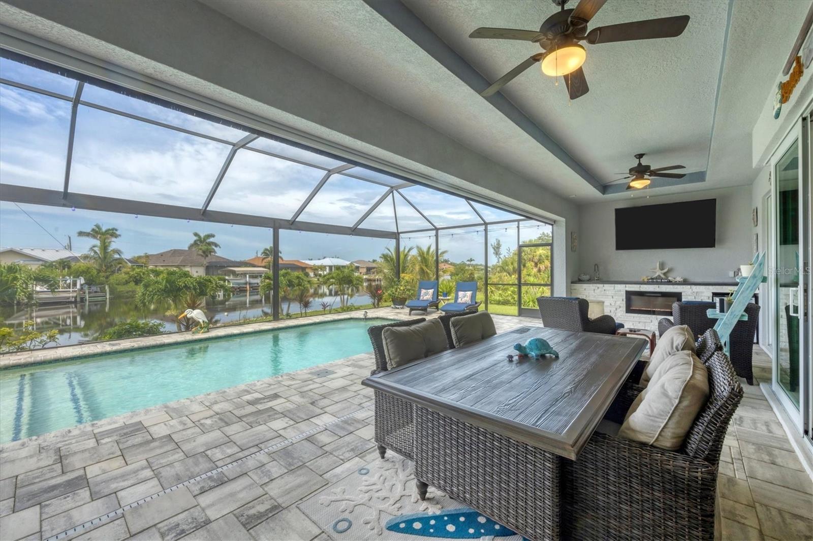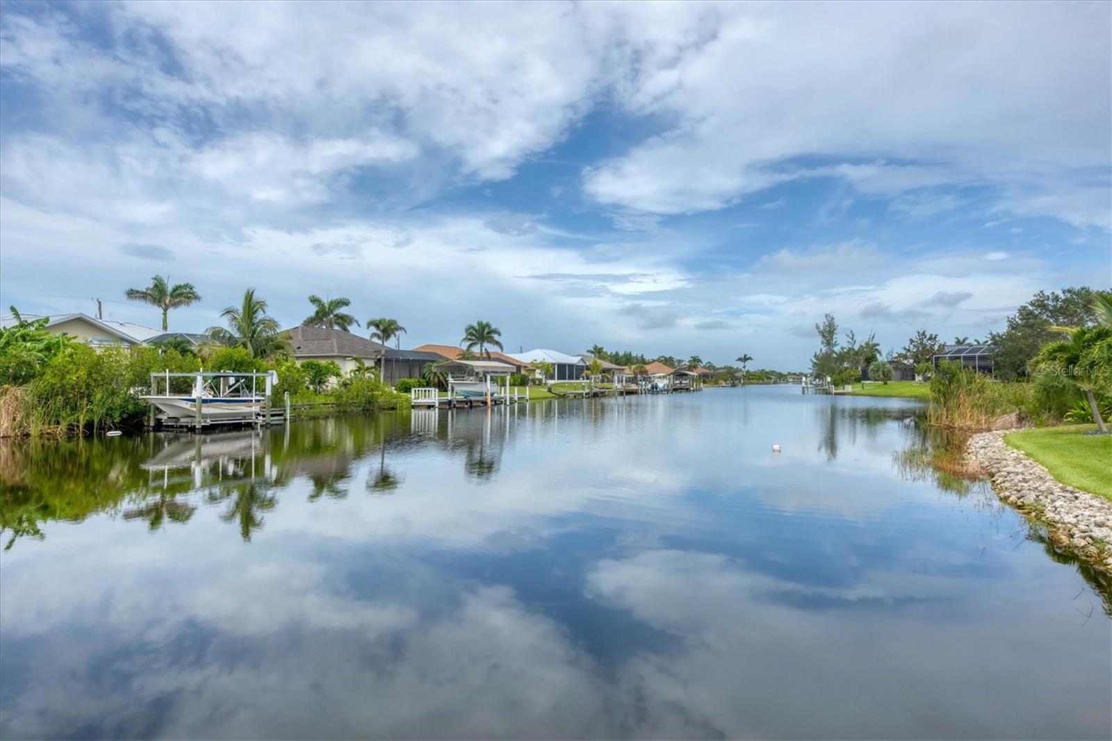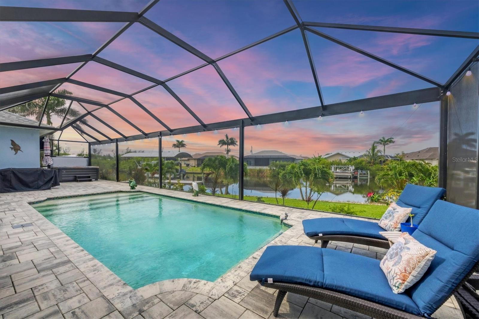 Prime location, luxury, and lifestyle come together beautifully in this gorgeous 3-bedroom, 2-bath coastal retreat in the highly sought-after waterfront community of South Gulf Cove. Situated on an oversized half-tip lot with 145 feet of rip-rapped waterfront and southwest exposure, you’ll enjoy breathtaking sunsets and serene water views every evening. A boater’s paradise, this property offers quick access to open water with only one bridge and a 2-minute ride to fast water. The 10,000 lb. boat lift with canopy, water, and electric sits alongside a maintenance-free 8' x 30' composite dock, making your waterfront adventures seamless and stress-free. This home is loaded with high-end upgrades and thoughtful design throughout. The screened front porch welcomes in the Florida breeze, while impact-resistant windows and doors provide peace of mind and storm protection. As you enter through the double front doors, you’re greeted by an airy, open-concept living area filled with natural light, zero-corner sliders, and dramatic 14-foot tray ceilings in the living room. A custom stone entertainment wall with built-in decor cubbies and an electric fireplace adds a cozy and upscale touch. The chef’s kitchen is both functional and beautiful, offering soft-close cabinetry, extra pull-outs, Level 4 granite countertops, an oversized island, and a striking stone-and-marble backsplash. Top-of-the-line Samsung Black Stainless appliances include a double-door convection oven and French door refrigerator. The laundry room is equipped with a Samsung washer and dryer and features a built-in pantry for additional storage. A split-bedroom floor plan ensures privacy, with the main suite tucked away on one side of the home. The spacious primary bedroom features dual walk-in closets and a luxurious bathroom with two separate vanities, a private water closet, and a walk-through tiled shower complete with a rain shower head and handheld wand for both convenience and relaxation. The guest wing includes two well-appointed bedrooms—one with sliding door access to the lanai—and a beautifully tiled bathroom with walk-in shower and pool access. Step outside to a backyard oasis where upgraded St. Augustine grass enhances the lush landscaping and curb appeal. The expansive lanai is perfect for entertaining or unwinding, featuring a built-in bar area with a bar fridge and wet sink, and an electric fireplace that adds ambiance and warmth on a cool Florida evening. An electric roll-down hurricane screen transforms the space into a comfortable indoor-outdoor retreat, protected from the elements yet open to the view. Enjoy the inviting pool with a large sundeck and wide steps, framed by four picture-window screens for unobstructed waterfront views. For even more relaxation, soak in the above-ground Vita Spa hot tub with 52 jets and let the stress of the day melt away. Additional features include a spacious 3-car garage with built-in overhead shelving and a utility sink, sliding screens on the double garage door, full irrigation system with a new pump, blown insulation throughout the entire roof area, a 30-amp generator outlet, and a paver walkway from the garage to the dock for safety and convenience. Located just minutes from Boca Grande beaches, top-rated golf courses, world-class fishing, and boating access to waterfront dining, this South Gulf Cove gem offers the ultimate Florida lifestyle. Don’t miss your opportunity to own this exceptional waterfront home!