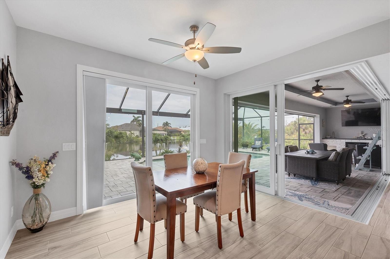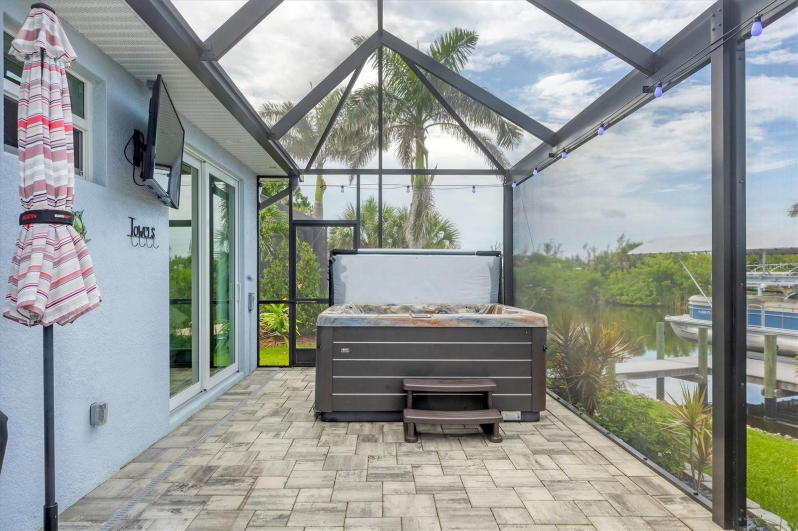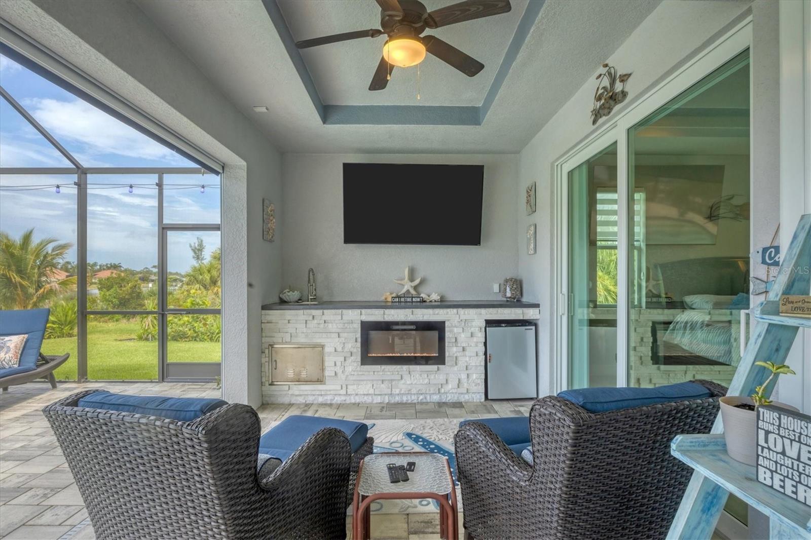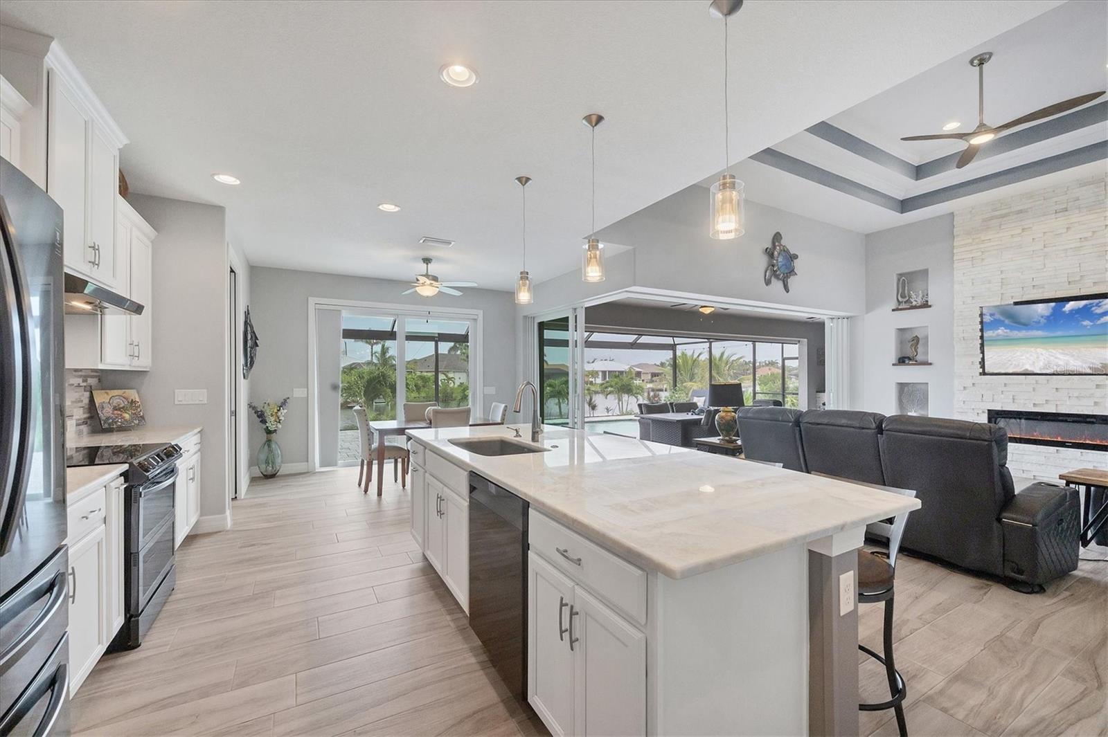 Prime location, luxury, and lifestyle come together beautifully in this gorgeous 3-bedroom, 2-bath coastal retreat in the highly sought-after waterfront community of South Gulf Cove. Situated on an oversized half-tip lot with 145 feet of rip-rapped waterfront and southwest exposure, you’ll enjoy breathtaking sunsets and serene water views every evening. A boater’s paradise, this property offers quick access to open water with only one bridge and a 2-minute ride to fast water. The 10,000 lb. boat lift with canopy, water, and electric sits alongside a maintenance-free 8' x 30' composite dock, making your waterfront adventures seamless and stress-free. This home is loaded with high-end upgrades and thoughtful design throughout. The screened front porch welcomes in the Florida breeze, while impact-resistant windows and doors provide peace of mind and storm protection. As you enter through the double front doors, you’re greeted by an airy, open-concept living area filled with natural light, zero-corner sliders, and dramatic 14-foot tray ceilings in the living room. A custom stone entertainment wall with built-in decor cubbies and an electric fireplace adds a cozy and upscale touch. The chef’s kitchen is both functional and beautiful, offering soft-close cabinetry, extra pull-outs, Level 4 granite countertops, an oversized island, and a striking stone-and-marble backsplash. Top-of-the-line Samsung Black Stainless appliances include a double-door convection oven and French door refrigerator. The laundry room is equipped with a Samsung washer and dryer and features a built-in pantry for additional storage. A split-bedroom floor plan ensures privacy, with the main suite tucked away on one side of the home. The spacious primary bedroom features dual walk-in closets and a luxurious bathroom with two separate vanities, a private water closet, and a walk-through tiled shower complete with a rain shower head and handheld wand for both convenience and relaxation. The guest wing includes two well-appointed bedrooms—one with sliding door access to the lanai—and a beautifully tiled bathroom with walk-in shower and pool access. Step outside to a backyard oasis where upgraded St. Augustine grass enhances the lush landscaping and curb appeal. The expansive lanai is perfect for entertaining or unwinding, featuring a built-in bar area with a bar fridge and wet sink, and an electric fireplace that adds ambiance and warmth on a cool Florida evening. An electric roll-down hurricane screen transforms the space into a comfortable indoor-outdoor retreat, protected from the elements yet open to the view. Enjoy the inviting pool with a large sundeck and wide steps, framed by four picture-window screens for unobstructed waterfront views. For even more relaxation, soak in the above-ground Vita Spa hot tub with 52 jets and let the stress of the day melt away. Additional features include a spacious 3-car garage with built-in overhead shelving and a utility sink, sliding screens on the double garage door, full irrigation system with a new pump, blown insulation throughout the entire roof area, a 30-amp generator outlet, and a paver walkway from the garage to the dock for safety and convenience. Located just minutes from Boca Grande beaches, top-rated golf courses, world-class fishing, and boating access to waterfront dining, this South Gulf Cove gem offers the ultimate Florida lifestyle. Don’t miss your opportunity to own this exceptional waterfront home!