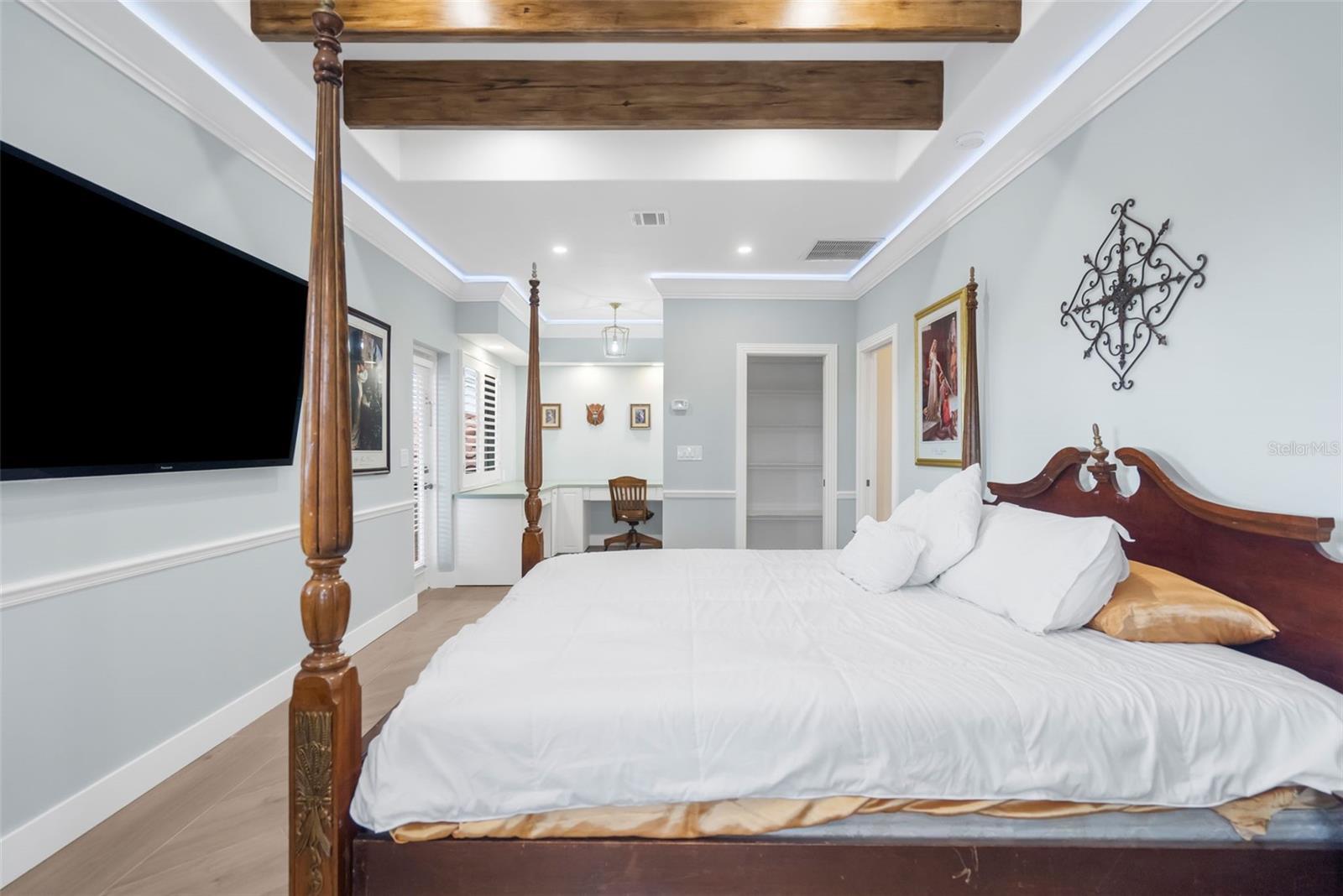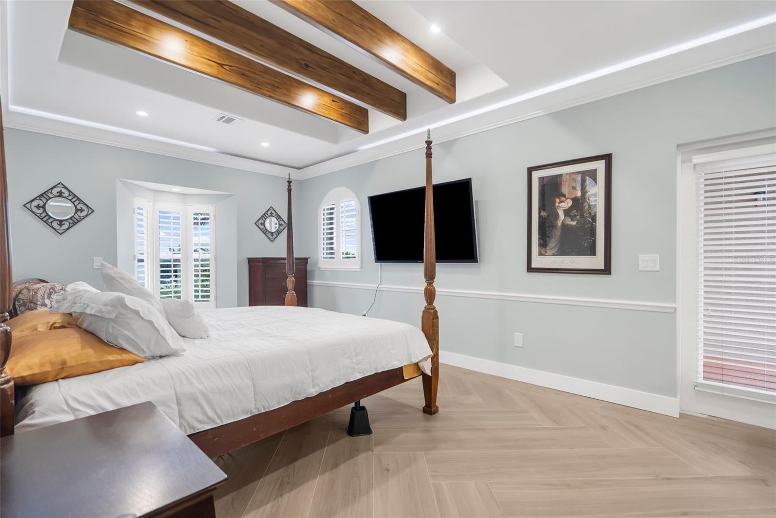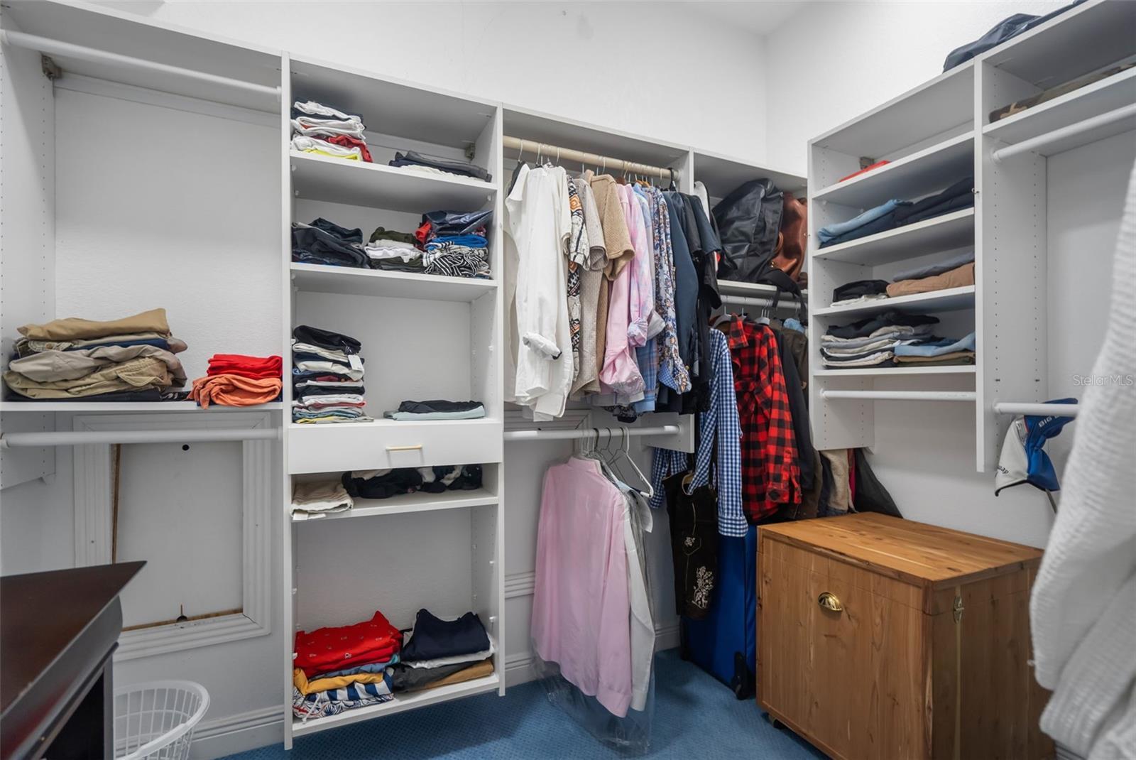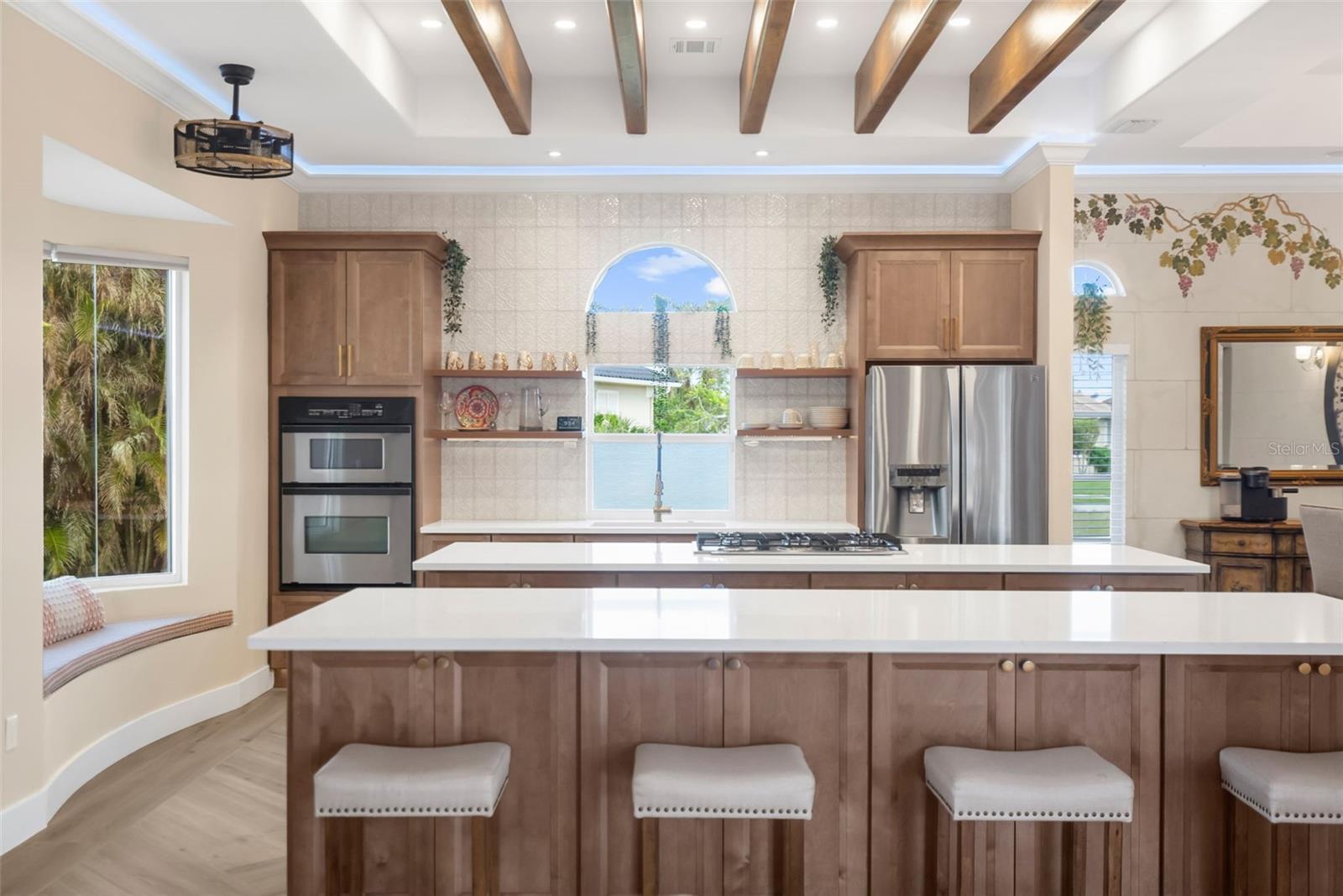 - Ceiling Fans(s), Central Vaccum, Chair Rail, Coffered Ceiling(s), Crown Molding, Eat-in Kitchen, High Ceilings, Kitchen/Family Room Combo, Living Room/Dining Room Combo, Open Floorplan, Primary Bedroom Main Floor, Solid Wood Cabinets, Stone Counters, Thermostat, Vaulted Ceiling(s), Walk-In Closet(s), Wet Bar