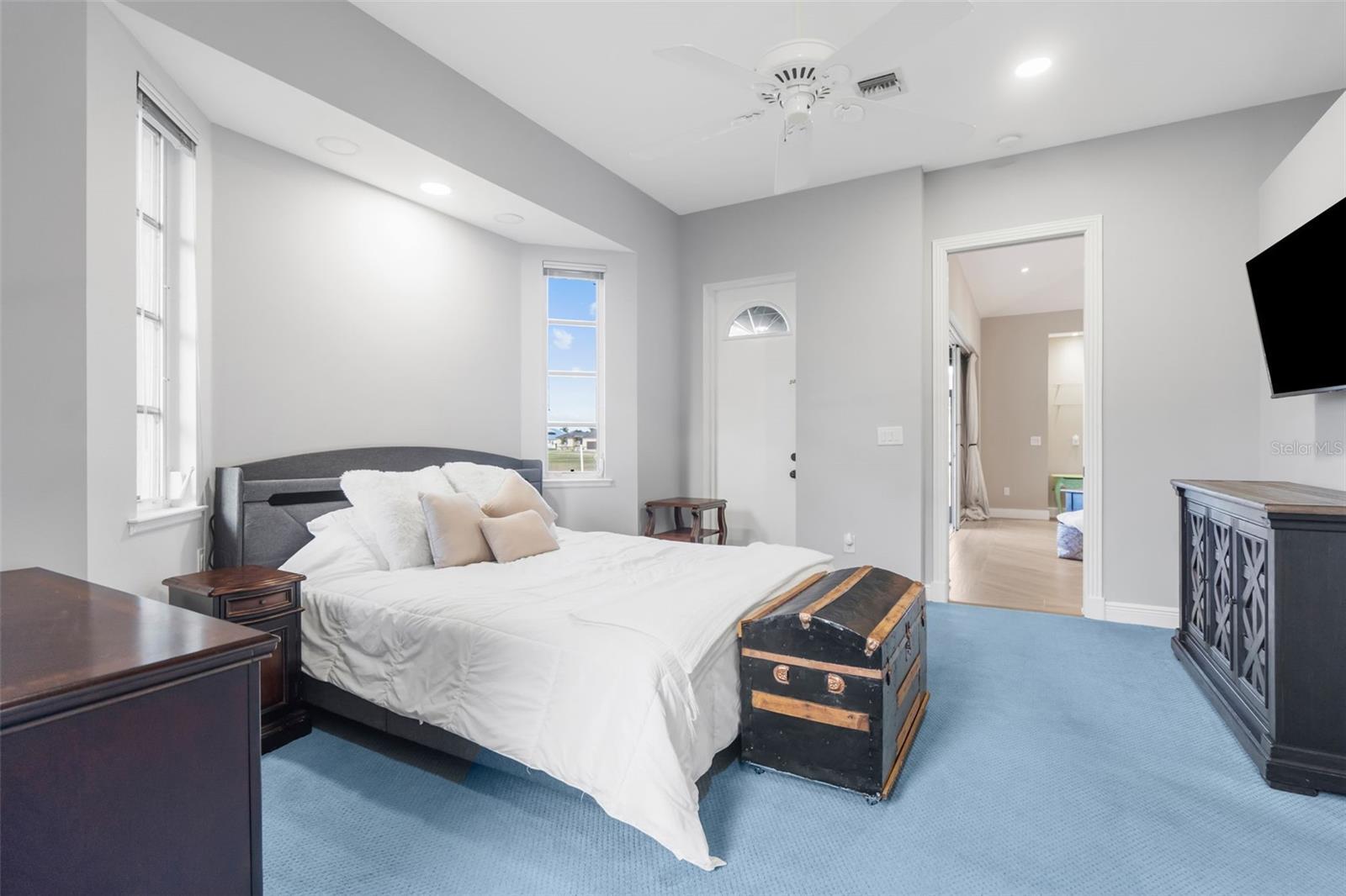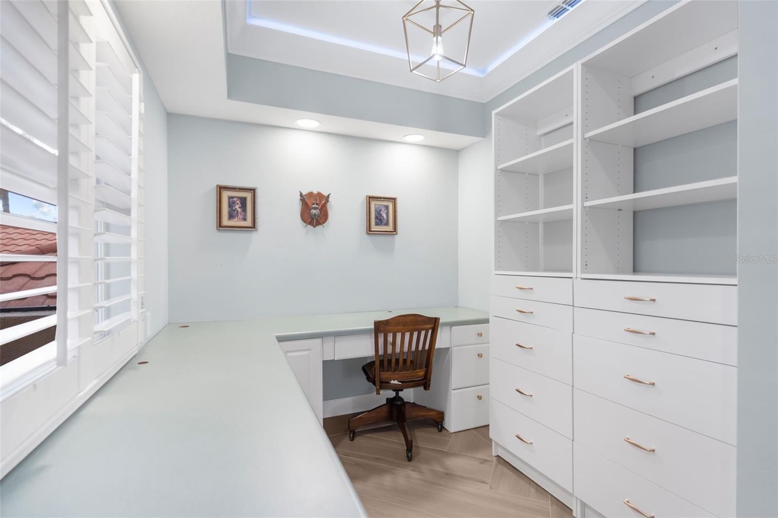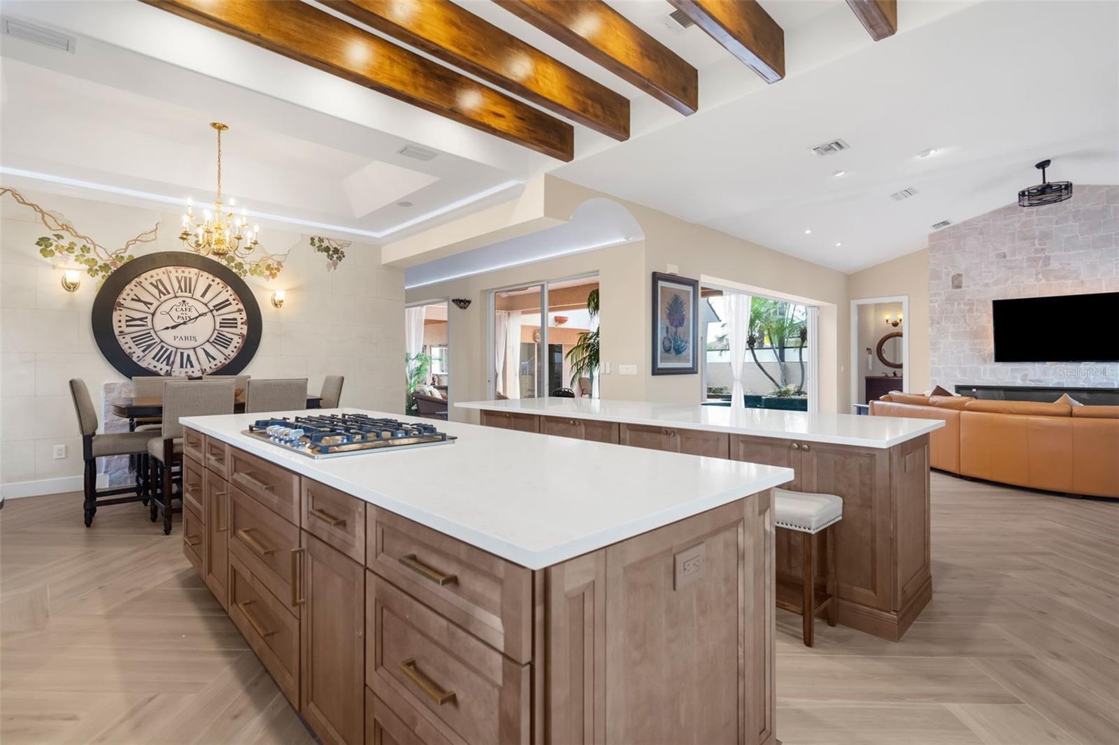 - Ceiling Fans(s), Central Vaccum, Chair Rail, Coffered Ceiling(s), Crown Molding, Eat-in Kitchen, High Ceilings, Kitchen/Family Room Combo, Living Room/Dining Room Combo, Open Floorplan, Primary Bedroom Main Floor, Solid Wood Cabinets, Stone Counters, Thermostat, Vaulted Ceiling(s), Walk-In Closet(s), Wet Bar