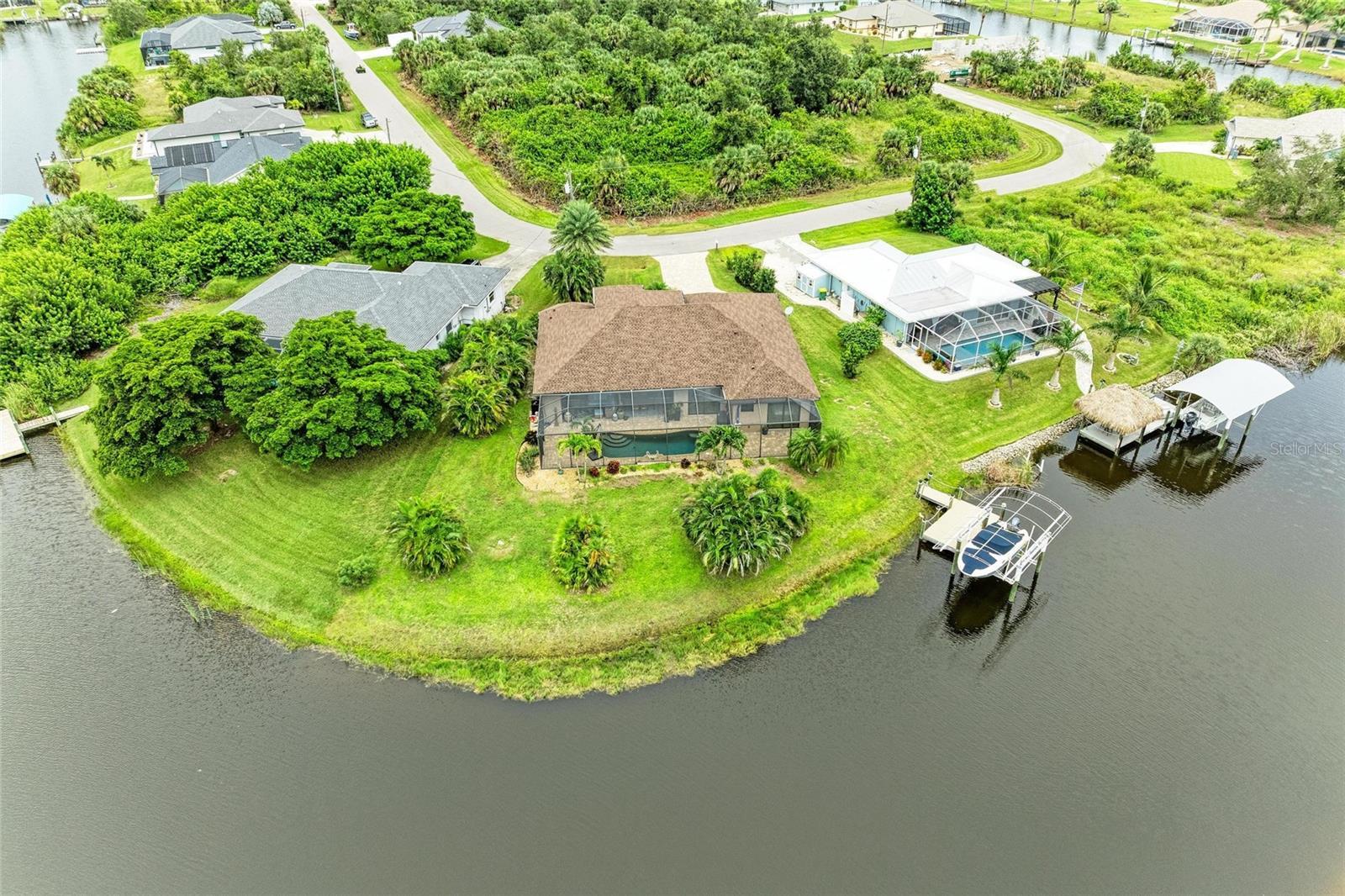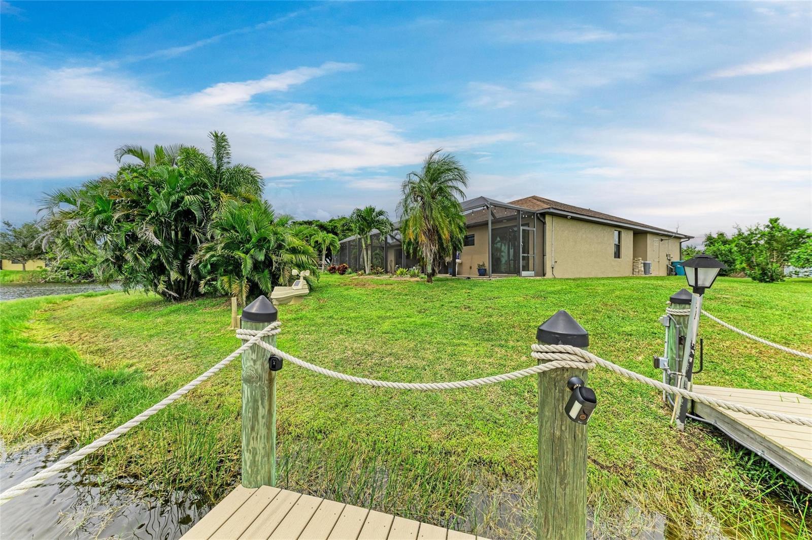 Welcome to this beautifully designed 3-bedroom plus office, 3-car garage home nestled along a corner tip lot with 153 feet of serene water frontage. This stunning waterfront home boasts direct, boatable canal frontage with mesmerizing views of intersecting waterways, offering the ultimate, resort style Florida living. Designed with both luxury and functionality in mind, the property features porcelain tile throughout and an aura of comfort and flexibility. The exterior caters to your relaxation featuring a heated saltwater pool with Jacuzzi seating, lanai with paver flooring, exterior lighting, and a rough-plumbed outdoor kitchen space—perfect for the creation of your tropical oasis. The Rainbird-controlled irrigation system draws from the canal to maintain lush, mature landscaping and striking palm trees that frame the home beautifully. The interior features a spacious great room welcoming you with a soaring 16-foot double tray ceiling adorned with elegant crown molding and rope lights for ambient lighting and 90-degree pocket sliders that lead into an open floor plan design. The dedicated office provides the ideal space for remote work or a quiet study. Impact resistant doors and windows throughout offer peace of mind, energy efficiency, and storm protection. Smart home technologies, including voice and app-controlled devices, and a monitored alarm system add comfort and security. The gourmet kitchen features rich wood cabinetry, granite countertops, a massive 4x10 island with pendant lighting, and plantation shutters throughout. The owner’s suite offers a serene retreat with an ensuite bath, while two guest bedrooms share a second bath that also serves the pool area. The dinette includes dual sliders for easy pool access. Per seller, additional features or updates include lanai speakers, spray foam insulation under roof deck, new 4-ton 16 Seer A/C in 2022, Culligan whole house filter/softener with reverse osmosis system under sink in 2022, new roof in 2023, and exterior house painted in 2025. The oversized 3 car attached garage provides plenty of room for vehicles, storage, or a workshop. Completing this exceptional property is a 10x16 Trex dock with water, electricity, and a covered 10K lift—your gateway to endless boating adventures throughout the community’s 55 mile canal system. Perfect for water lovers and boating enthusiasts, this property offers unparalleled access to the water with ample space for docking and enjoying the Florida lifestyle. Whether you're looking for your forever home or a luxurious retreat, this property blends comfort, style, and waterfront living in one exceptional package.