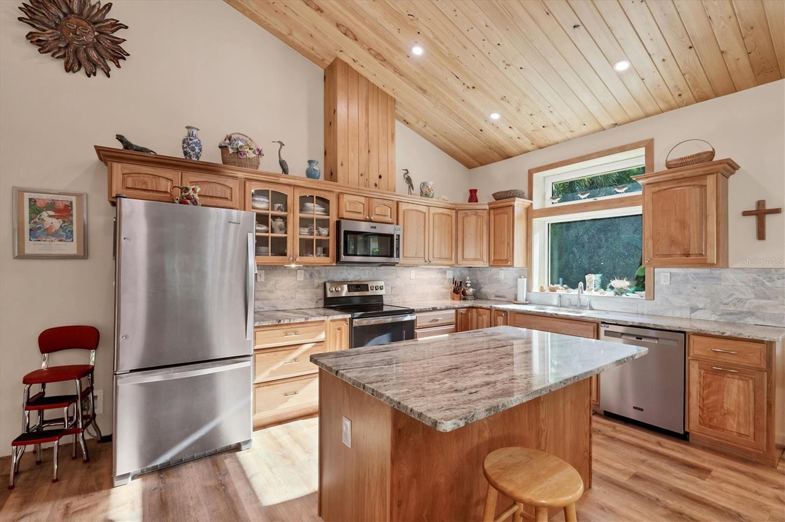 - Ceiling Fans(s), Central Vaccum, High Ceilings, Living Room/Dining Room Combo, Open Floorplan, Solid Surface Counters, Solid Wood Cabinets, Stone Counters, Thermostat