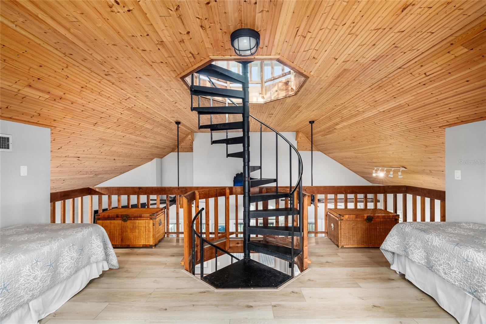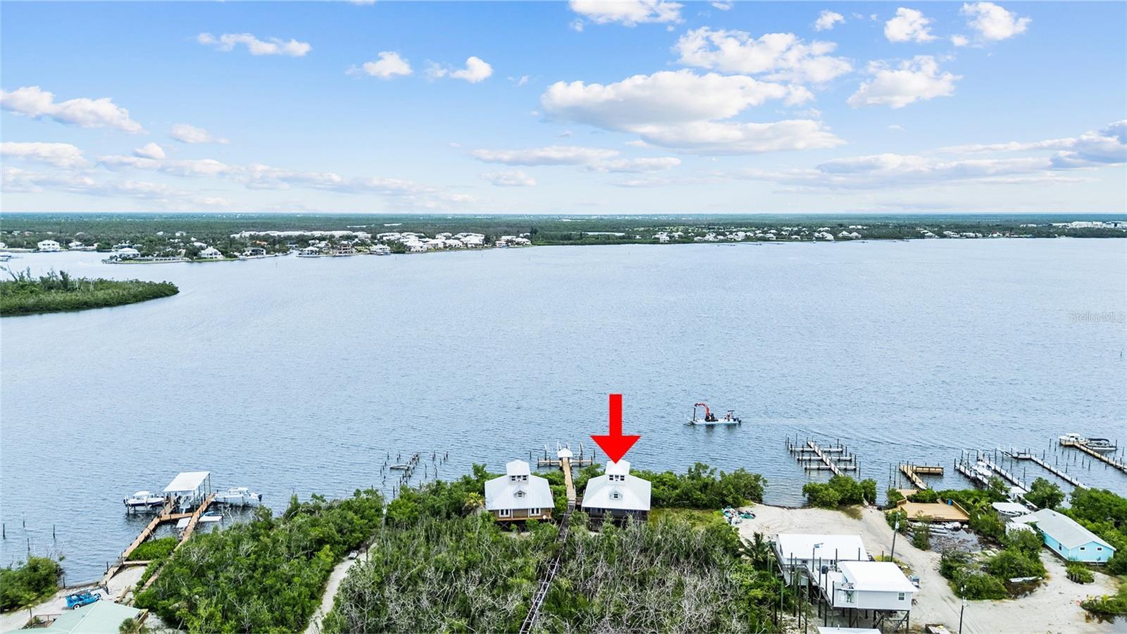This beautiful home is one of the iconic twin bayfront homes on Little Gasparilla Island, a bridgeless barrier island off the Cape Haze peninsula. A 10-minute boat ride brings you to the new shared boat dock with 10,000# boat lift. The home was updated in 2023, including a new roof, and comes furnished. On the first floor there are 2 bedrooms, 2 bathrooms, living room, kitchen, and laundry closet. The living room and kitchen are open and spacious with vaulted wood ceilings and three sets of French doors on the front of the house that lead out to the large screened in front porch that overlooks Placida Harbor. From there you can sit and watch the sunrise, see the boats go by, the dolphins and manatees swimming, and the birds diving for fish. In the living room there is an electric fireplace with a modern design. The updated kitchen has new soft close cabinets, glass tile backsplash, under counter lighting, stainless steel appliances, quarts countertops, and a large island with seating. Both bathrooms have new vanities with quarts counter tops, and new tile around the shower and tub. Both bedrooms have French doors that lead out to the covered, wrap-around deck. All the windows and doors are impact glass. The stackable, front load, washer and dryer are cleverly hidden behind a barndoor in the hall between the two bedrooms. Up the spiral staircase leads you to the loft, that is being used as a bedroom, with vaulted wood ceilings and a cozy nook that could be used as an office or reading space, and then further up the staircase you come to the 11’ x 21’ cupola that has shiplap walls, wood ceiling, and stunning views of the bay and the island and is also being used as a bedroom. The lot behind the home, which is almost 2 acres in size, is also for sale MLS #D6143898 and is where the shared septic system is located. The lot will need to be purchased with the home. Little Gasparilla Island doesn’t have any grocery stores, restaurants, or shops but we have 3 ½ miles of uncrowded beach to wander on and collect seashells and shark’s teeth, swim, or sit with a good book and soak up the sun. There is great fishing in the surrounding waters for redfish, snook, snapper, trout and more. By water there are many wonderful restaurants to cruise to. Then at the end of the day meet your friendly neighbors at the water's edge to watch the sun set on another blissful day in paradise. Come and see this lovely home and find out what it’s like to live on island time.