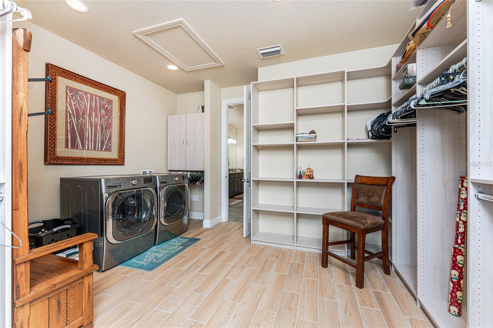 - Attic Ventilator, Built-in Features, Ceiling Fans(s), Central Vaccum, Eat-in Kitchen, High Ceilings, In Wall Pest System, Living Room/Dining Room Combo, Open Floorplan, Primary Bedroom Main Floor, Solid Surface Counters, Split Bedroom, Thermostat, Tray Ceiling(s), Vaulted Ceiling(s), Walk-In Closet(s), Window Treatments