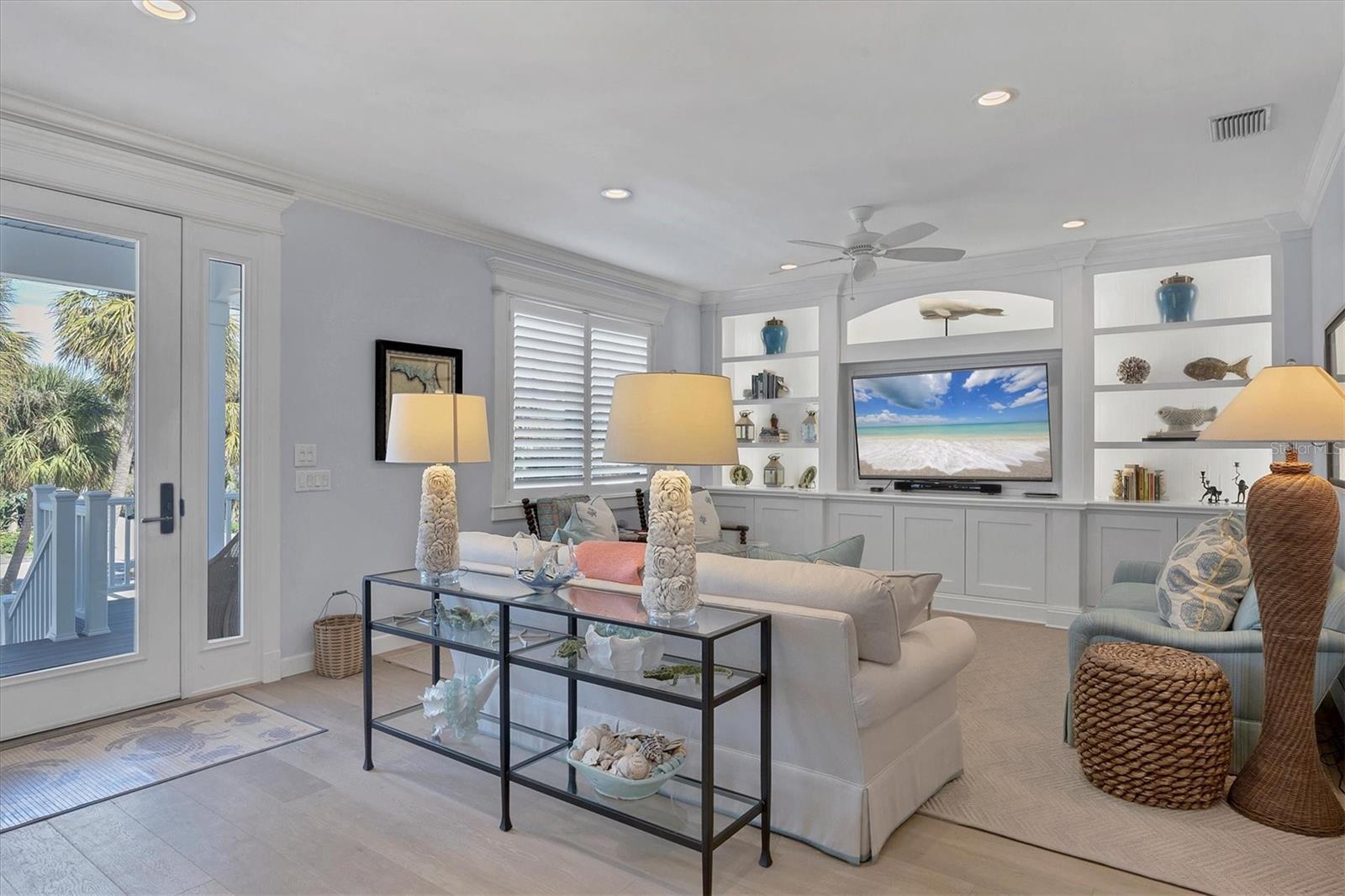 Perfectly located only steps to the beach and a quick bike ride to the village of Boca Grande! This thoughtfully renovated 3 bedroom, 3 1/2 bath pool home is completely updated inside and out and offered turnkey furnished! The large and inviting front porch has plenty of room for outdoor living with seating to enjoy a meal or the colorful sunsets! Built with hardi plank siding, all impact resistant windows and doors, and a newer (2002) metal roof! Enter and you will find wood floors throughout, a living room detailed with built-ins, and a large dining area. The kitchen features an island with seating for 4, gas stove, quartz countertops, tile backsplash, stainless steel appliances and a wine refrigerator. To enjoy the outdoors, there is a fenced and heated swimming pool area with an oversized pool deck offering open or covered seating areas. There is also plenty of open parking plus space under the house, as well as an enclosed golf cart garage! For the dog lover, this home is conveniently located near Lee County Park offering fenced dog parks. You can also enjoy the seasonal Boca Grande Famer’s Market, community tennis courts, and just a short walk to watch the spectacular sunsets on the Gulf waters beyond the Boca Grande range light built in 1927!