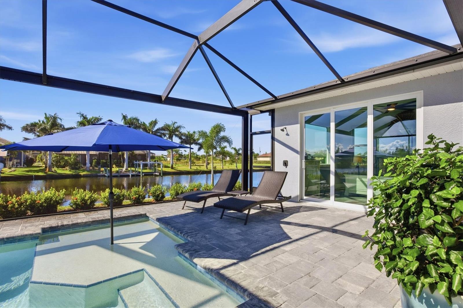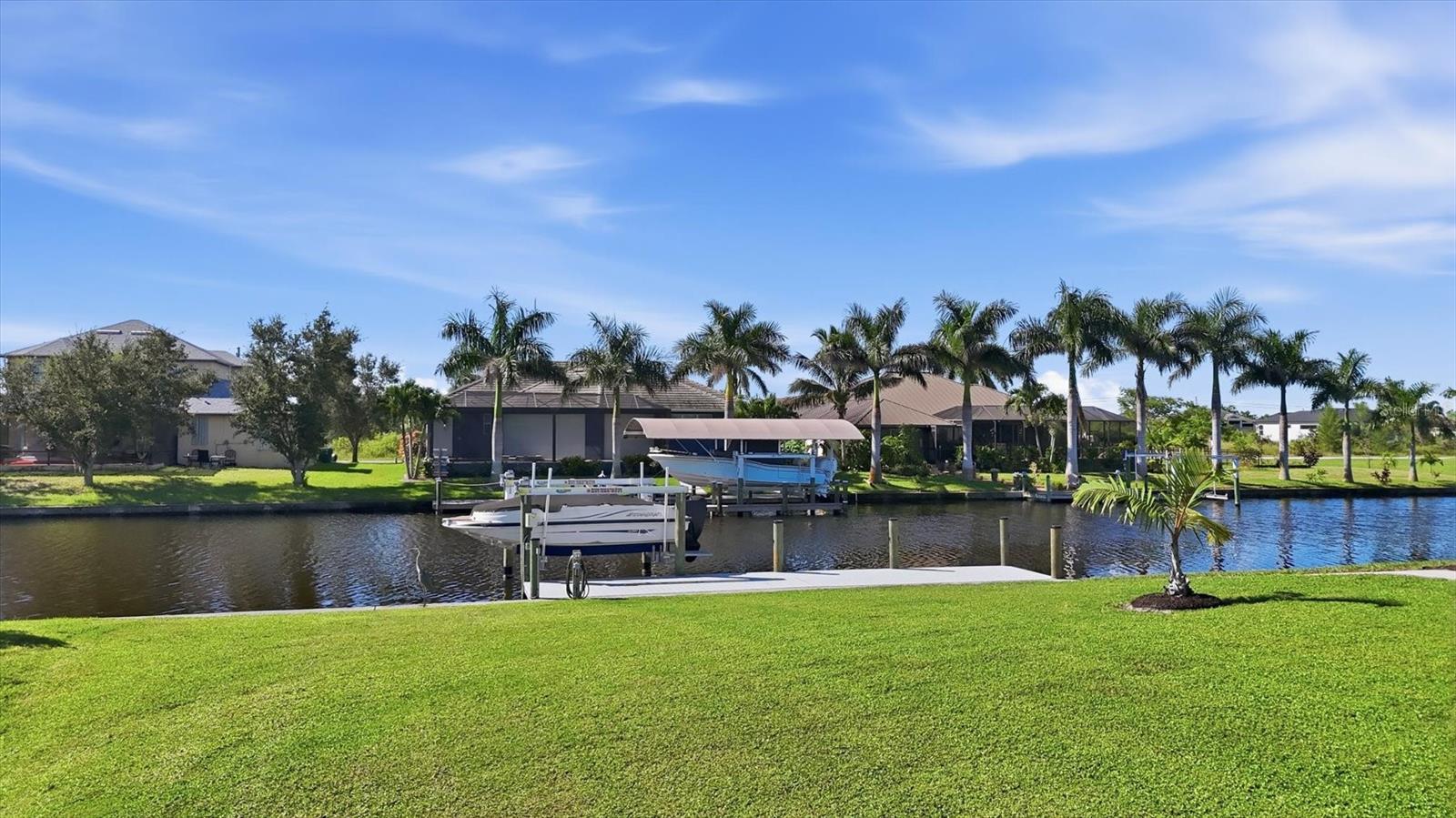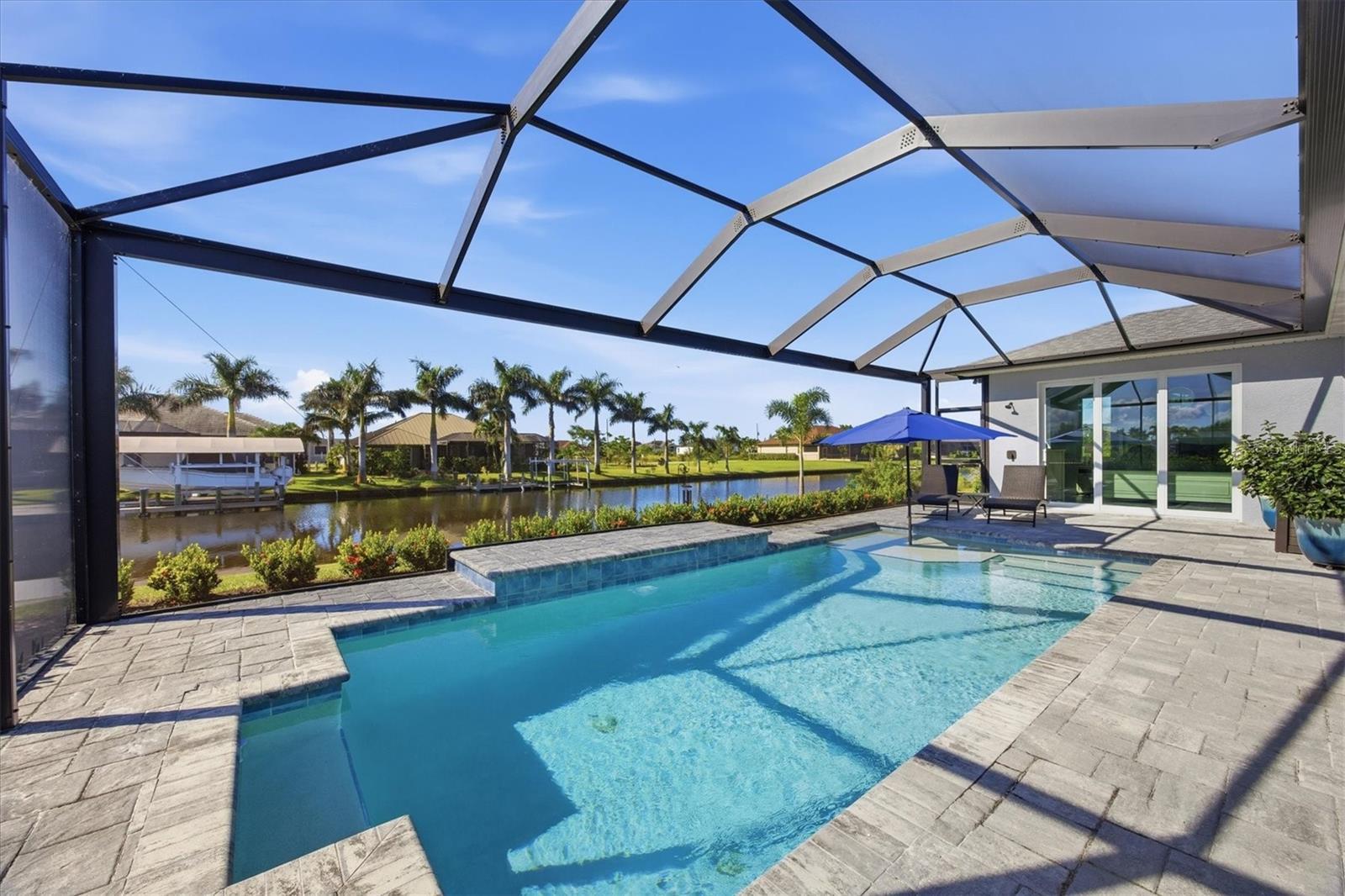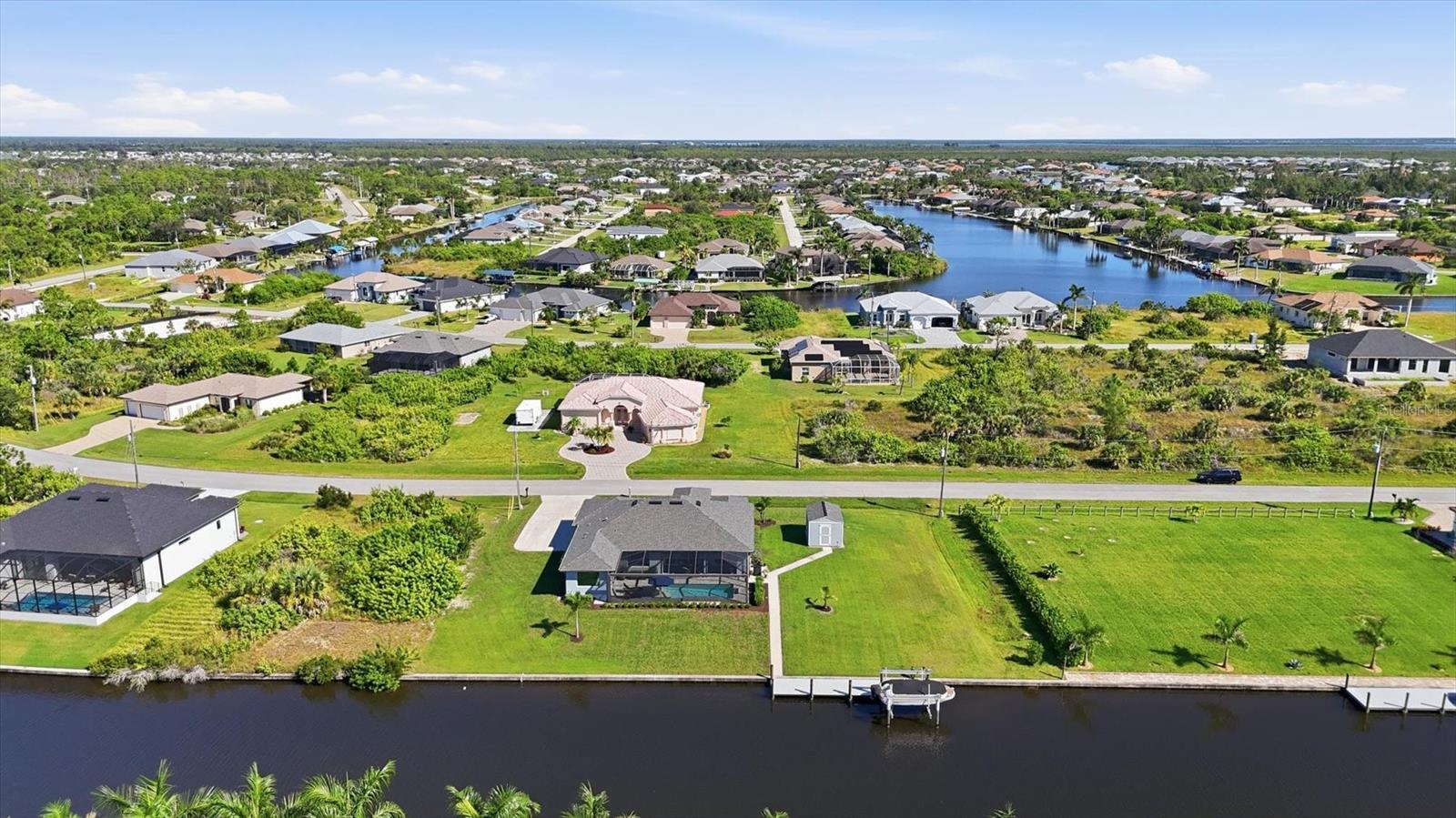 Double Waterfront Lot with 160ft of Seawall, 40ft Composite Dock, 10,000lb Boat Lift, Shed, Heated Pool, Impact Windows/Electric Roll Down Shutters, Custom-Built, and Fully Furnished! Welcome to your dream retreat in the sought-after waterfront community of South Gulf Cove! This fully furnished 3-bedroom + office, 2.5-bathroom home sits on a rare DOUBLE LOT combining elegance, comfort, and functionality. From the moment you arrive, you’re welcomed by lush landscaping and fresh sod that beautifully frame the impressive 160-foot property frontage. Step through the front door and be greeted by vaulted ceilings, stunning taupe plank tile flooring throughout, expansive 9-foot sliding glass doors, and an open living space featuring a cozy fireplace, all set against serene waterfront views. The chef’s kitchen is designed for both beauty and function, offering stone counters, custom soft-close cabinetry, stainless steel appliances, a large island with double-ended cabinetry, and a walk-in pantry. The dining room overlooks grand picture windows and opens seamlessly to the pool area through sliders, making entertaining effortless. The split floor plan ensures privacy for all. The primary suite is a peaceful retreat, featuring a large window overlooking the water, private sliders to the pool, and a spa-like bath with a stunning-tiled walk-in shower, dual vanities, and a spacious walk-in closet. Two additional bedrooms are filled with natural light and share a well-appointed guest bath. A dedicated office, finished laundry room, and oversized garage add convenience to everyday living. Outside, you’ll find a true Florida paradise. The pavered pool deck features a sparkling heated pool with a sun shelf and umbrella stand, a fountain, and ample space for lounging or entertaining. A poolside half bath makes outdoor living even easier. The secondary lot features a spotless 12x16 shed with a ramp, while a private sidewalk leads to the 8x40 dock, complete with water, electric, and a 10,000-pound boat lift. This setup is ideal for enjoying miles of canals with quick access to Charlotte Harbor, the Gulf of Mexico, and beyond. Located just minutes from sidewalks, a park, and beautiful walking paths, this home is within easy reach of world-class fishing, stunning beaches, pristine golf courses, shopping, and dining. Whether as a primary residence, seasonal escape, or turn-key investment, this waterfront home is the perfect blend of luxury and lifestyle.