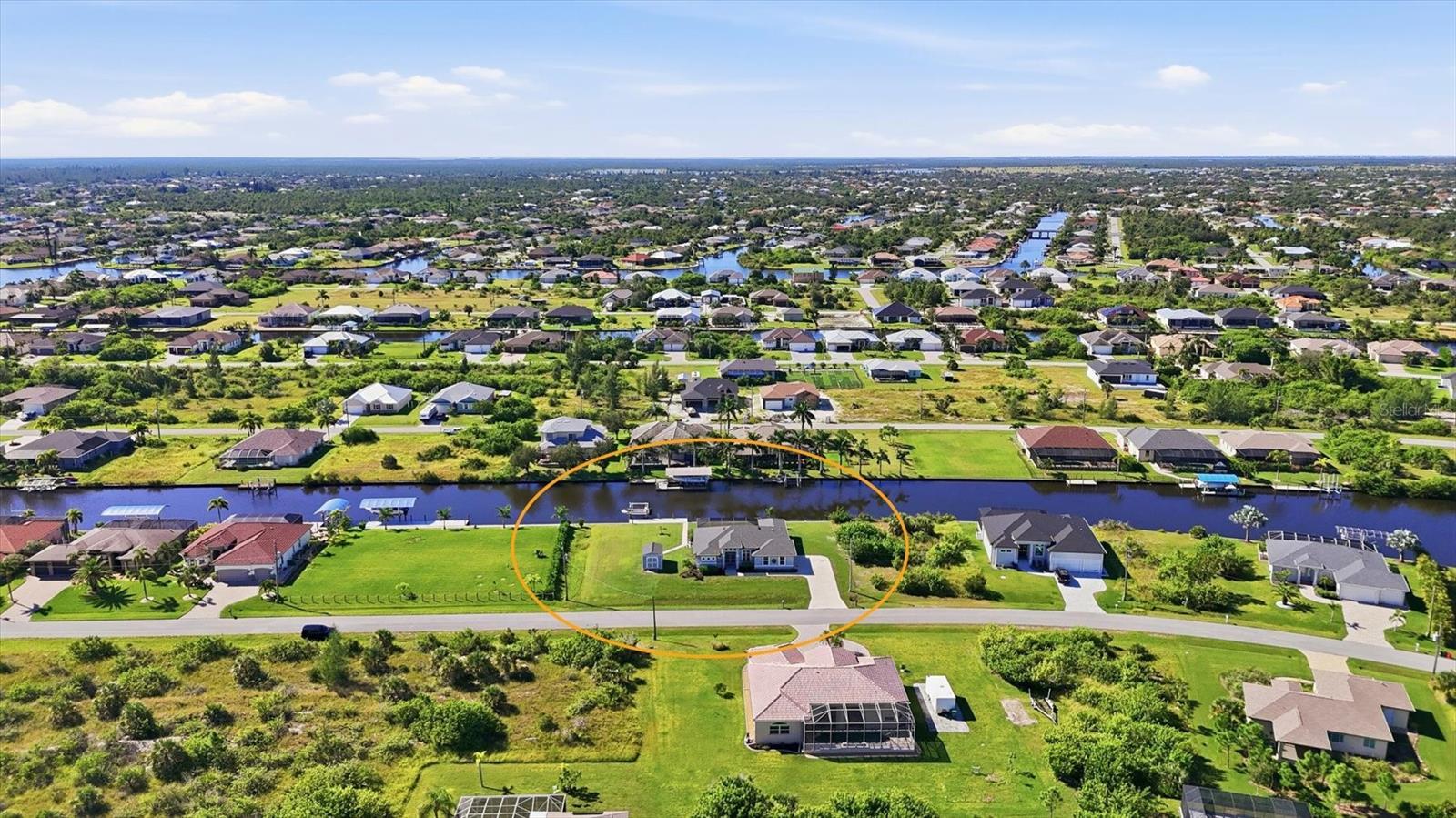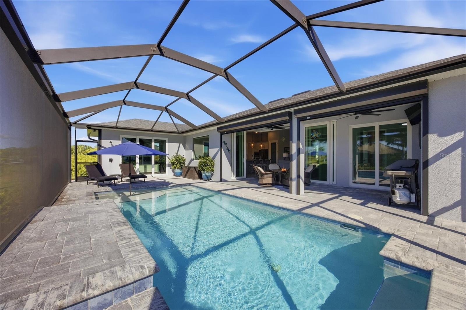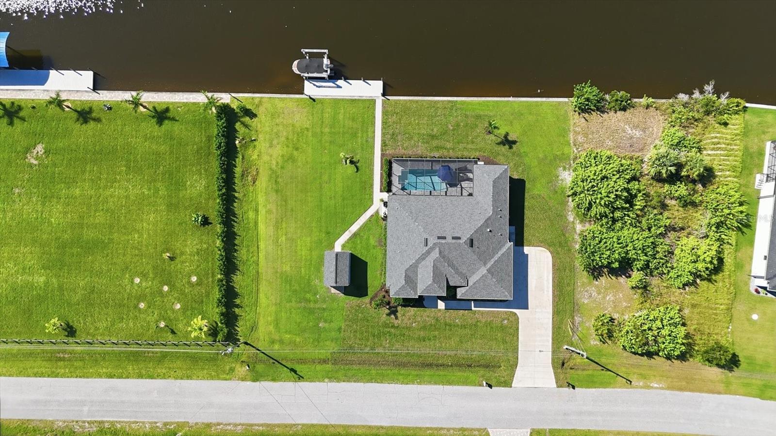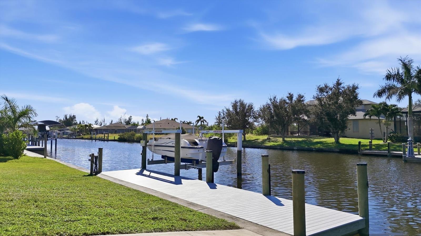 Double Waterfront Lot with 160ft of Seawall, 40ft Composite Dock, 10,000lb Boat Lift, Shed, Heated Pool, Impact Windows/Electric Roll Down Shutters, Custom-Built, and Fully Furnished! Welcome to your dream retreat in the sought-after waterfront community of South Gulf Cove! This fully furnished 3-bedroom + office, 2.5-bathroom home sits on a rare DOUBLE LOT combining elegance, comfort, and functionality. From the moment you arrive, you’re welcomed by lush landscaping and fresh sod that beautifully frame the impressive 160-foot property frontage. Step through the front door and be greeted by vaulted ceilings, stunning taupe plank tile flooring throughout, expansive 9-foot sliding glass doors, and an open living space featuring a cozy fireplace, all set against serene waterfront views. The chef’s kitchen is designed for both beauty and function, offering stone counters, custom soft-close cabinetry, stainless steel appliances, a large island with double-ended cabinetry, and a walk-in pantry. The dining room overlooks grand picture windows and opens seamlessly to the pool area through sliders, making entertaining effortless. The split floor plan ensures privacy for all. The primary suite is a peaceful retreat, featuring a large window overlooking the water, private sliders to the pool, and a spa-like bath with a stunning-tiled walk-in shower, dual vanities, and a spacious walk-in closet. Two additional bedrooms are filled with natural light and share a well-appointed guest bath. A dedicated office, finished laundry room, and oversized garage add convenience to everyday living. Outside, you’ll find a true Florida paradise. The pavered pool deck features a sparkling heated pool with a sun shelf and umbrella stand, a fountain, and ample space for lounging or entertaining. A poolside half bath makes outdoor living even easier. The secondary lot features a spotless 12x16 shed with a ramp, while a private sidewalk leads to the 8x40 dock, complete with water, electric, and a 10,000-pound boat lift. This setup is ideal for enjoying miles of canals with quick access to Charlotte Harbor, the Gulf of Mexico, and beyond. Located just minutes from sidewalks, a park, and beautiful walking paths, this home is within easy reach of world-class fishing, stunning beaches, pristine golf courses, shopping, and dining. Whether as a primary residence, seasonal escape, or turn-key investment, this waterfront home is the perfect blend of luxury and lifestyle.