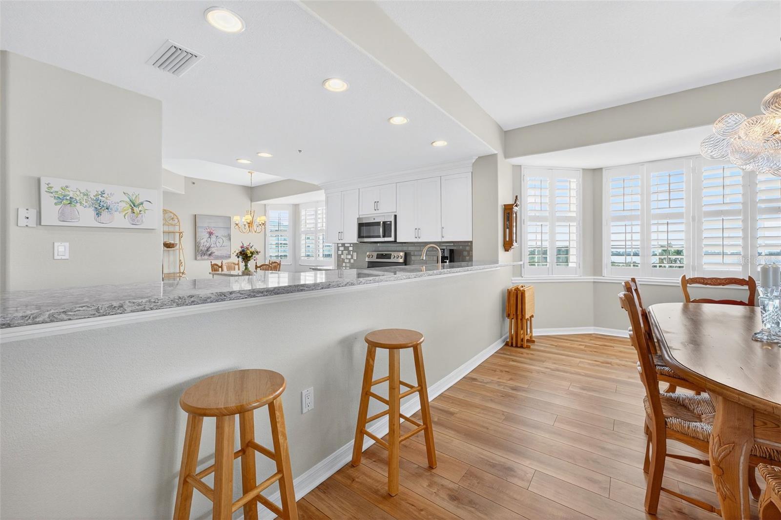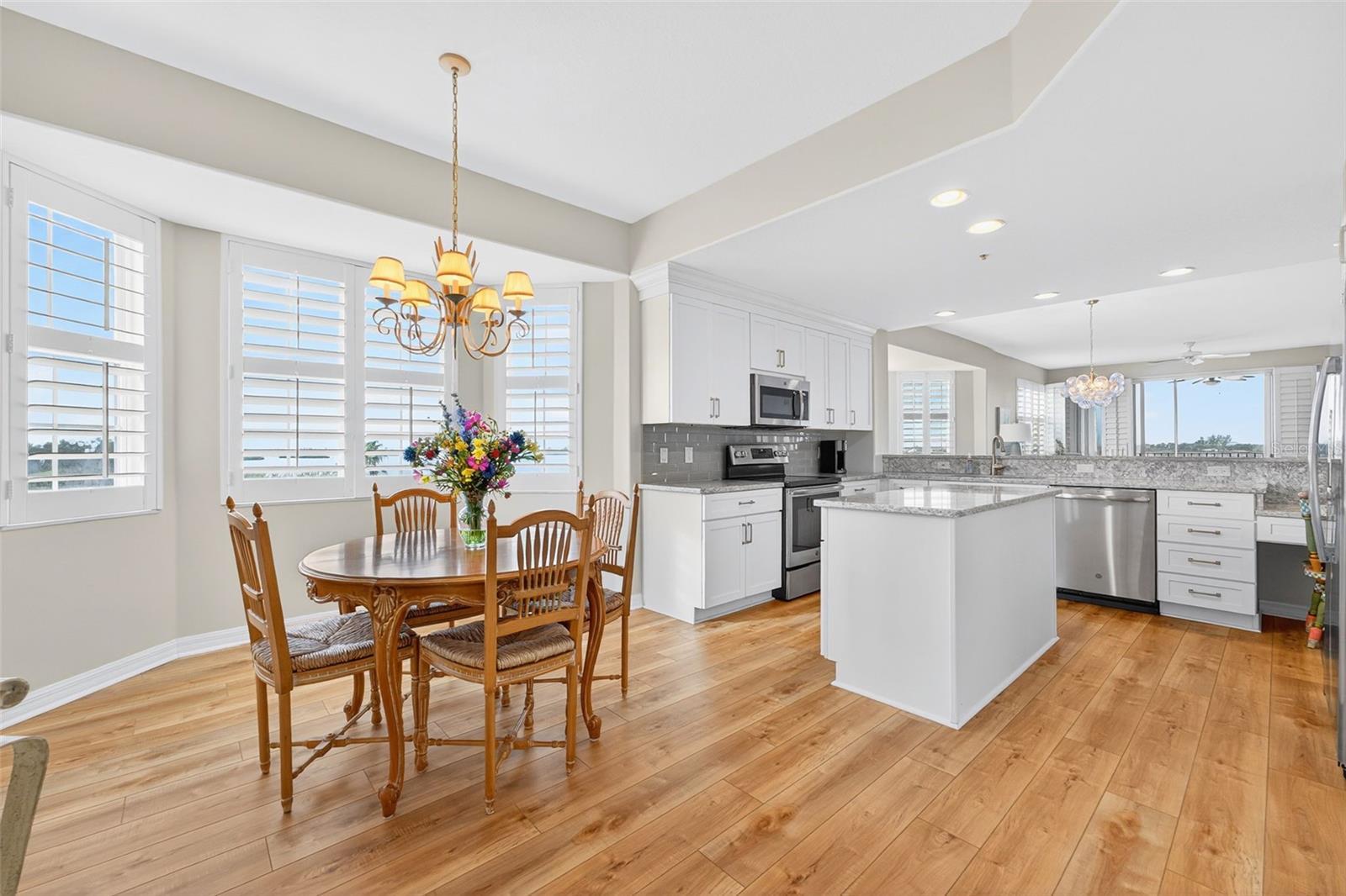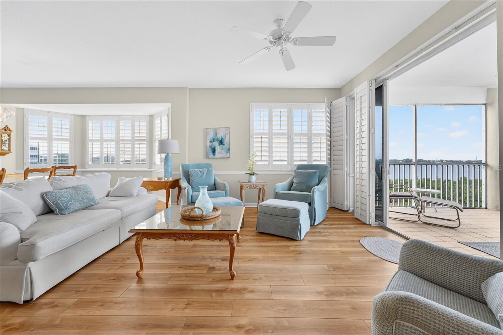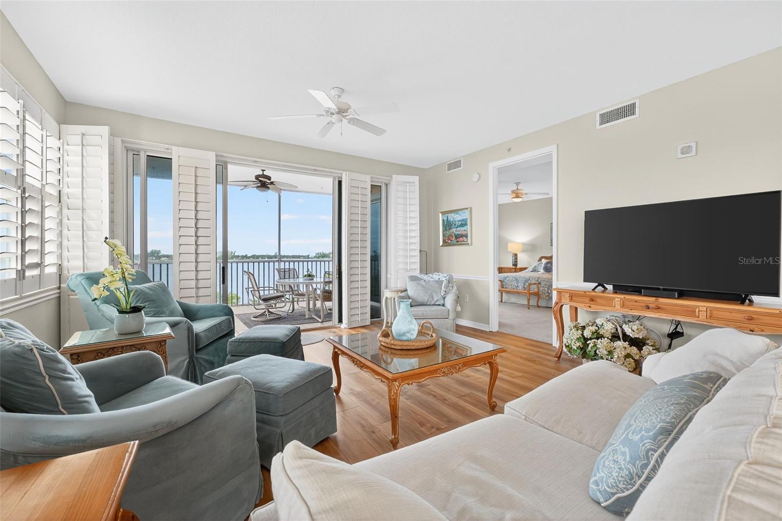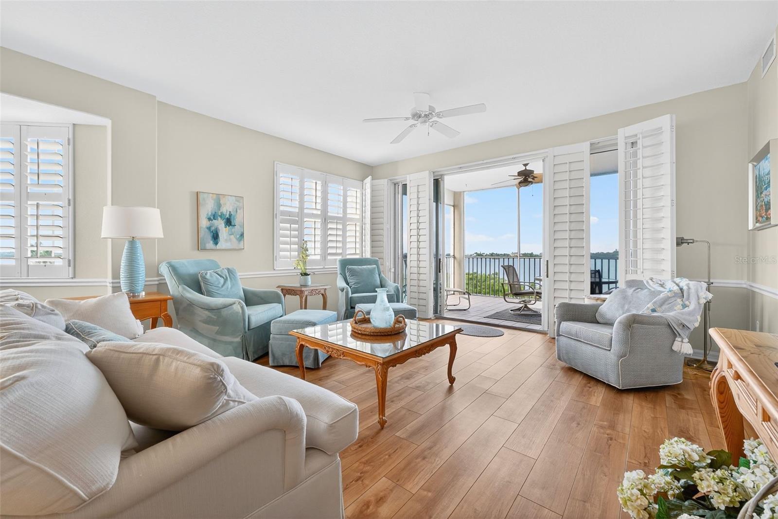 END UNIT with RARE THREE CAR GARAGE, IMPACT WINDOWS AND SLIDERS, and sweeping panoramic views. This beautifully appointed Baypointe Vista condo in Osprey blends comfort, style, and convenience, all set against the backdrop of the Intracoastal Waterway and Little Sarasota Bay. Natural light pours through wide water view windows, while plantation shutters throughout add timeless coastal charm and privacy. The gourmet kitchen offers white cabinetry, granite countertops, stainless steel appliances, and a spacious island perfect for entertaining with the bay as your backdrop. The open floor plan flows into the living and dining areas and onto the enclosed porch, where 180 degree views of Casey Key and the sparkling bay create a breathtaking focal point. Both oversized bedrooms are en suite with generous walk in closets. The primary suite features dual closets, tranquil water views, and a spa inspired bath with jetted tub, double vanity, and makeup counter. The guest suite has its own private entrance, walk in closet, and full bath. This residence is offered turnkey furnished and ready for immediate enjoyment. Additional highlights include luxury laminate floors, recessed lighting, a spacious laundry room with cabinetry and sink, impact windows and sliders, and the oversized three car garage which is a rare and valuable feature. Baypointe Vista is a gated resort style community with a pool, fitness center, tennis and pickleball courts, fishing pier, kayak launch and storage, tiki bar, and an active social calendar. HOA fees cover cable, internet, water, and sewer. Ideally located between Sarasota and Venice, you are just minutes from Gulf beaches, shopping, dining, golf, medical facilities, and Pine View School. Experience turnkey coastal living with panoramic water views, elegant plantation shutters, and the convenience of a rare three car garage and impact windows and sliders. Schedule your private showing today.