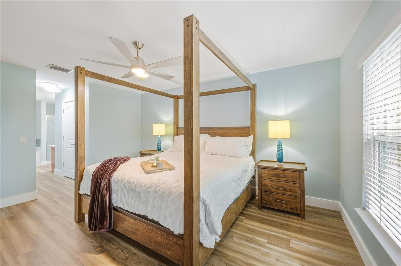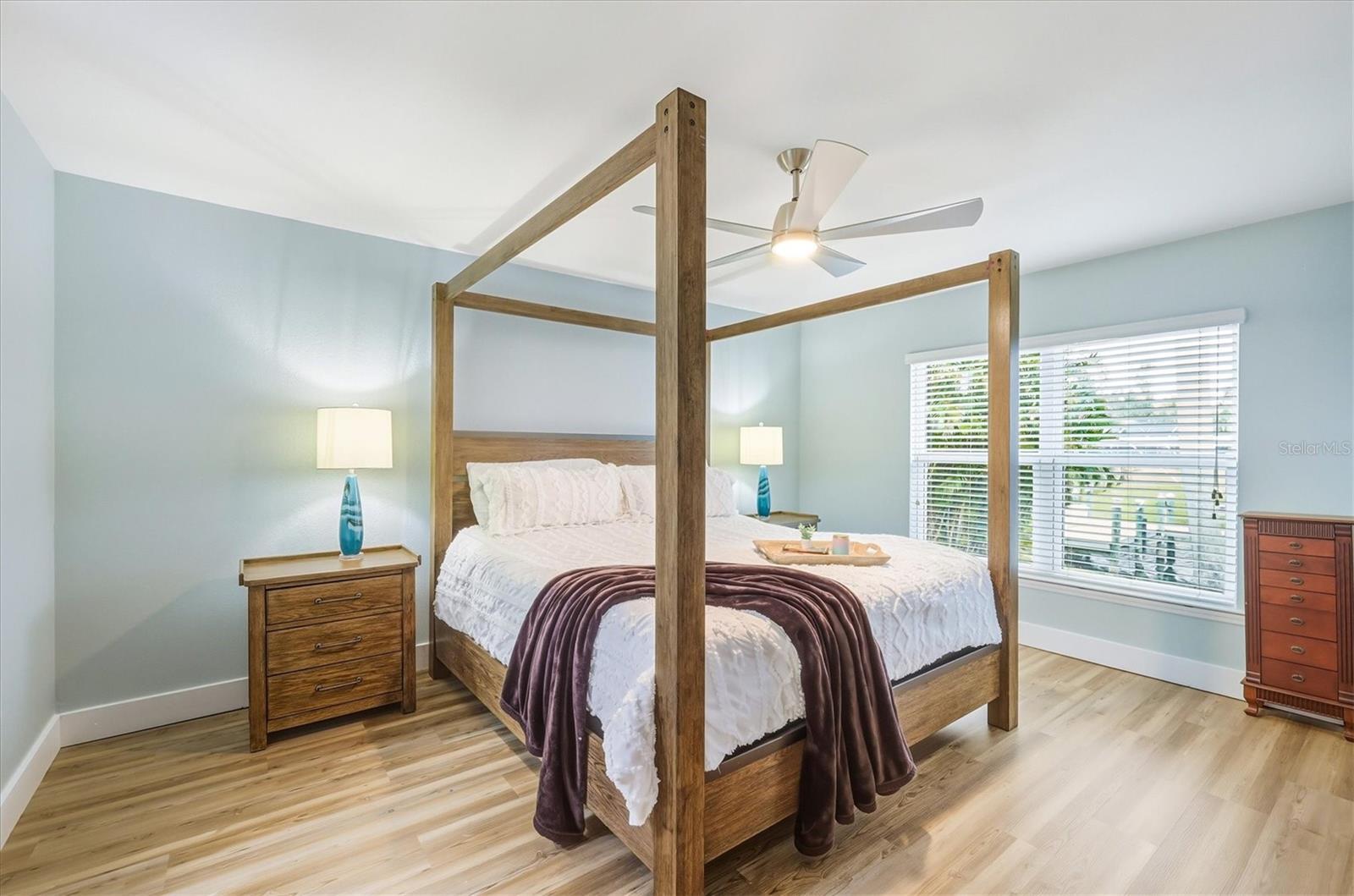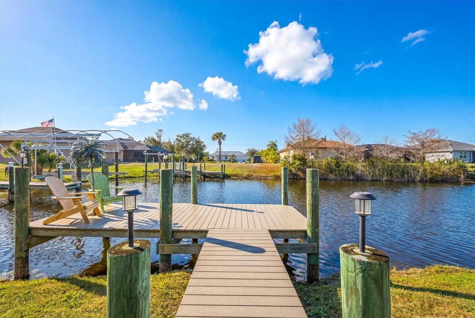 Completely reimagined and meticulously renovated, this waterfront residence presents as an entirely new home, where refined design, modern finishes, and serene canal views come together to create an exceptional coastal retreat. Significant improvements include a new roof (2023), fresh interior paint throughout, and luxury vinyl plank flooring installed in 2025. The screened lanai features a new pool enclosure, while the expanded laundry room offers a utility sink and direct access to the two-car garage, adding both function and convenience. The kitchen stands as a striking focal point of the home, curated for both everyday living and elevated entertaining. It features new upgraded cabinetry, all-new appliances (2025), and a dramatic oversized quartz island measuring approximately 15 feet by 4.5 feet. A statement Lefton multi-function sink with custom water controls adds a refined touch. Gas cooking is supported by an on-site propane tank and a pot filler above the range. Hidden behind a sliding barn door, a striking custom pantry wall features expansive shelving and curated lighting, thoughtfully designed to reveal a concealed coffee bar, an elevated detail that speaks to craftsmanship and intention. Upon entry, canal views set an immediate sense of calm and connection to the outdoors. Just off the foyer, a formal dining area is accented by a statement chandelier, while a custom bonus room on the opposite side features a floor-to-ceiling built-in library wall with a rolling ladder, an exceptional space for a private office, study, or flex room. An additional room located near the pantry and laundry offers further versatility as a guest room or secondary office. The living area anchors the center of the home, framed by expansive windows that overlook the lanai and water beyond. At the rear of the residence, two guest bedrooms and a shared bath are positioned on one side, while the primary suite enjoys privacy on the other. The shared bath has been fully renovated, featuring new quartz countertops and updated sinks. The primary bedroom offers direct lanai access, dual walk-in closets, and a fully renovated en suite bath showcasing new vanities, sinks, quartz countertops, updated lighting, and new flooring. Outdoor living is equally compelling, featuring a heated pool with attached spa. Beyond the screened lanai, a composite dock with electricity, pre-wired for a boat lift, extends along the canal and includes a flagpole and canal-fed irrigation system. This is a rare opportunity to own a meticulously renovated waterfront home where the most significant upgrades have already been completed, offering refined interiors, thoughtful design, and an exceptional outdoor lifestyle.