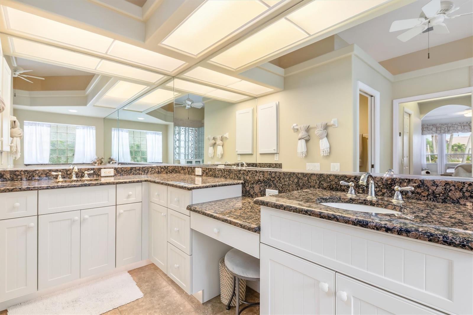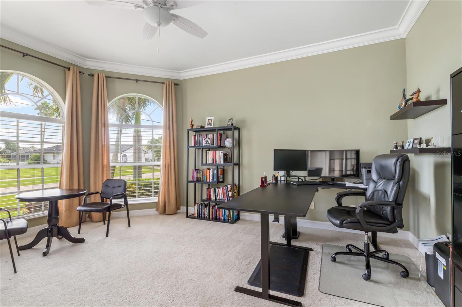 - Built-in Features, Ceiling Fans(s), Crown Molding, Eat-in Kitchen, High Ceilings, Living Room/Dining Room Combo, Open Floorplan, Primary Bedroom Main Floor, Solid Surface Counters, Solid Wood Cabinets, Split Bedroom, Thermostat, Tray Ceiling(s), Vaulted Ceiling(s), Walk-In Closet(s), Window Treatments