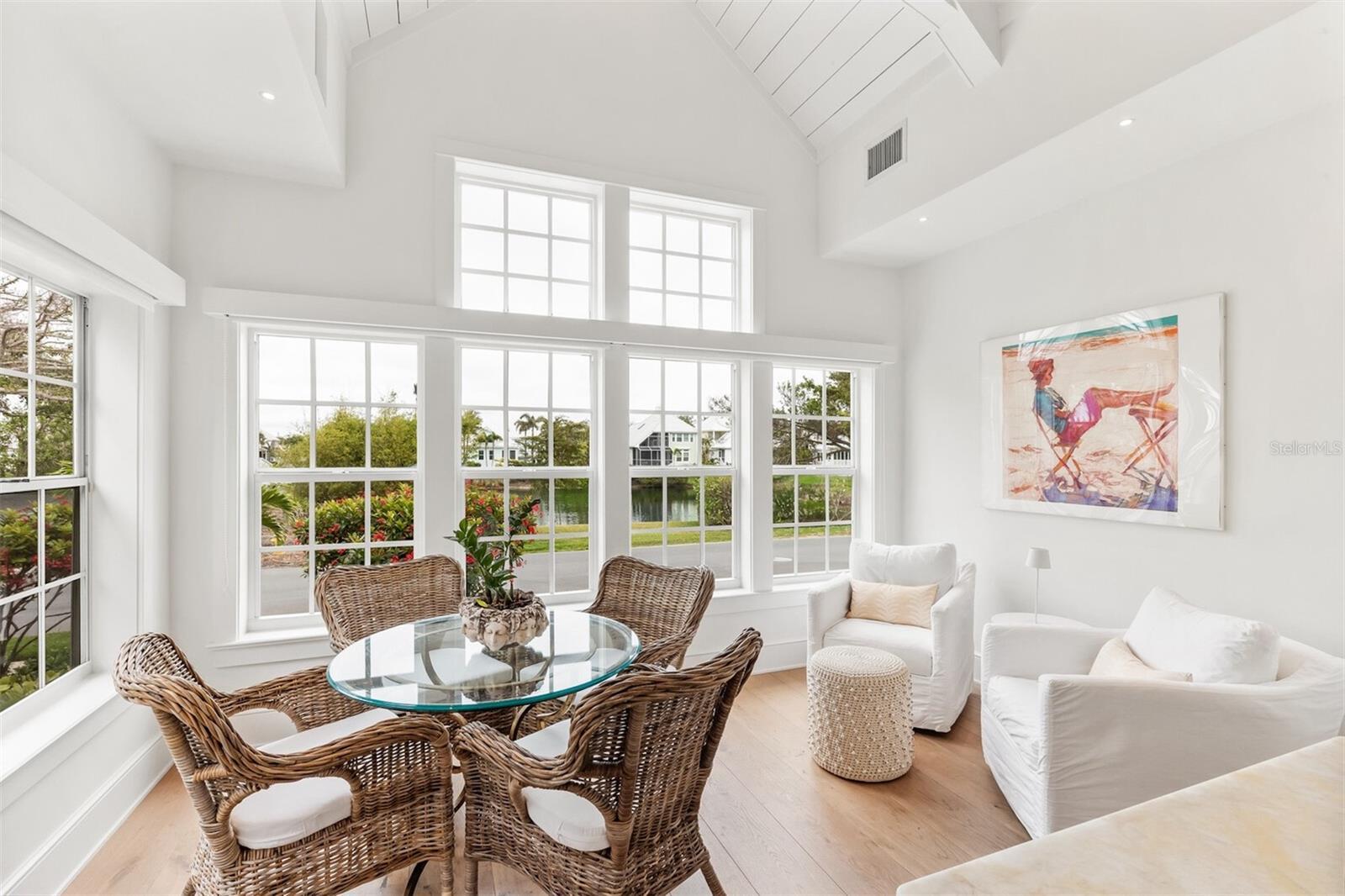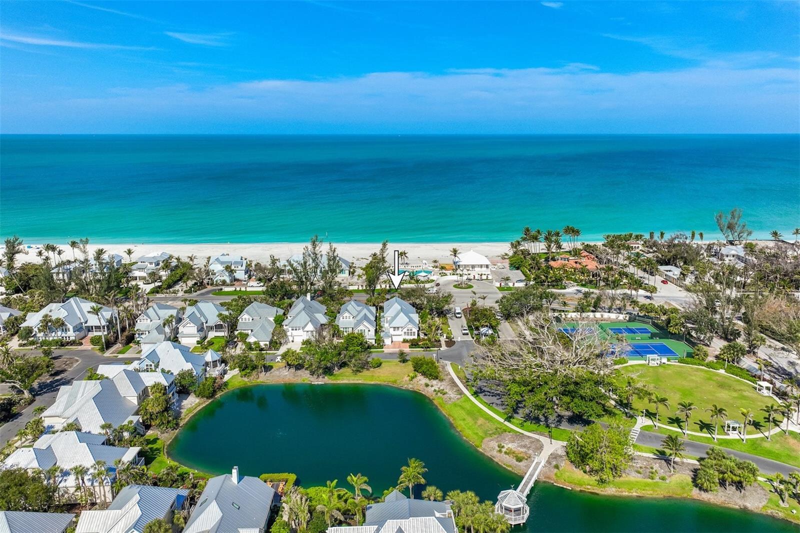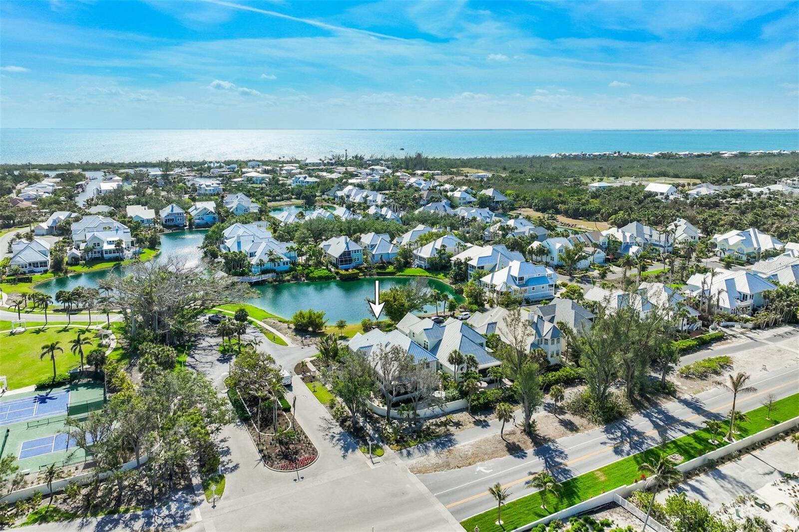 This stunning lake-view corner lot oasis is nestled in the esteemed North Village neighborhood of just 69 residences in the gated Boca Bay Community. You are just a short walk away from both the beaches of the Gulf of Mexico and the charming shops and restaurants in the Village of Boca Grande. Enjoy the luxury of private parking while close to town and directly across the street from the private beach club pool. This completely remodeled home transformed through renovations by Safety Harbor Construction features 4 spacious bedrooms, 4.5 bathrooms and over 3,000 sq. ft. of living space, making it ideal for entertaining. As you enter you'll be greeted by an open-concept living area that is thoughtfully designed to embrace the natural light highlighting the beautiful wide plank engineered-hardwood floors, shiplap walls, vaulted exposed-beam ceilings and elegant finishes throughout. The glass impact sliders off the living room open to your private screened patio overlooking lush landscaping, where you can enjoy serene views of the gulf from across the street. The gourmet kitchen is a chef's dream, equipped with high-end appliances, Christoff countertops, open beam ship lap ceiling, double stainless-steel sink, and custom cabinetry with ample space for all your culinary needs. Also includes an adjoining breakfast area with a wall of windows welcoming the morning light. The layout of this multi-level home is both spacious and inviting. The main level primary en-suite offers built-in closet/cabinetry, two single vanities and a walk-in shower. The second level offers an en-suite bedroom/bathroom. Ascend to the 3rd level to find a sitting/entertainment area, second primary ensuite with a walk-in shower, soaking tub and dual vanities. Also, includes a laundry room with sink and storage. Residents of Boca Bay have access to exclusive amenities, including a membership to the Boca Bay Pass Club that includes a beach front grill room, private formal dining room and a casual pool side bar, 4 community swimming pools, an active tennis program with tennis pros, pro shop and 8 Har-Tru courts, additional courts for pickle ball, a fishing pier, and boat slips for short term dock-age. With its prime location and exquisite design, this home is truly a gem.