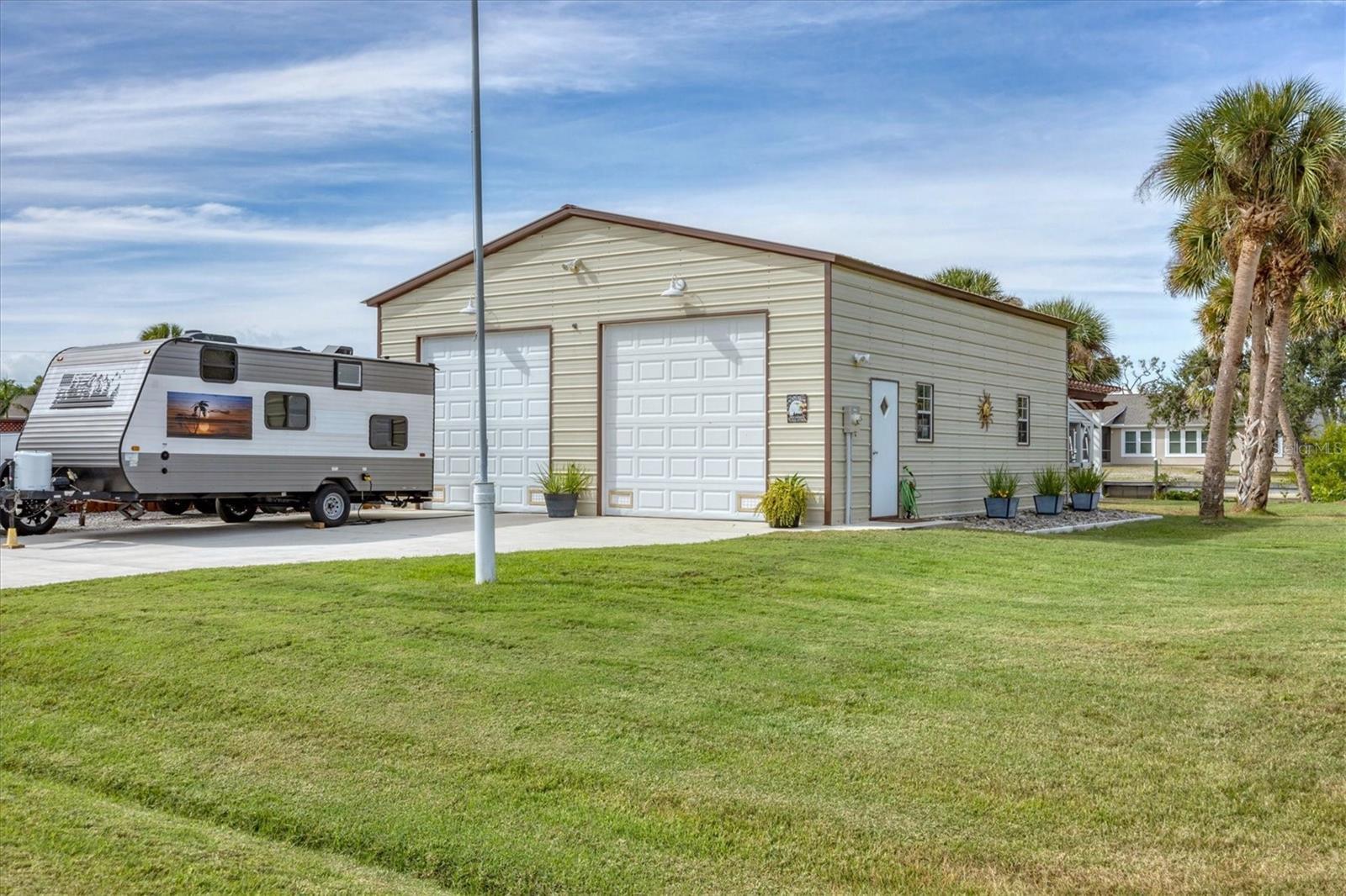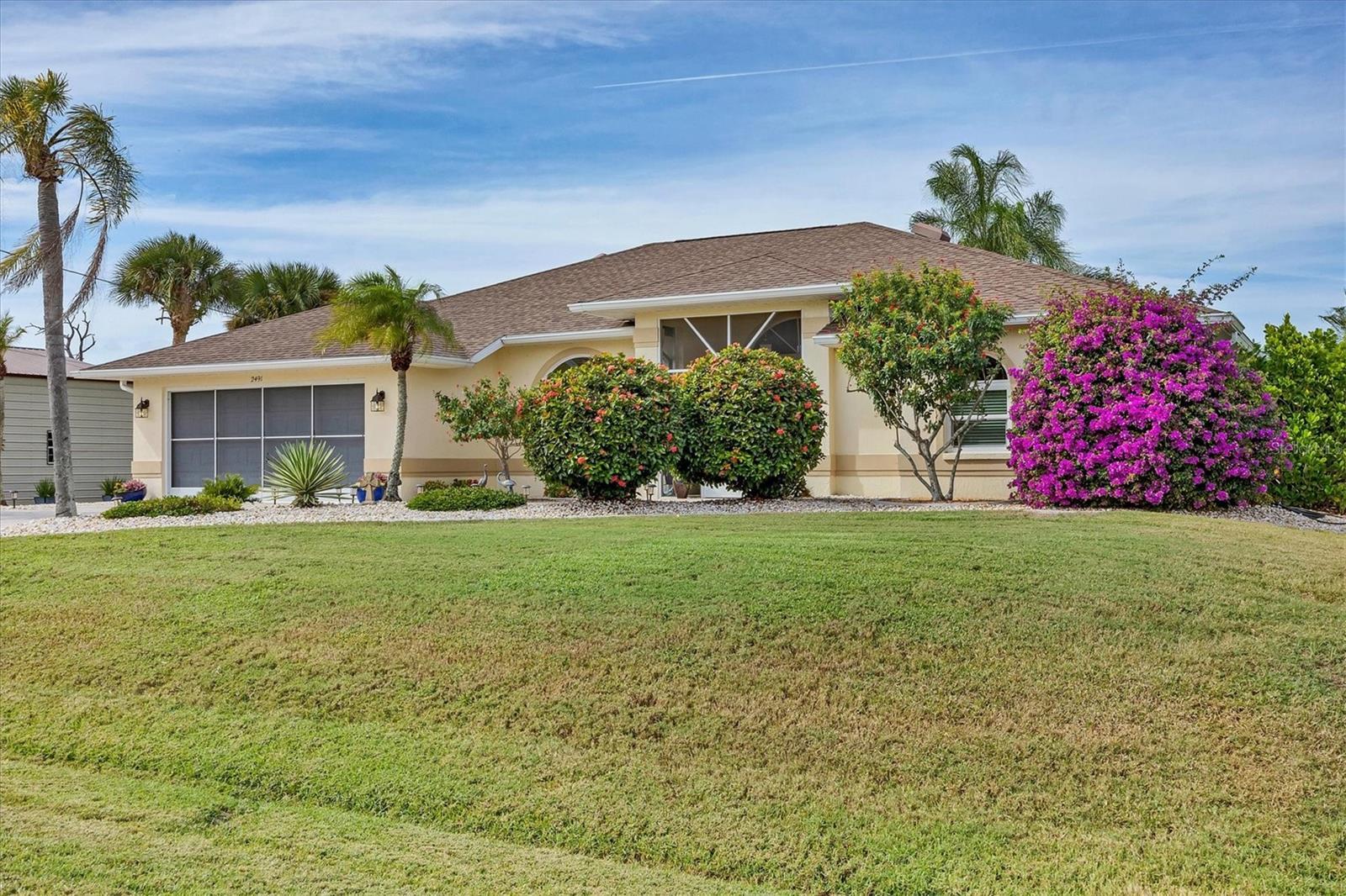 This move in ready 3 bedroom, 2 bath, 2 car garage home is a rare waterfront treasure in Gulf Cove, a sought after boating community with direct Gulf access. Beyond its impressive outdoor amenities, the home showcases a gorgeous designer interior with soaring ceilings, abundant natural light, and refined finishes throughout. The expansive chef’s kitchen is a true showpiece, offering granite countertops that stretch across a massive island, extensive prep space, newer stainless steel appliances, and generous cabinetry—perfect for cooking, gathering, and entertaining in style. Set across two beautifully landscaped waterfront lots totaling nearly half an acre, the property offers exceptional privacy and peaceful views along 160 feet of direct waterfront. Outdoor living shines with two extended screened patios, a luxurious spa, and a fully equipped outdoor kitchen complete with a sink, hood, grill, and striking stone counters with stone trim. The grounds are meticulously maintained with concrete curbing, lush greenery, and a charming pergola ideal for unwinding beneath the stars. Elegant pavers enhance the front driveway and walkway, while the rear patios feature a polished blend of pavers and tile. Boaters will appreciate the tastefully lit composite dock with water and electric and a 10,000 lb covered boat lift ready for your next adventure. A standout feature of the property is the 1,050 sq ft hurricane rated detached steel garage, built to withstand 170 mph winds and outfitted with two 10x10 doors, 6" closed cell spray foam insulation, its own concrete driveway, and a river stone parking pad—ideal for hobbyists, car collectors, or serious storage needs. Additional upgrades include a 2020 roof, brand new 2024 A/C, impact resistant windows and doors, an irrigation system, and a whole home generator powered by a 500 gallon built in propane tank. Inside, the split floor plan offers updates, comfort and functionality, with tile and engineered hardwood flooring, granite surfaces throughout, and a spacious primary suite with walk in closet and ensuite bath. Whether you're hosting lively gatherings or savoring quiet waterfront sunsets, this exceptional property blends elegance, comfort, and true coastal living into one complete package.