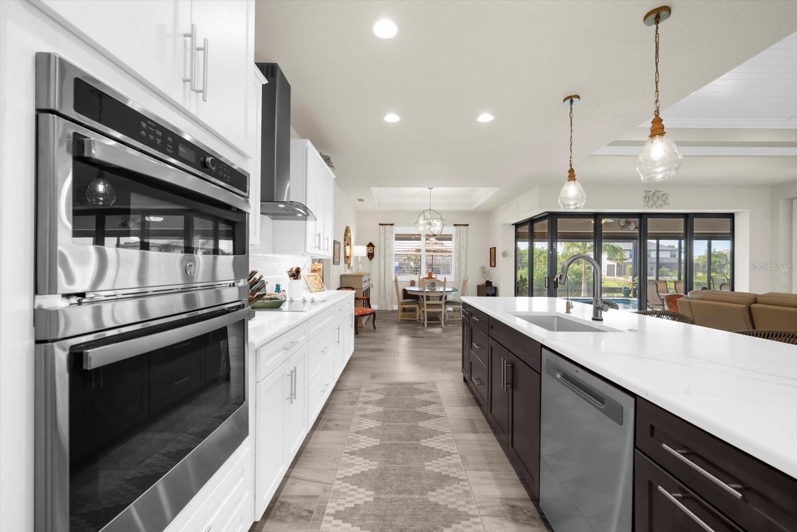 This immaculate 3-bedroom, 3-bathroom, 3-car garage home sits on a seawalled canal lot and is packed with high-end upgrades and coastal-inspired finishes throughout. From the moment you step inside, you’re welcomed by a designer feature wall, shiplap ceilings, and an expansive open floor plan that blends luxury, comfort, and waterfront living. The upgraded kitchen is a true showstopper, featuring custom soft-close cabinetry, 10 10-foot island with Calacutta quartz top, tile backsplash, under-cabinet outlets and lighting, GE Profile appliances, coastal-style doors, and a dry bar ideal for entertaining. The elegant dining room flows seamlessly into the great room, complete with zero-degree sliders that open fully to the pool and canal, creating a breathtaking indoor-outdoor experience. Enjoy crown molding throughout, plantation shutters, and beautiful framed mirrors in every bathroom. The primary suite is a peaceful retreat with two spacious walk-in closets, sliding doors leading directly to the lanai, and a spa-inspired bathroom featuring a rainfall shower, a beautiful niche with seating, double vanities, and a linen closet. The guest bedrooms are equally impressive; one offers a walk-in closet and an en-suite with a gorgeous tile shower, while the second guest bath features a large vanity and tub. All bathrooms are equipped with comfort-height toilets and Calacutta quartz throughout. Step outside to your private oasis: a heated saltwater PebbleTec pool with sunshelf and bubbler, surrounded by an upgraded clear-view screen for uninterrupted water vistas. The home's rear and front doors are equipped with electric roll-down shutters, in addition to the impact windows and doors throughout. The outdoor living area includes an outdoor kitchen, a secondary covered lanai off the guest suite (doubling as a convenient pool bath space), and tongue-and-groove ceilings on both front and back porches. Boaters will love the 8x30 composite dock complete with water, electric, Dok Lites, a remote-operated lift, canopy, and lighting. The beautifully landscaped yard includes royal palms along the water, Eureka palms for privacy, concrete curbing with stone, up-lighting, and irrigation with city water. Additional features include a tile roof, spray foam insulation, an insulated upgraded garage door, an epoxy-coated garage floor, overhead garage storage, custom closets throughout, a finished laundry room with cabinets and sink, a 30 Amp outlet in the garage, pre-wired whole-home filtration with a 6x5 concrete pad, and an insulated shed with custom shelving. The homeowner spared no expense; every detail of this home reflects quality and attention to detail. Located just minutes from beaches, golf, dining, shopping, and all that South Gulf Cove offers, with quick access out by water through one bridge, this is coastal Florida living at its finest.