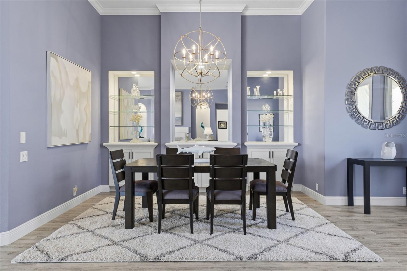 - Ceiling Fans(s), Crown Molding, Eat-in Kitchen, High Ceilings, Kitchen/Family Room Combo, Living Room/Dining Room Combo, Primary Bedroom Main Floor, Solid Surface Counters, Solid Wood Cabinets, Split Bedroom, Walk-In Closet(s), Window Treatments