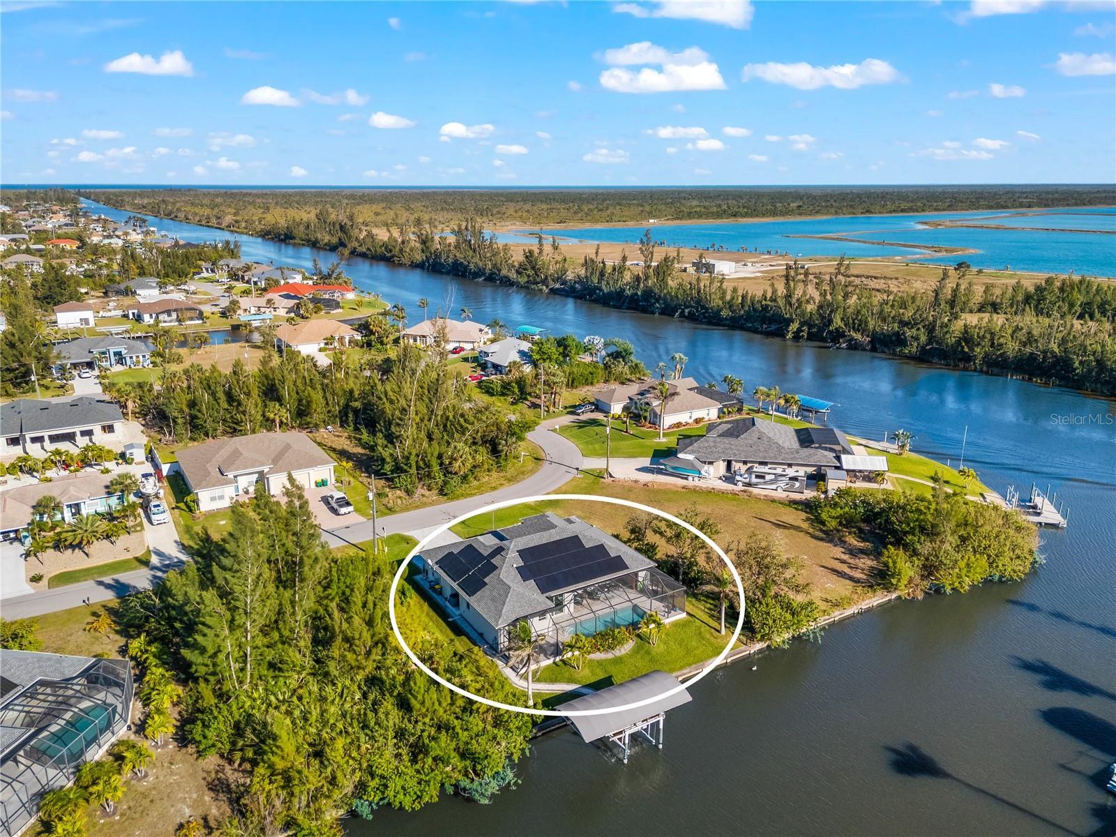 Live the Florida Dream! This stunning custom-built waterfront home offers 80 feet of SAILBOAT-access water with a concrete seawall, composite dock, and 10,000 lb boat lift with canopy, providing direct access to open water and breathtaking sunsets. Inside, enjoy a bright open split floor plan with a chef’s kitchen featuring a large center island, soft-close cabinetry, under-cabinet lighting, and designer finishes. Zero-degree corner pocket sliders create seamless indoor-outdoor living. The screened lanai features a heated saltwater pool and electric roll-down hurricane shutters. The primary suite offers peaceful water views, a walk-through shower, dual vanities, and walk-in closets, with guest bedrooms privately located on the opposite side. Additional premium features include impact windows and doors, spray foam insulation, (owned) solar panels powering the home for very low electric bills, and an oversized 3-car garage. The fully fenced, tropical landscaped yard includes a full irrigation system. Just minutes to beaches, golf, shopping, and dining—this is Florida waterfront luxury at its finest.