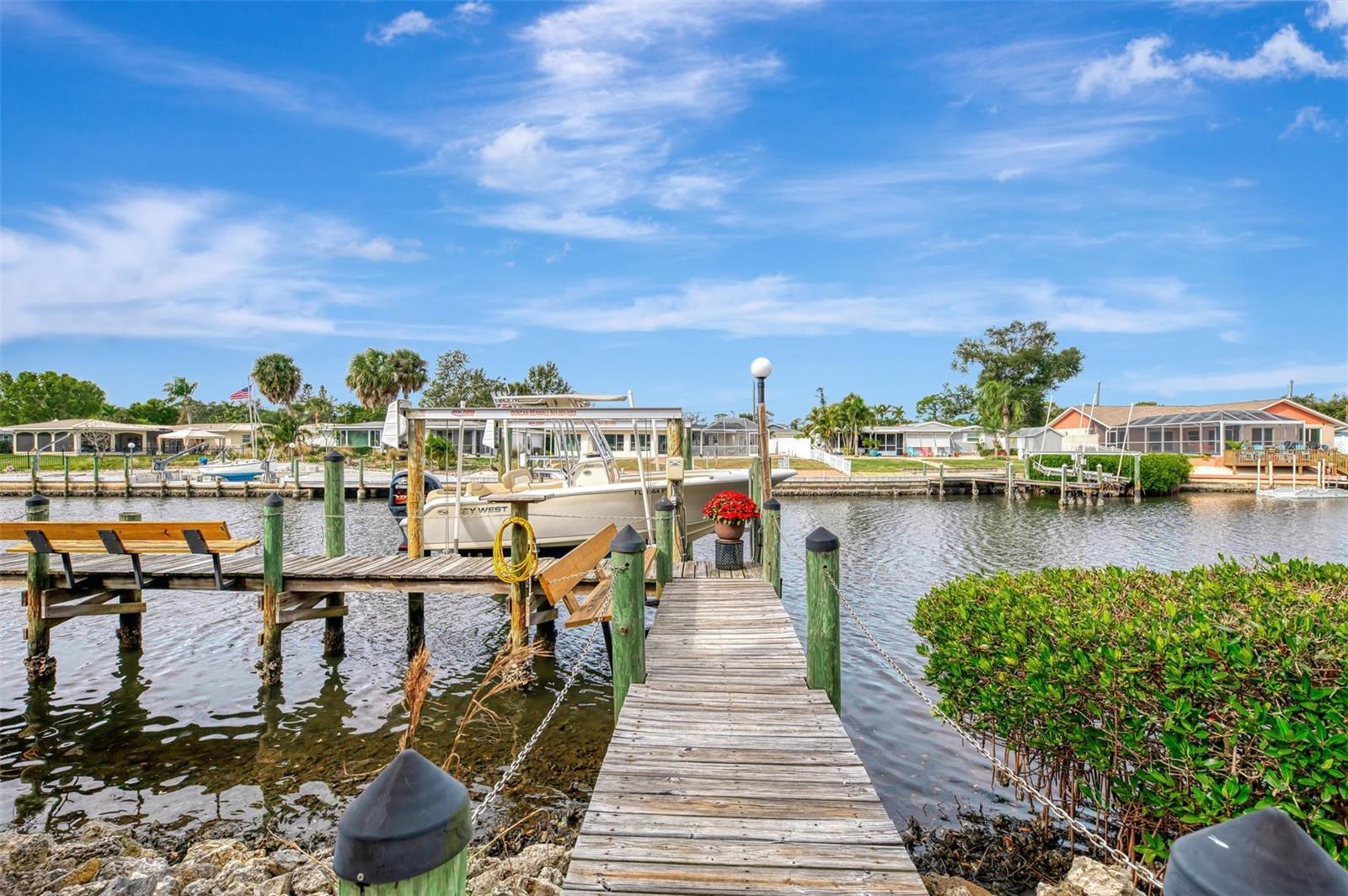Welcome to your waterfront dream home in the highly sought-after Overbrook Gardens community in Englewood. Perfectly positioned on deep sailboat water with no fixed bridges, this elevated 3-bedroom, 3-bath residence offers direct access to Lemon Bay and the Gulf of Mexico, making it an ideal retreat for serious boaters and water lovers alike. Enjoy breathtaking sunset views and spectacular water vistas from the expansive elevated pool deck, where outdoor living takes center stage. The property features a 60’ private boat dock complete with a 10,000-lb boat lift, offering effortless days on the water right from your backyard. Inside, the home impresses with a sprawling and thoughtfully designed layout, featuring three generously sized en-suite bedrooms, providing comfort, privacy, and flexibility for hosting guests. The kitchen is designed for both everyday living and entertaining, showcasing solid surface countertops, a large center island, and a wet bar, seamlessly flowing into the dining room highlighted by a cozy fireplace. A tranquil Florida room offers the perfect spot to enjoy quiet mornings or unwind in the evening while taking in peaceful surroundings. This home is well equipped for Florida living with electric Rolladen hurricane shutters on the west side and additional metal hurricane shutters for peace of mind. The two-car garage extends into a spacious lower-level basement area, ideal for storage, a workshop, or hobby space, and includes a window A/C unit. Situated on a quiet cul-de-sac, this exceptional waterfront property combines privacy, boating convenience, and the relaxed coastal lifestyle Englewood is known for. This is a rare opportunity to own a true boater’s paradise in one of Englewood’s most desirable waterfront neighborhoods.