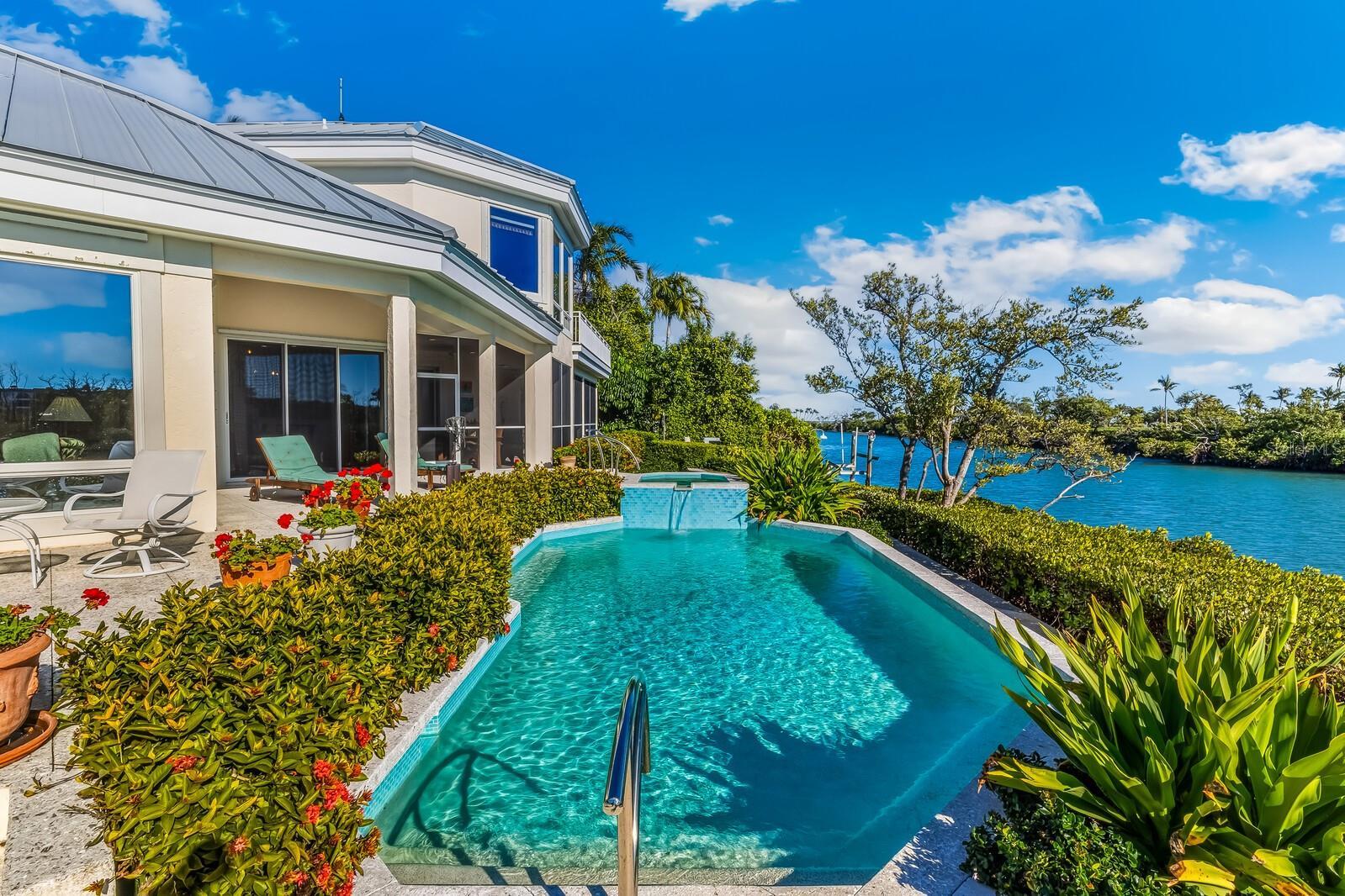 Located on a quiet cul-de-sac in the Boca Grande Isles community, this waterfront residence occupies a prime tip-lot setting with approximately 165 feet of bayou frontage and direct boating access to Charlotte Harbor and the Gulf. Designed by Randy Williamson and built by Dewey-Noller Builders in 2000, the home offers approximately 4,055 square feet of living space. There are four bedrooms, four full baths, and one-half bath across two levels, with the primary suite privately situated on the second floor. Your guests will each enjoy en-suite bathrooms on the main level. The newly replaced elevator provides convenient access between floors. Designed to take full advantage of its waterfront setting, the interior features soaring ceilings, expansive walls of glass, and an open floor plan that captures wide water views and abundant natural light. Oak wood flooring, crown molding, and a gas fireplace add warmth and architectural interest throughout the main living areas. The 165 feet of sea-walled deepwater bayou frontage offers the perfect location to dock a larger vessel. The kitchen is well equipped with stone countertops, two stainless steel sinks, Sub-Zero refrigeration and wine storage, and custom backsplash details, opening seamlessly to adjacent living and dining spaces. Multiple sliding doors lead to the screened lanai and patios, creating an easy connection between indoor and outdoor living. Outdoor areas are oriented to the southwest, providing excellent light throughout the day along with colorful sunrise and sunset views. The new pool and spa are heated, and are surrounded by a combination of lanai, deck, and landscaped outdoor spaces. An irrigation system supports mature tropical plantings throughout the property. The upper-level primary suite offers a private retreat with access to a waterfront balcony, a sitting area, and an office. Here you have stunning Gasparilla Inn golf course and harbor views. The en-suite bath includes dual vanities, a soaking tub, a double-entry shower, custom cabinetry, tumbled tile flooring, and an enclosed outdoor shower. Additional features include a newly installed raised-seam metal roof, hurricane shutters, central air conditioning, a private dock with a 5,000-pound boat lift, a two-car garage, and separate golf cart parking.