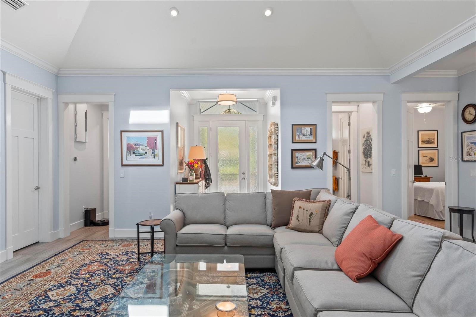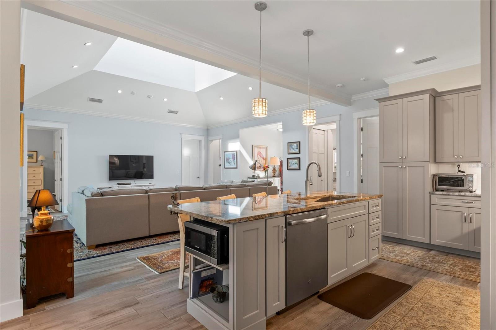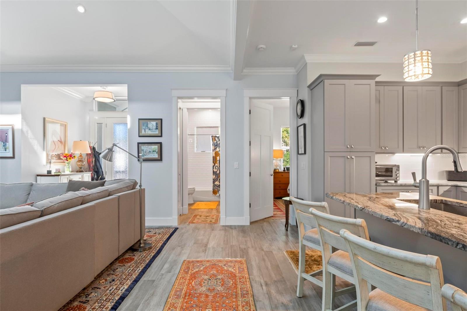 - Ceiling Fans(s), Crown Molding, Eat-in Kitchen, High Ceilings, Kitchen/Family Room Combo, Open Floorplan, Primary Bedroom Main Floor, Smart Home, Stone Counters, Thermostat, Walk-In Closet(s), Window Treatments