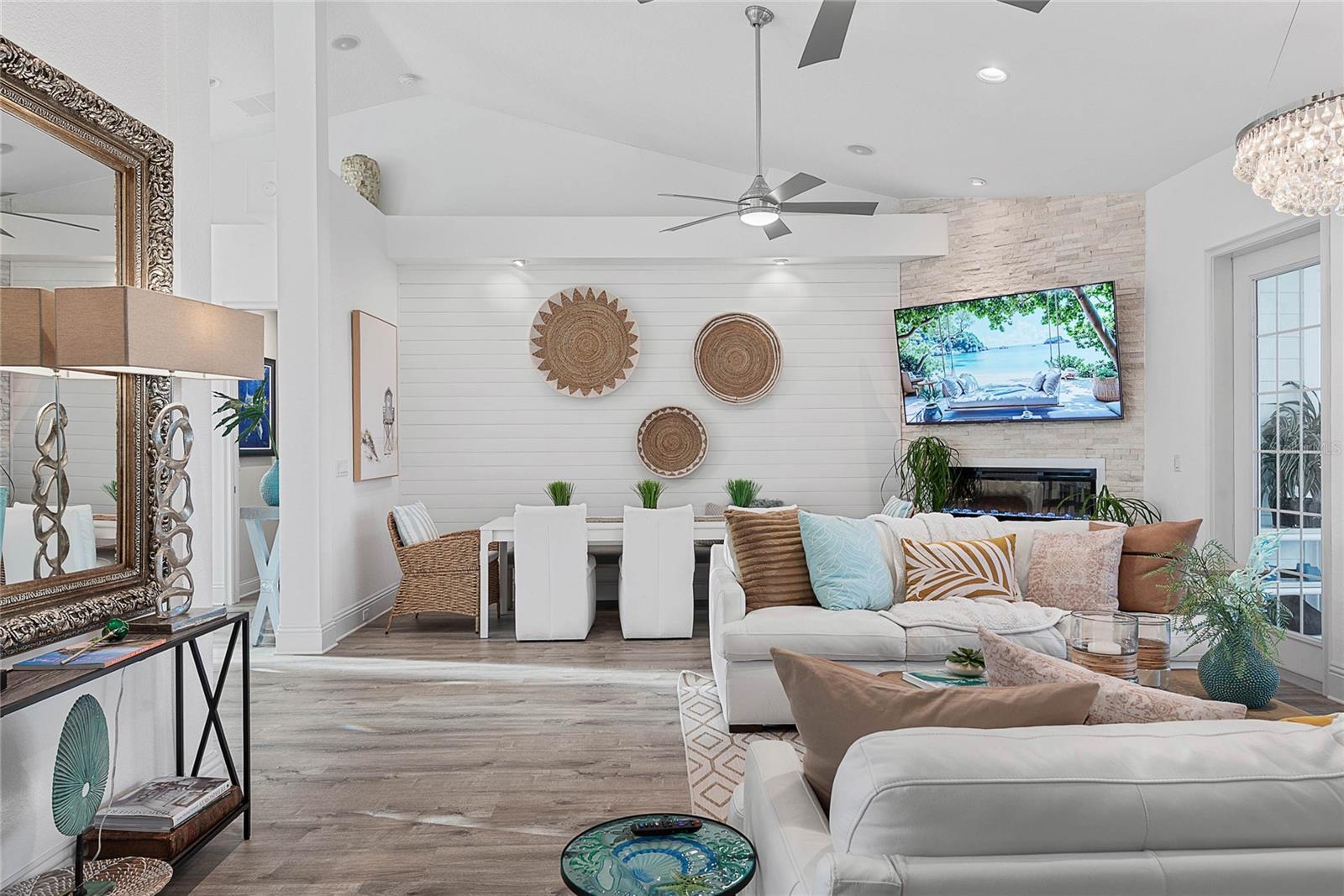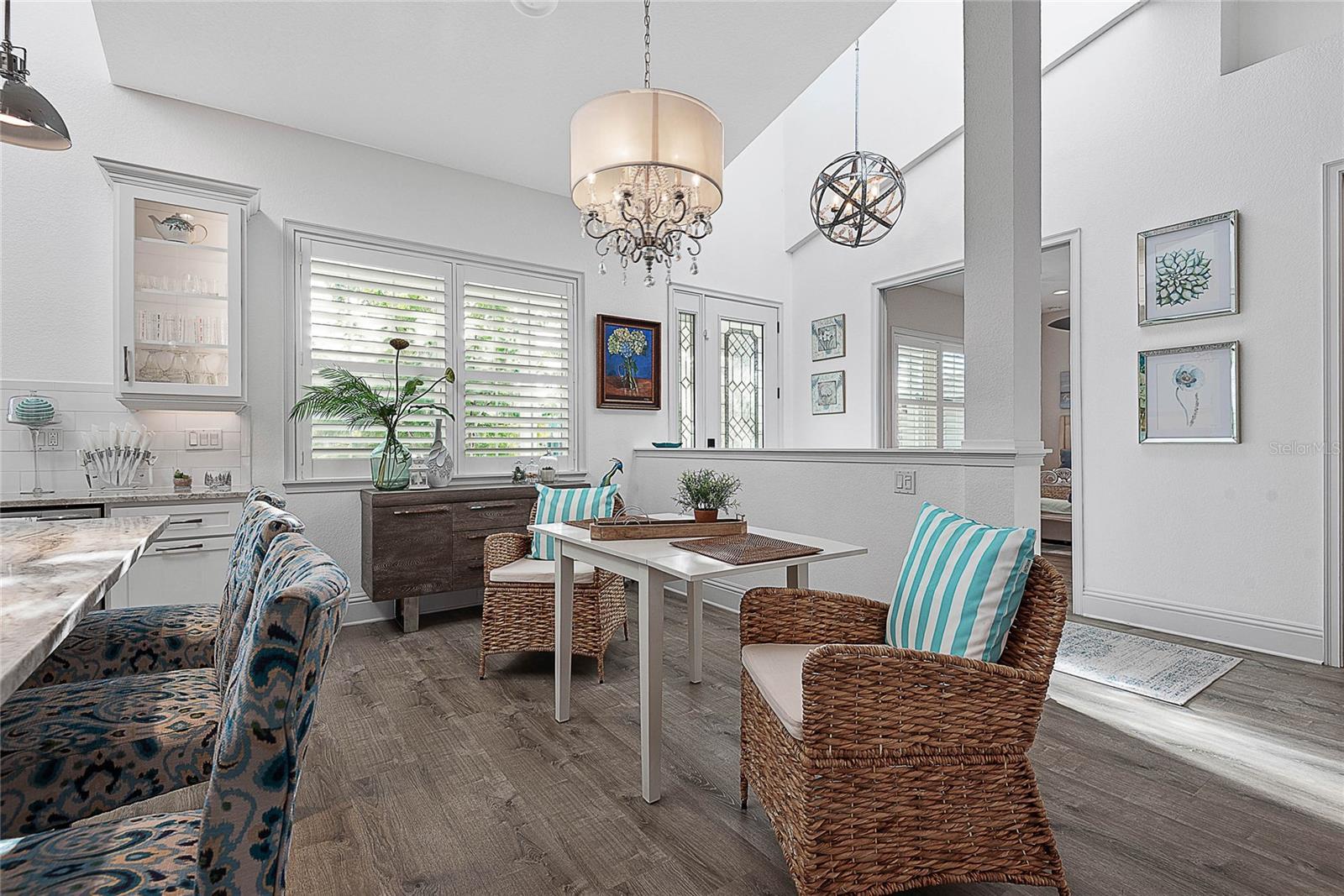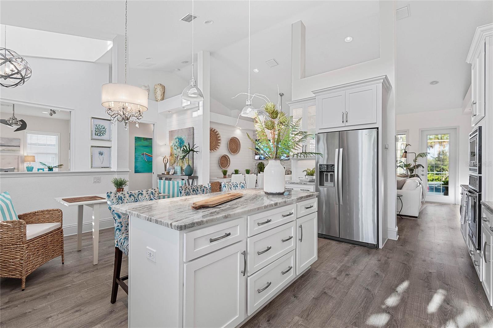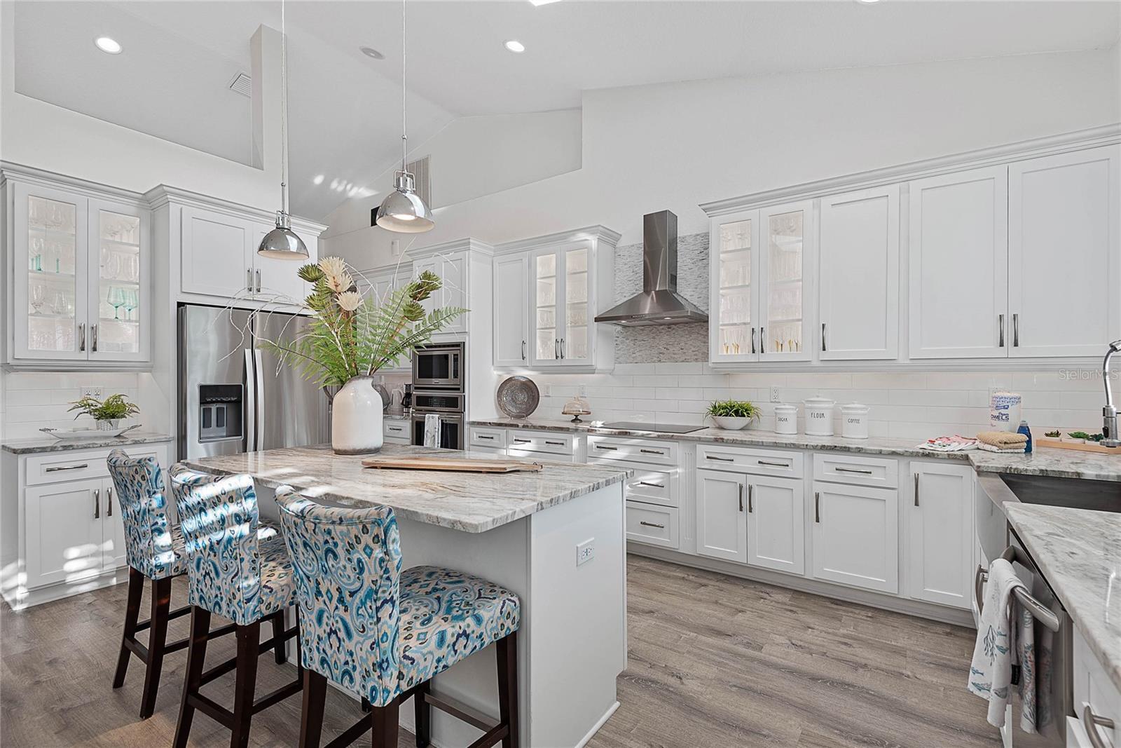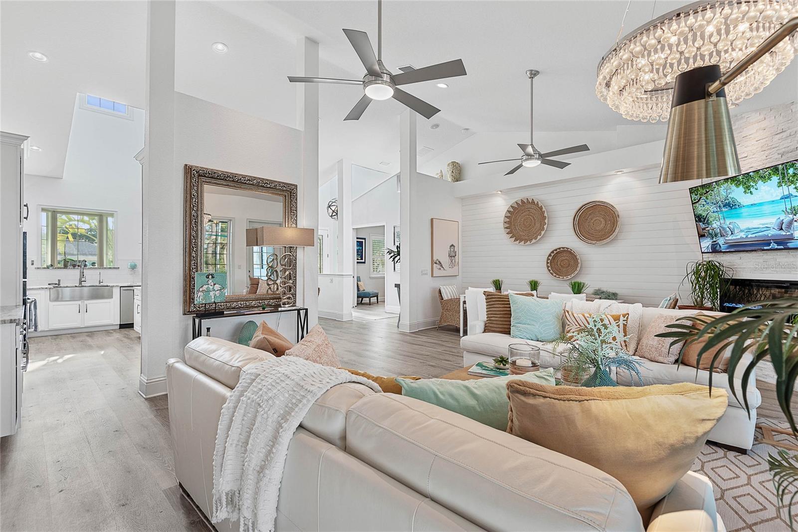 - Cathedral Ceiling(s), Ceiling Fans(s), Dry Bar, Eat-in Kitchen, High Ceilings, Living Room/Dining Room Combo, Open Floorplan, Primary Bedroom Main Floor, Solid Wood Cabinets, Split Bedroom, Stone Counters, Thermostat, Vaulted Ceiling(s), Walk-In Closet(s), Window Treatments