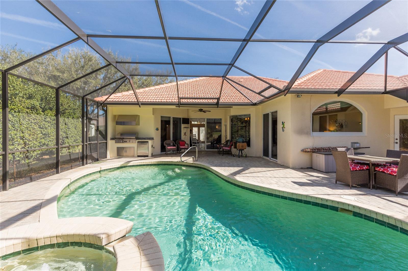 Golf Course Home with Private Pool & Outdoor Oasis in Grand Haven!! Welcome to your dream home in the beautiful Grand Haven community! From the moment you walk through the double frosted glass doors, you’ll feel the "wow" factor of this spacious and thoughtfully designed Rutenberg property. Inside, you’ll find formal living and dining areas, plus a separate family room with a stunning fireplace and custom-built-ins — perfect for cozy nights in. Elegant touches like tray ceilings, crown molding, and plantation shutters add a touch of charm throughout. The wraparound kitchen is a cook’s delight, with shiny granite countertops, an island, stainless steel appliances, and a huge walk-in pantry. The sunny breakfast nook is the ideal spot to sip your morning coffee while looking out at the sparkling pool. Your primary suite offers private access to the pool and gorgeous golf course views. The spa-like bathroom has a sunken jetted tub, a walk-in shower, double vanities, and a roomy walk-in closet. The other bedrooms and bathrooms are just as comfortable and give everyone their own space. Step outside and you’ll find your very own backyard oasis. The screened-in pool and spa are ready for relaxing or entertaining, and the outdoor kitchen and covered lanai make BBQs and dinners under the stars easy and fun, all with stunning vista views of the fairway. Extras include an oversized laundry room with custom cabinets, newer Anderson windows in the 3 guest rooms and above the living room fireplace, upgraded screens to maintain clear views of the golf course, and a spacious two-car garage with ample storage. Living in Grand Haven means you get access to two amazing amenity centers with pools, top-notch fitness facilities, and lots of activities. Love to golf? You’ll have a Jack Nicklaus-designed course right in your neighborhood. Tennis, pickleball, and bocce courts are ready for you, too. When you’re done, grab a bite to eat or a drink with neighbors at the café or golf club restaurant. This isn’t just a house — it’s a lifestyle. Come see it for yourself and fall in love with everything this Grand Haven gem has to offer. Book your private tour today!