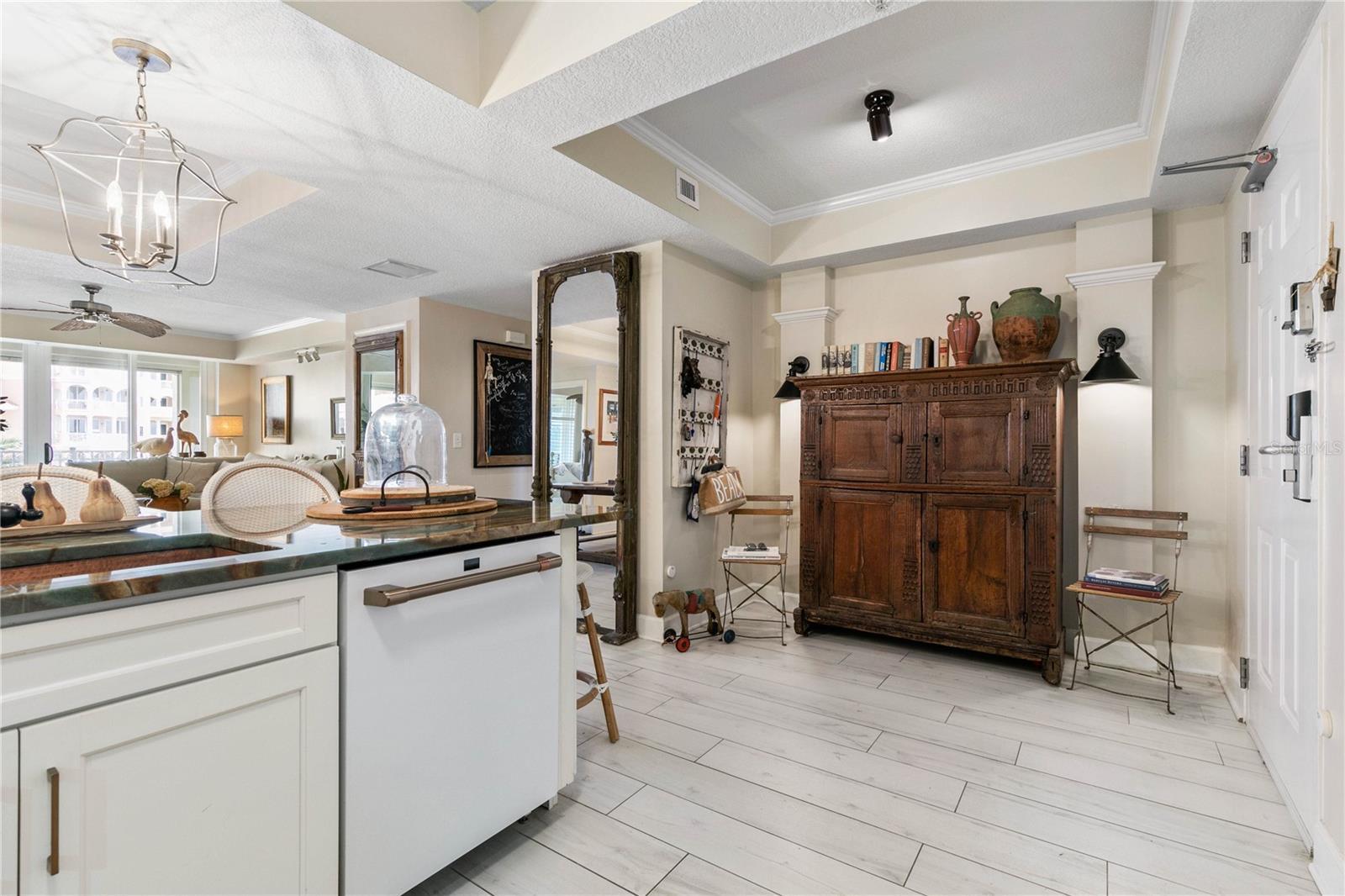 - Built-in Features, Ceiling Fans(s), Crown Molding, High Ceilings, Kitchen/Family Room Combo, Living Room/Dining Room Combo, Open Floorplan, Primary Bedroom Main Floor, Solid Surface Counters, Solid Wood Cabinets, Stone Counters, Tray Ceiling(s), Walk-In Closet(s), Window Treatments