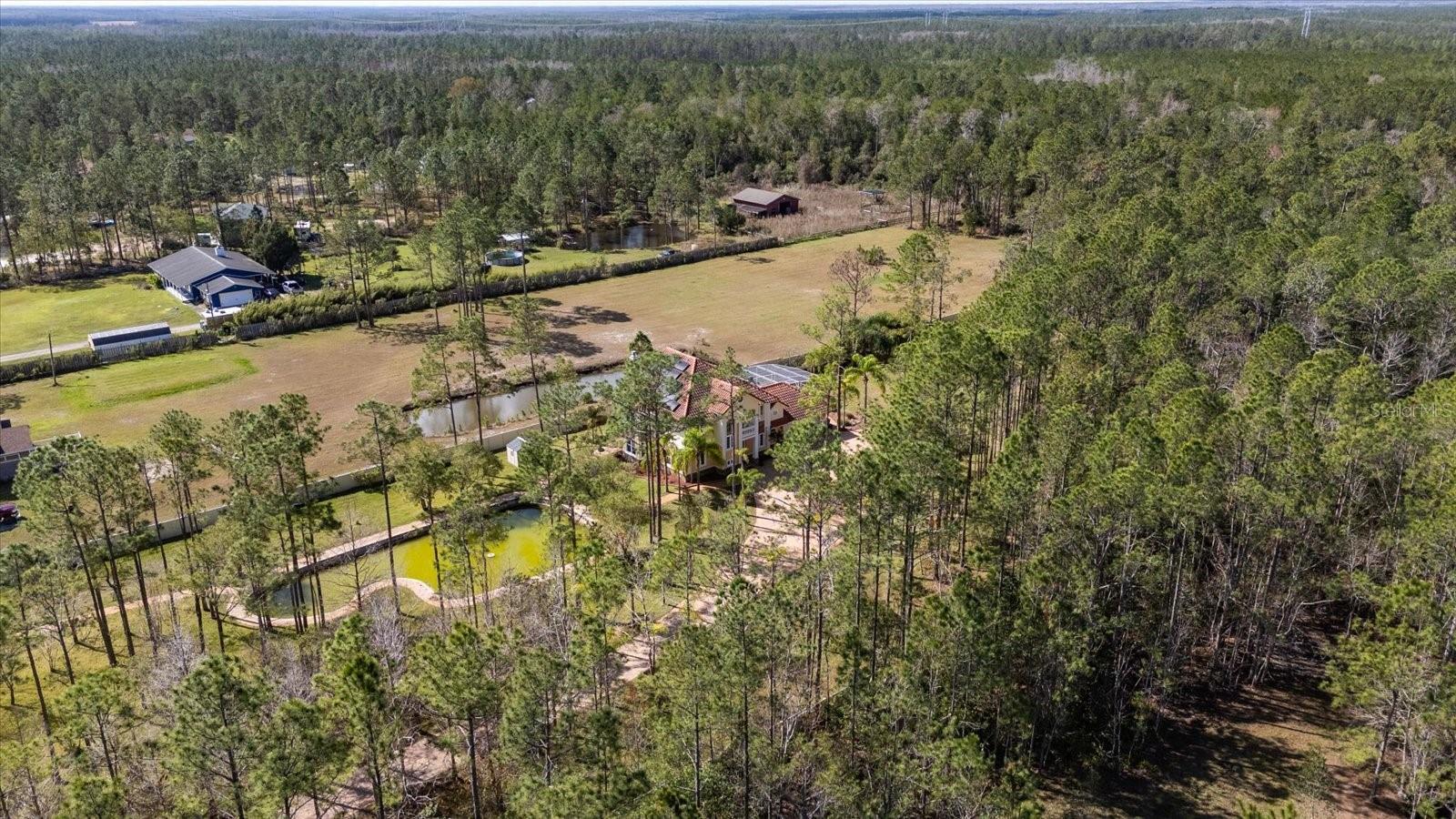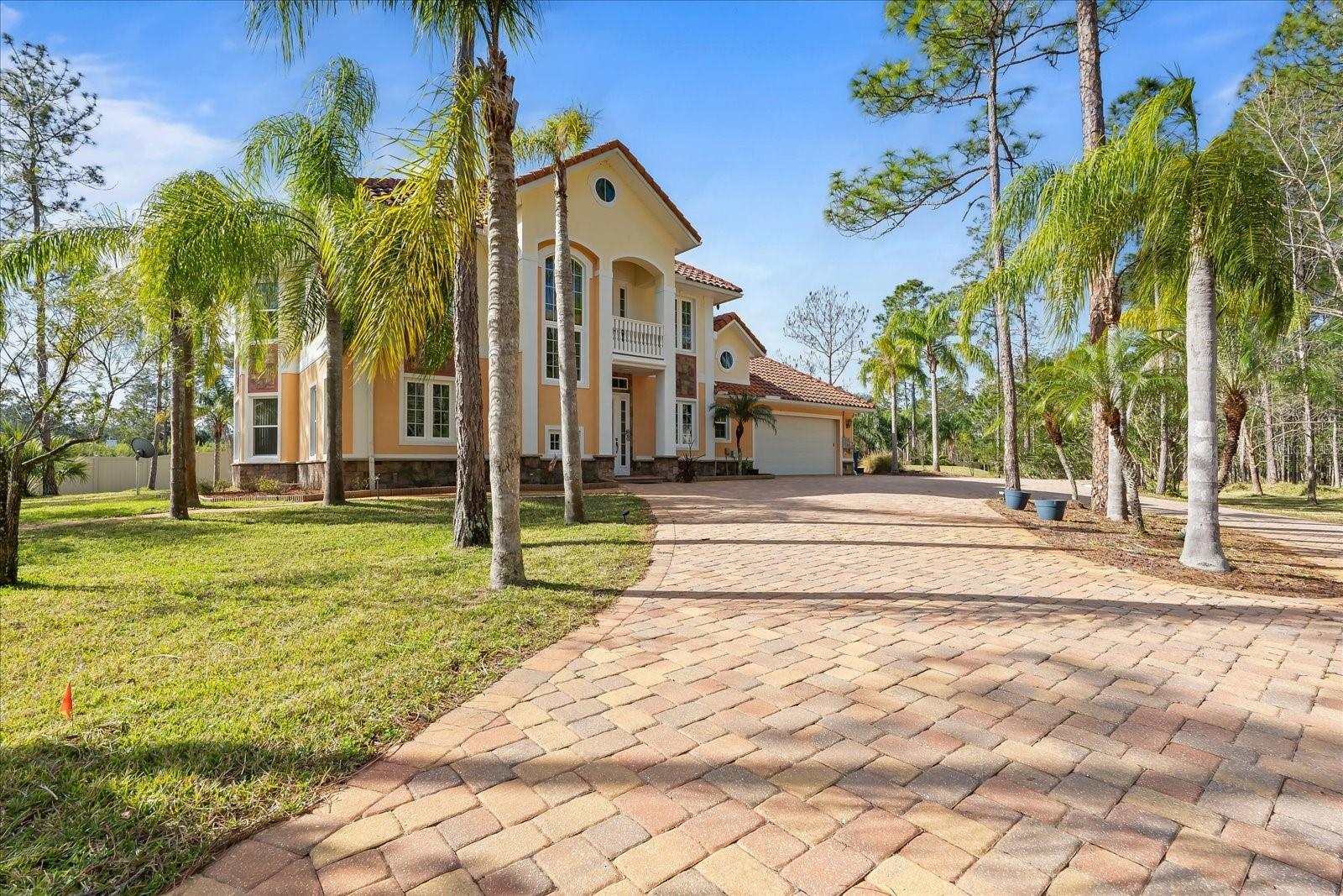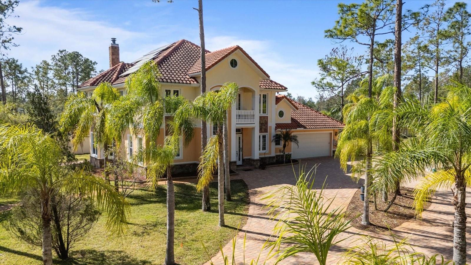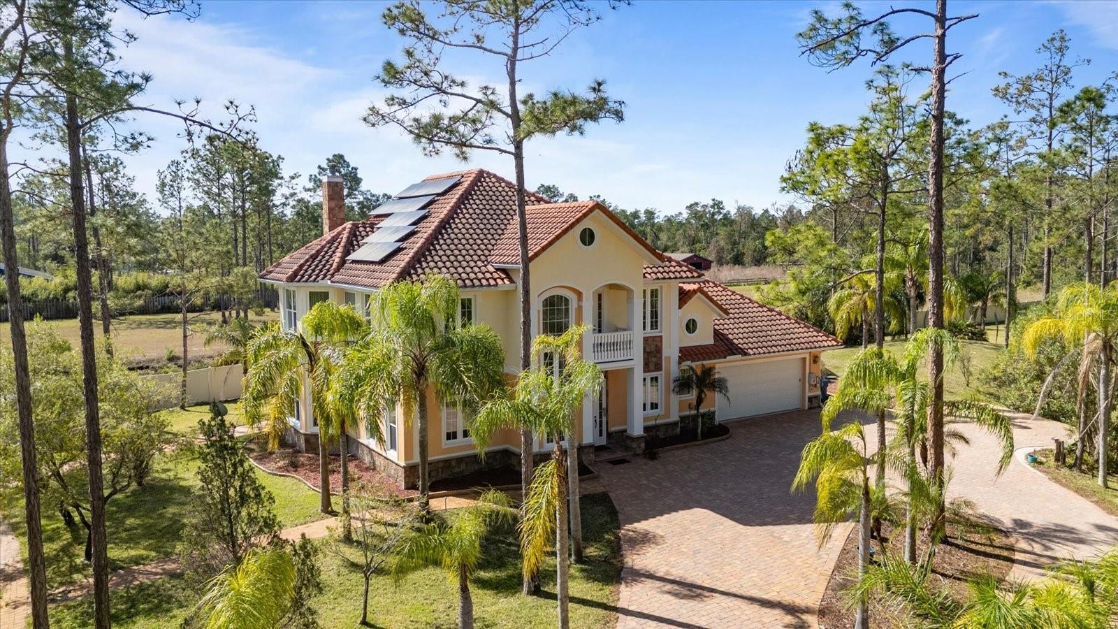 Nestled on just under 6 acres of unspoiled land, this exquisite and private residence offers the perfect blend of elegance and tranquility. As you approach the property, you'll be greeted by a grand gated entrance, with a charming pavered driveway leading you past a serene man-made pond. The 2008 custom-built Spanish-inspired home offers both comfort and style boasting 5 spacious bedrooms, 5.5 baths, and an oversized two-car garage. Inside, the home features a welcoming living room, a dining room, and a cozy den just off the foyer. The bright and airy enclosed Florida room is an ideal spot to unwind in the afternoons. With one bedroom located on the first floor and the remaining four on the second, each with its own private bath, everyone in the family (or your guests) can enjoy their own space and privacy. The third floor offers a versatile bonus room that can be transformed into a home theater, playroom, or private office. The kitchen is a chef's dream, featuring tall maple cabinetry, a center island with a sink, double ovens, and a convenient warming shelf. A spacious walk-in pantry provides ample storage. The kitchen offers easy access to the dining room, hallway, and opens up to the pool area, making it perfect for both cooking and entertaining. Outside, the expansive pool area is fully screened and includes a newly built sitting area, perfect for outdoor gatherings or simply enjoying the beautiful surroundings. The home is also equipped with a Photovoltaic Solar System, significantly lowering your electric bills—so much so that at times FPL may even pay you for the energy it produces. Come see this stunning home for yourself and choose the bedroom that best fits your lifestyle—whether you prefer a sun-drenched retreat or a room with its own private walk-out balcony. This home truly offers something for everyone.