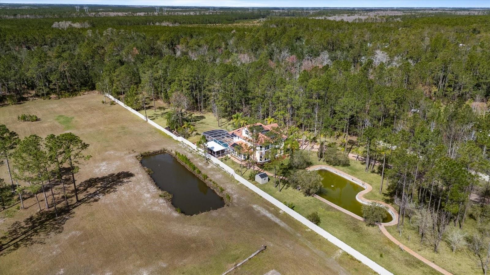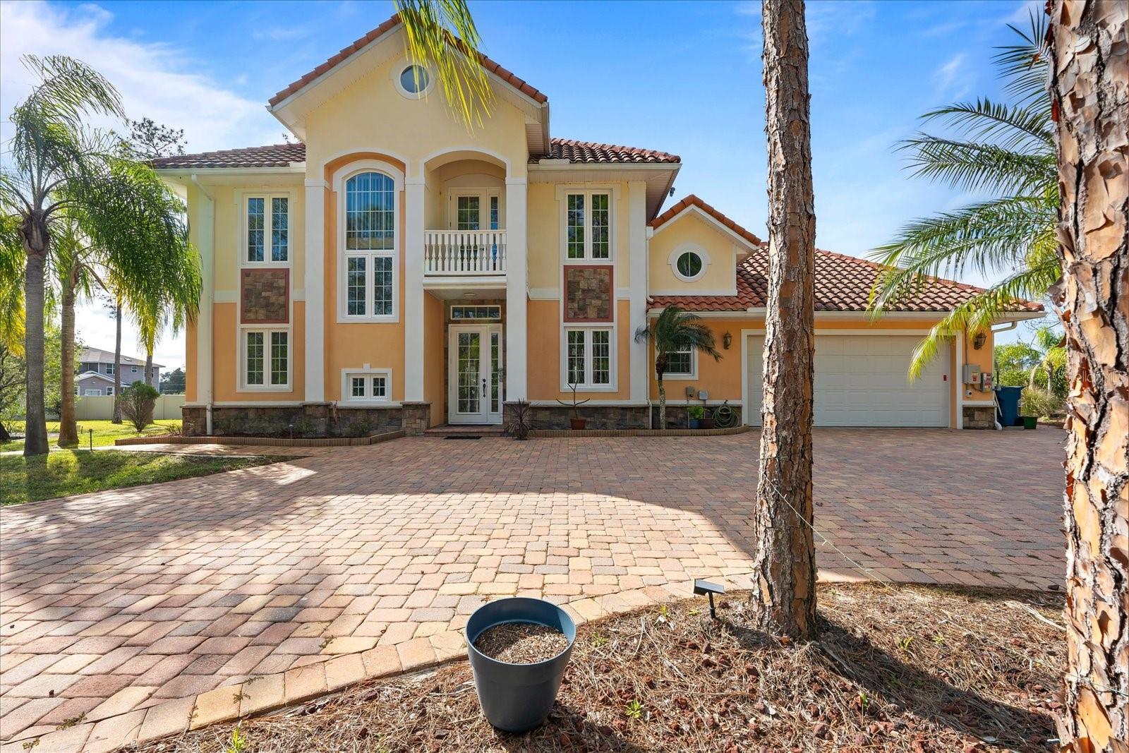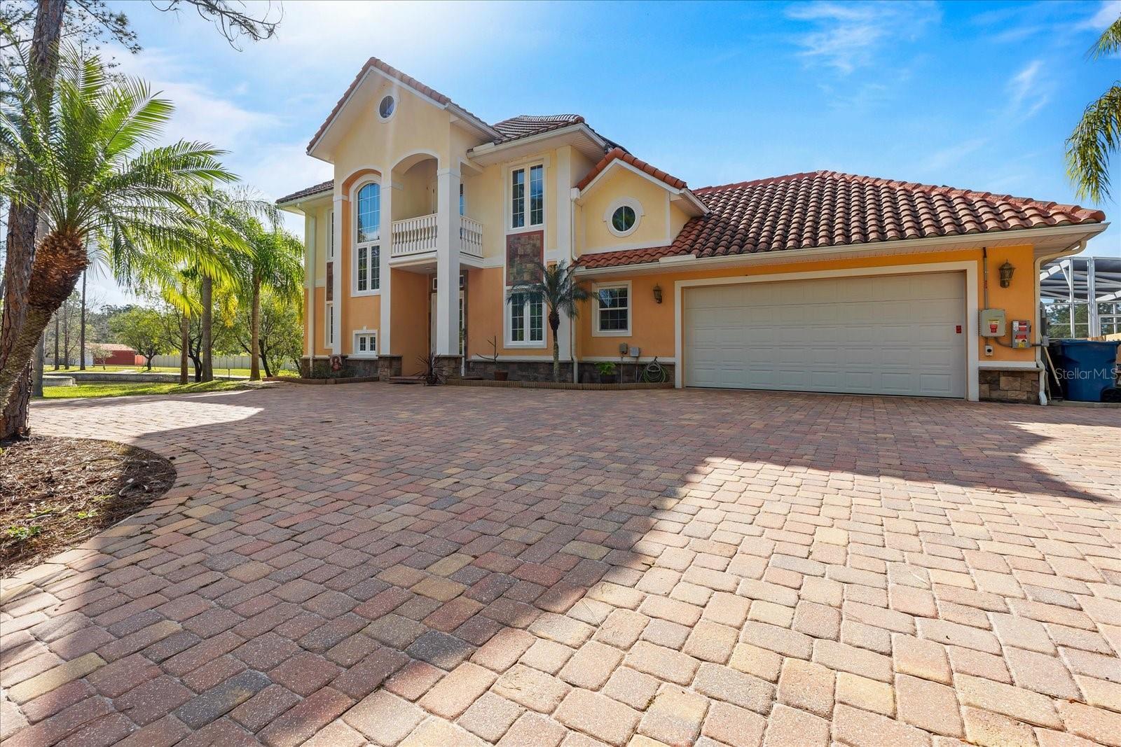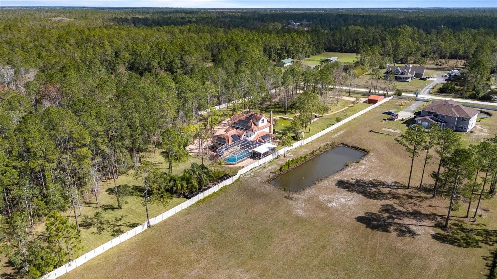 Nestled on just under 6 acres of unspoiled land, this exquisite and private residence offers the perfect blend of elegance and tranquility. As you approach the property, you'll be greeted by a grand gated entrance, with a charming pavered driveway leading you past a serene man-made pond. The 2008 custom-built Spanish-inspired home offers both comfort and style boasting 5 spacious bedrooms, 5.5 baths, and an oversized two-car garage. Inside, the home features a welcoming living room, a dining room, and a cozy den just off the foyer. The bright and airy enclosed Florida room is an ideal spot to unwind in the afternoons. With one bedroom located on the first floor and the remaining four on the second, each with its own private bath, everyone in the family (or your guests) can enjoy their own space and privacy. The third floor offers a versatile bonus room that can be transformed into a home theater, playroom, or private office. The kitchen is a chef's dream, featuring tall maple cabinetry, a center island with a sink, double ovens, and a convenient warming shelf. A spacious walk-in pantry provides ample storage. The kitchen offers easy access to the dining room, hallway, and opens up to the pool area, making it perfect for both cooking and entertaining. Outside, the expansive pool area is fully screened and includes a newly built sitting area, perfect for outdoor gatherings or simply enjoying the beautiful surroundings. The home is also equipped with a Photovoltaic Solar System, significantly lowering your electric bills—so much so that at times FPL may even pay you for the energy it produces. Come see this stunning home for yourself and choose the bedroom that best fits your lifestyle—whether you prefer a sun-drenched retreat or a room with its own private walk-out balcony. This home truly offers something for everyone.