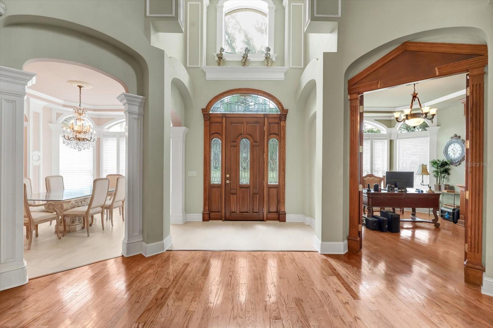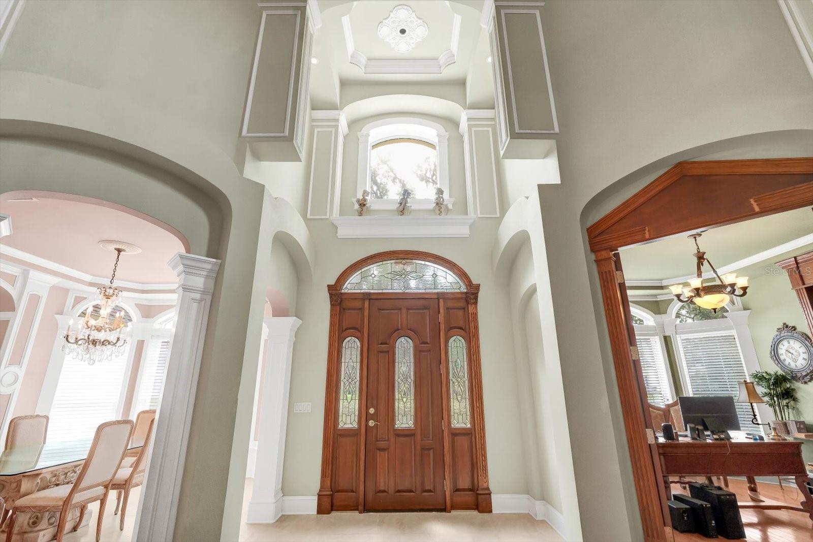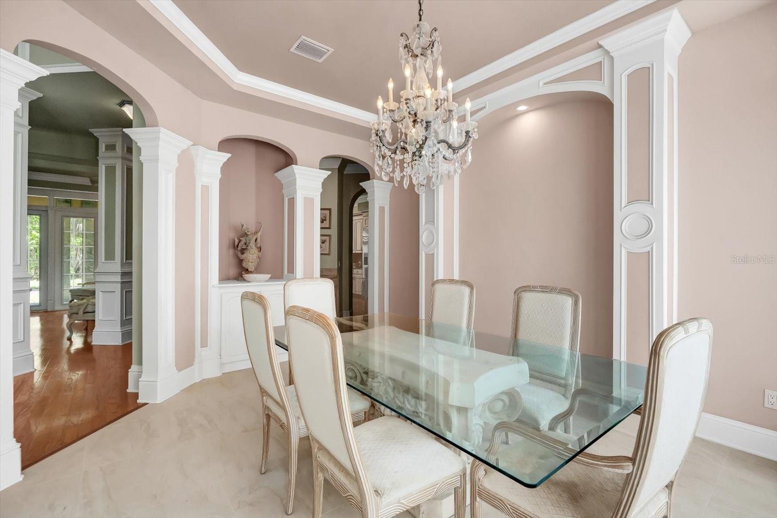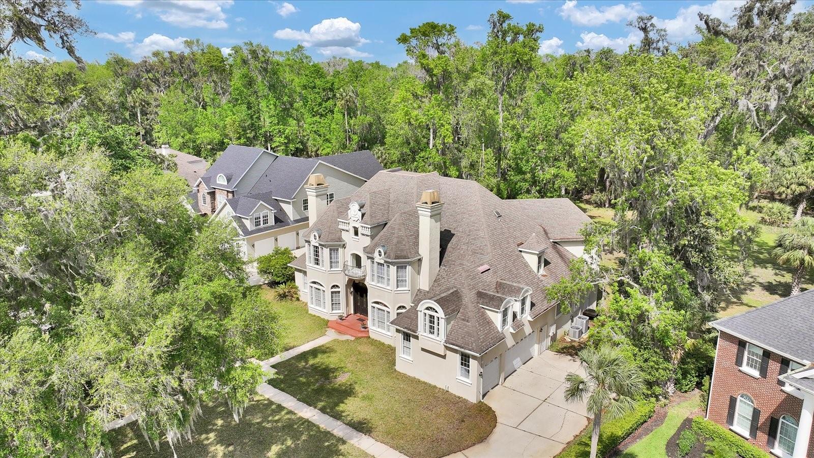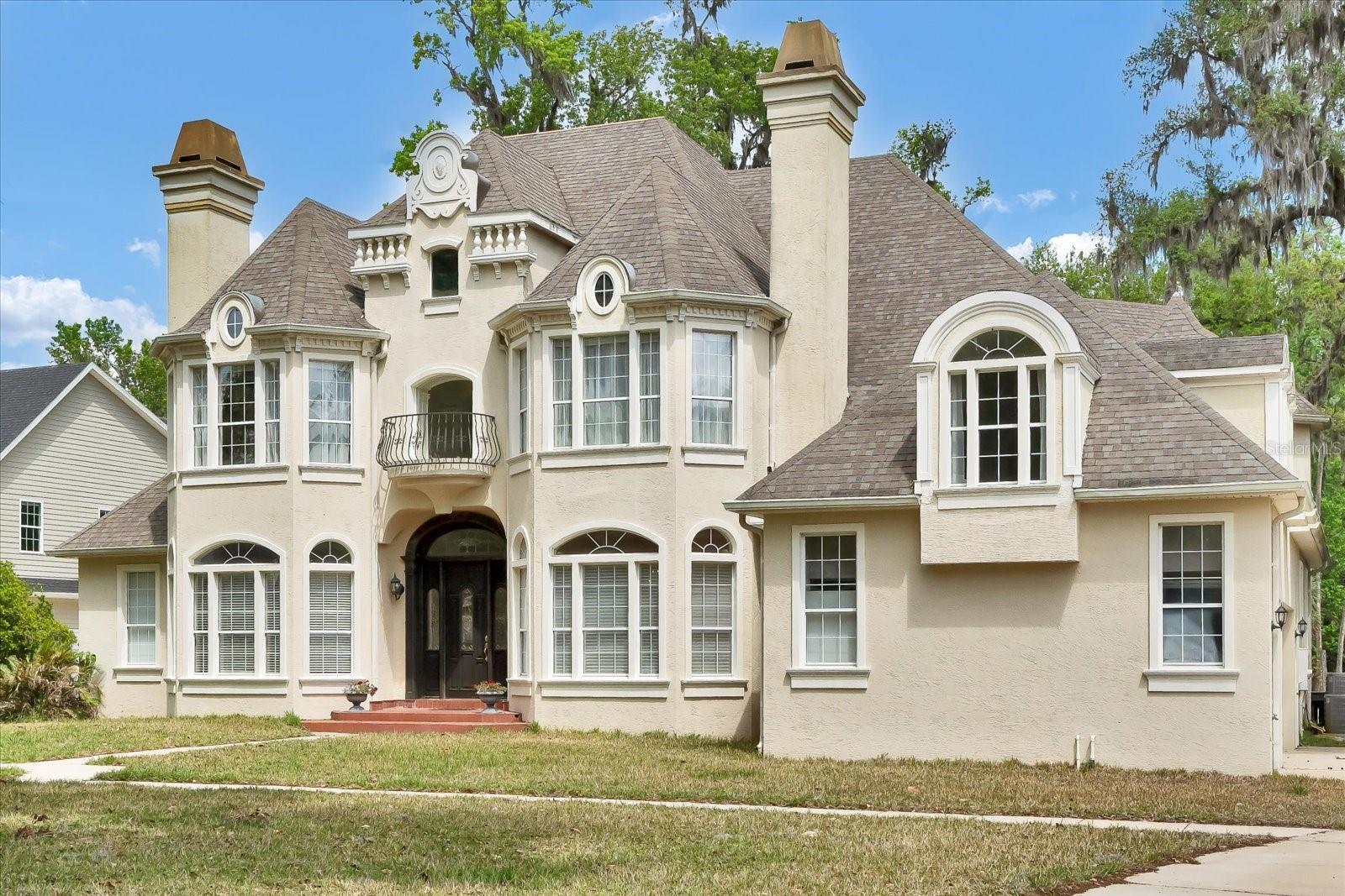 Tucked away in the prestigious Sugar Mill Plantation, this extraordinary 7 Bedroom, 4 1/2 Bath French-inspired estate is a timeless masterpiece that blends privacy, elegance, and enduring value. Encompassing over 6,000 square feet of meticulously crafted living space and graciously positioned along more than 200 acres of protected state preserve, this custom-built home offers an unmatched living experience. From the moment you arrive, the home's architectural grandeur and attention to detail captivate. Inside, exquisite craftsmanship is showcased through crown molding, stately columns, custom baseboards, and artisanal touches throughout. Two elegant gas fireplaces create cozy focal points, while 10-foot ceilings and 8-foot doors on the main level enhance the sense of space and refinement. The great room features one of the two gas fireplaces for those chilling evenings and also is equipped with surround sound. The chef’s kitchen is a dream, featuring a double oven, convection microwave, large walk-in pantry, center island with prep sink, butler’s pantry with additional sink, and a built-in wine cooler—perfect for entertaining. A beautiful formal dining room with a bay window sets the stage for memorable gatherings. Retreat to the luxurious downstairs master suite, complete with a tranquil view of the state park through a large bay window. The spa-like master bath includes a walk-in shower, Jacuzzi tub, dual sinks, marble countertops, vanity area, and two spacious walk-in closets. Ascend the elegant circular staircase to find additional bedrooms, each thoughtfully designed—including two located within the home’s signature towers, boasting expansive bay windows. A large open loft with balcony, bonus/game room with surround sound add to the home's versatility. Practical features such as two A/C units, two water heaters, an intercom system, built-in, walk-in closets in every bedroom, various closets throughout the home for additional storage, a laundry chute for added convenience, and a safe room–designed laundry area ensure both comfort and peace of mind. Every corner reveals thoughtful design, from the intricate ledges and nooks to the seamless flow between living areas. This one-of-a-kind estate must be seen to be truly appreciated—a rare offering that combines timeless style, exceptional privacy, and enduring quality in one of the area’s most sought-after neighborhoods.