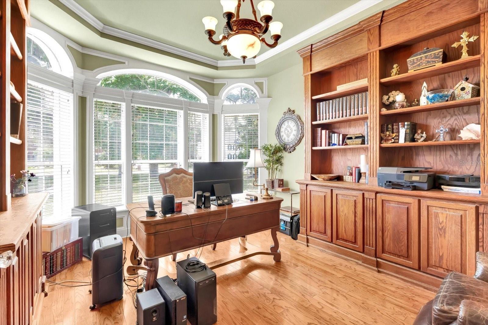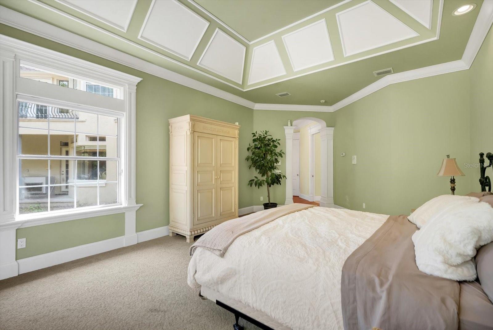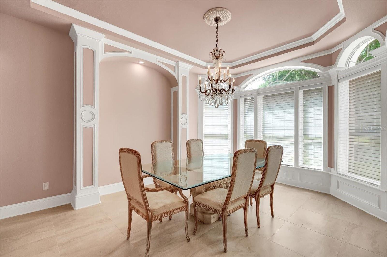 - Built-in Features, Ceiling Fans(s), Chair Rail, Crown Molding, High Ceilings, Kitchen/Family Room Combo, L Dining, Primary Bedroom Main Floor, Split Bedroom, Stone Counters, Tray Ceiling(s), Walk-In Closet(s)