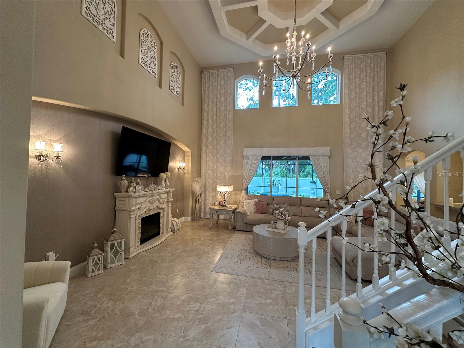 - Coffered Ceiling(s), Dry Bar, Eat-in Kitchen, High Ceilings, Open Floorplan, Primary Bedroom Main Floor, Solid Surface Counters, Thermostat, Walk-In Closet(s), Wet Bar, Window Treatments