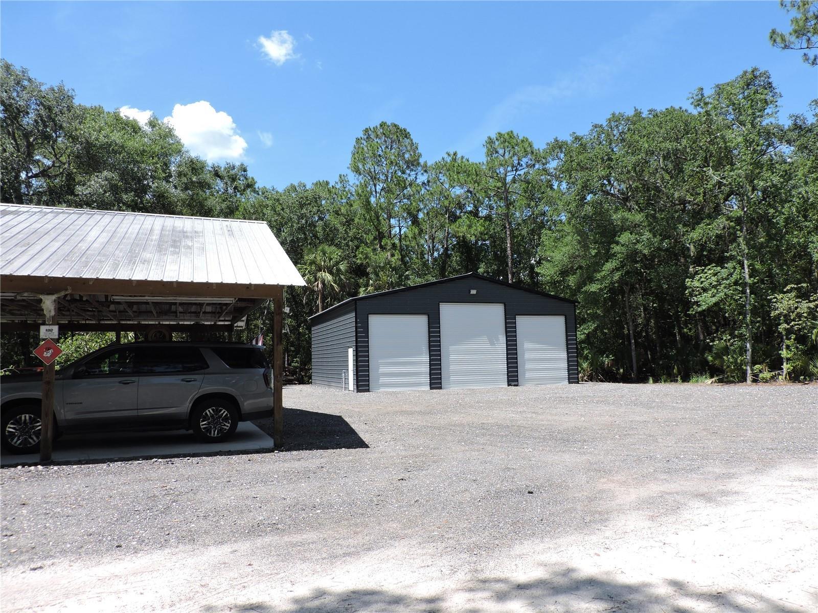 This exceptional private property spans five acres with mature oak trees, a long private driveway of millings leading to the freshly painted updated 3 bedroom 2 bath house nestled far away from the road toward the rear of the property, passing the 40 x 40 new metal barn which has 3 roll up doors, side entry door, 100 amp service, water, east bay has 8” thick concrete for future mechanic’s lift, the 36 x 36 concrete floor open carport has 3 parking spaces and workshop, all in close proximity to the home which has a two-car garage. The home has a thoughtfully designed floor plan, tile bathrooms, laundry & kitchen with real wood floors throughout the rest, upon entering the foyer you’re greeted by a spacious living room with vaulted ceiling takes you to a sliding glass door that opens to the 21 x 9 screened porch where you can sit with a cold drink or morning coffee watching the deer, turkeys, and wildlife. The master suite is a generous size bedroom with master bath equipped whirlpool tub, double vanities, a step-in shower, and spacious walk-in closets. Two additional bedrooms which share a second full bath, in house laundry room off the kitchen featuring abundant cabinetry with Corian countertops, panty, eat in bar, breakfast nook, and separate dining room. Highlights include new roof, new water heater, new exterior house paint, newer ac, insulated garage & rear porch ceiling, and RV outlet. Bring your animals, ATV, RV, boats, & toys as this property is ready for it all! Less than 4-miles away you have county owned Bull Creek Fish Camp with new coming restaurant, boat ramp, kayaking, fishing, then on your way to county owned Russell Landing boat ramp with bathrooms, picnic area, trails you pass the county owned lighted arena and Pellicer Community Center for family parties. This home is designed for peace, privacy, functionality, and is perfect for entertaining. Don’t miss out on this incredible opportunity!