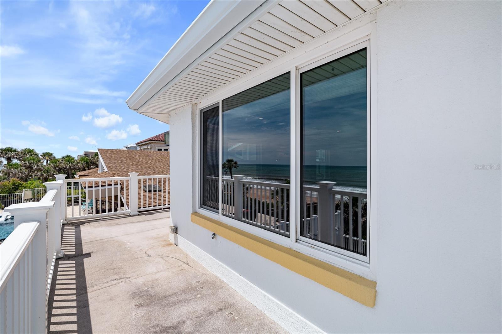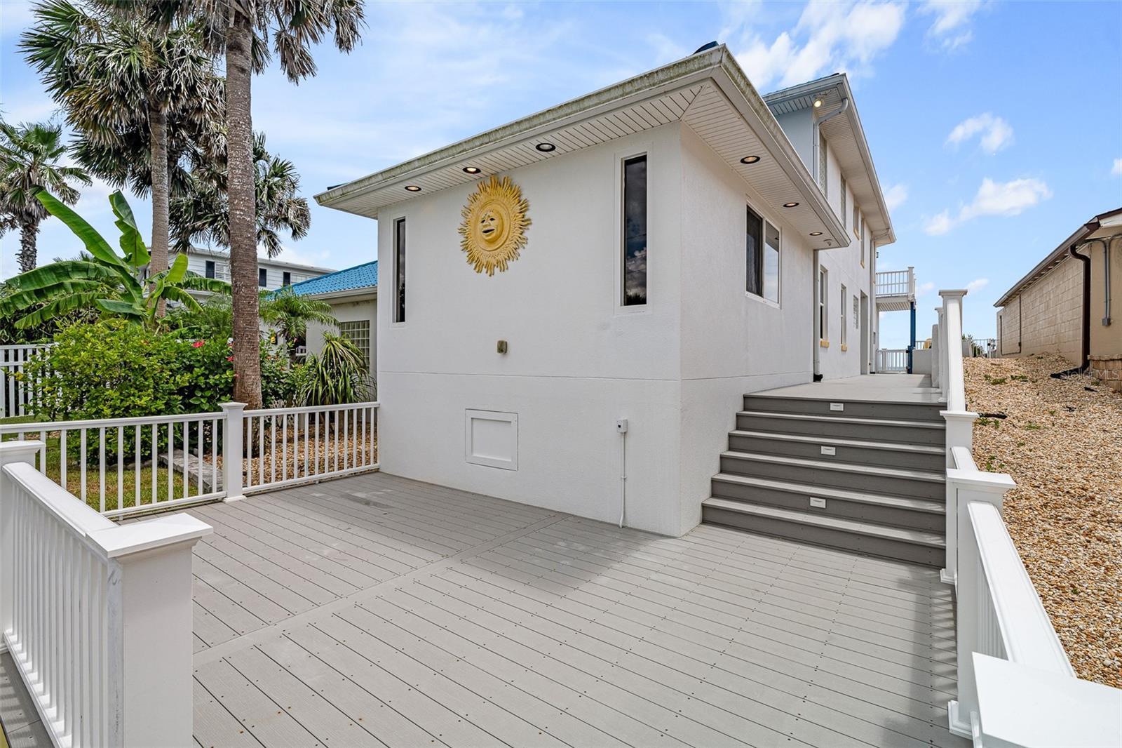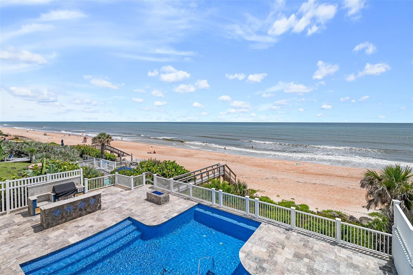 Oceanfront Oasis in the Hearth of Ormond Beach. Located high on a dune directly across from Oceanside County Club offering endless views of the Atlantic ocean and the pristine NO DRIVE BEACH. Interior features include 4 or 5 bedrooms (5th bedroom currently used as a media room) 4 full bathrooms with an additional ½ bath poolside. The primary suite is located on the top floor with private balcony overlooking the pool and ocean. Pool parties are mandatory around the oceanfront resort style saltwater pool which was constructed to the highest standards utilizing pilings and features fountains and a sun shelf which can accommodate multiple lounge chairs. The pool deck is imported travertine and accented by a summer kitchen and gas fire pit. The elevation of this property is evident as you traverse your private beach walkover which extends down 2 tiers to the beach featuring a concrete seawall and coquina riprap on the lower level. The 3 car detached garage has individual bays and additional storage space. Some of the updates over the past few years include the GrandeTile energy efficient metal barrel style roof, impact doors and PGT windows throughout, AC units, hot water heater, extensive paver driveway and retaining wall and Kohler 38KW whole home generator with 500 gal buried propane tank. This home is ready for it’s new owner to put their personal touches on this slice of paradise!!