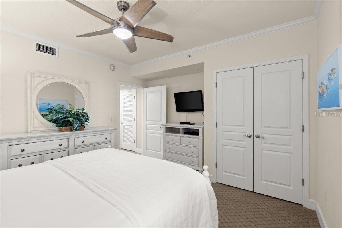 - Ceiling Fans(s), Crown Molding, Open Floorplan, Pest Guard System, Primary Bedroom Main Floor, Solid Wood Cabinets, Stone Counters, Thermostat, Tray Ceiling(s), Walk-In Closet(s)