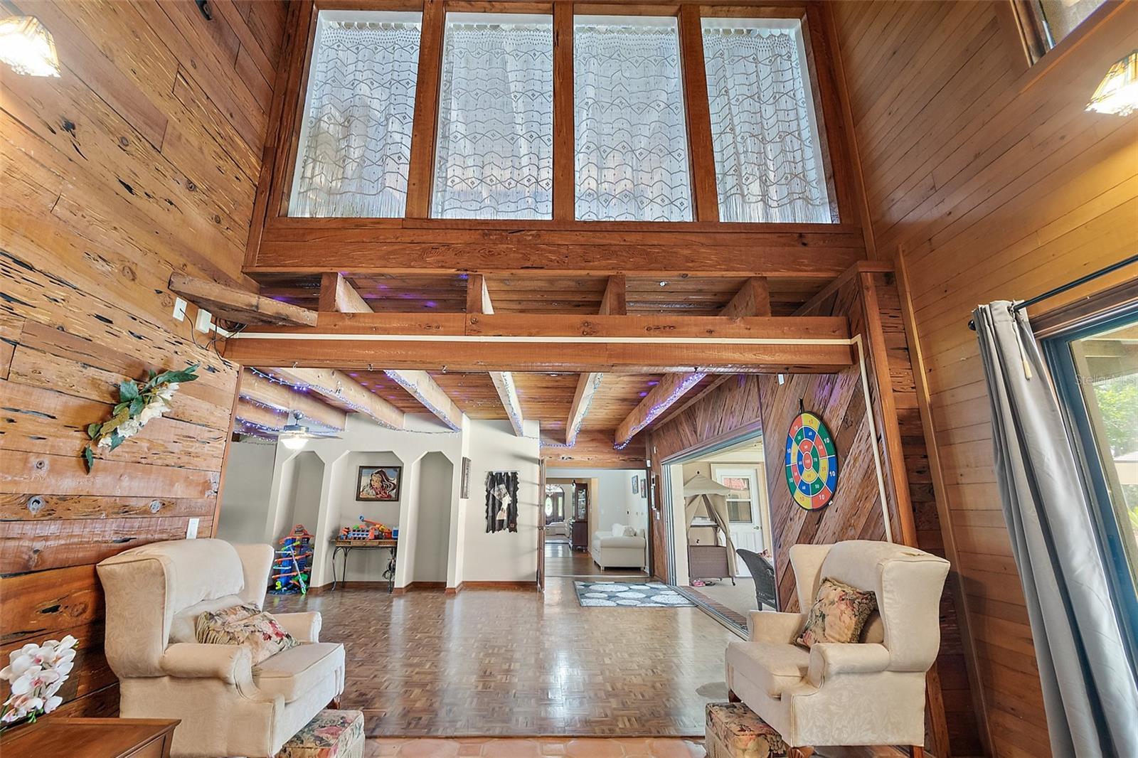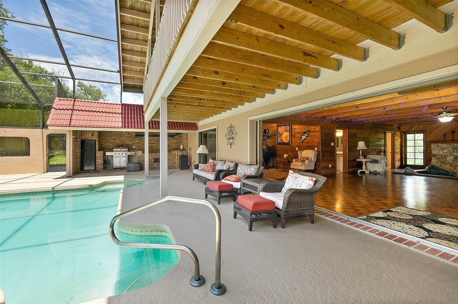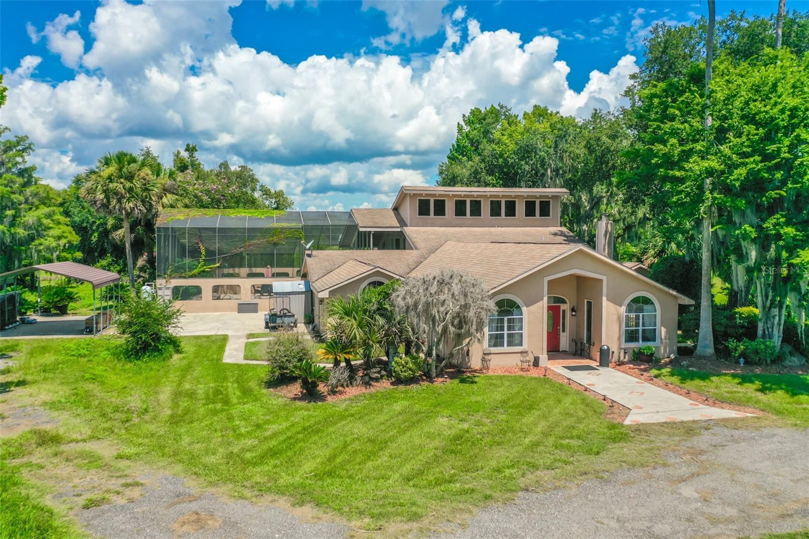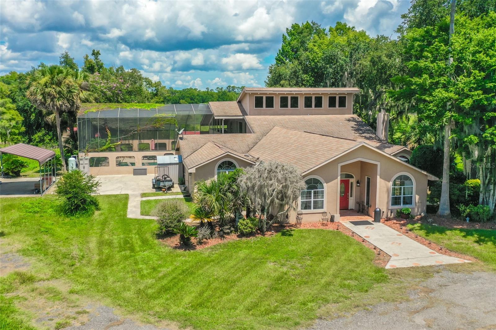 Welcome to 14951 Andalusia Trail — a one-of-a-kind custom estate that beautifully blends rustic charm, modern upgrades, and serene acreage living. Situated on 5.34 high-and-dry acres, this freshly remodeled home offers a rare combination of elegance, warmth, and functionality — perfect for multigenerational families, homesteaders, entertainers, or anyone seeking space and privacy. This expansive 6-bedroom, 4.5-bathroom property includes three primary suites, each designed with comfort and luxury in mind. From the moment you enter, you're greeted by vaulted cedar ceilings and walls, coquina stone fireplaces, and rich parquet wood flooring — all creating a welcoming, organic atmosphere that's hard to find in today’s market. The layout includes: Formal living room with soaring ceilings and a dramatic coquina fireplace Formal dining room with fireplace and natural light Family room with built-ins and open access to outdoor living Private office/library with vaulted ceilings Grand master suite featuring its own fireplace, sitting area, and exclusive access to two private balconies Fresh paint, updated fixtures, and premium finishes throughout The kitchen and baths have been thoughtfully updated as part of the remodel, blending function and form with timeless finishes. Step outside into your resort-style screened pool area surrounded by lush, mature landscaping. The space includes a fully equipped outdoor kitchen with built-in grill, prep counter, sink, and refrigerator — ideal for entertaining or relaxing in privacy. Additional outdoor features include: New pool heater and pump Two sheds for storage Two covered carport spaces Three fenced paddocks for animals or farming New artesian well with full filtration system Whole-house generator and two gas tanks New A/C system (2025) and new water heater This is not just a house — it’s a lifestyle property designed for comfort, independence, and connection with nature. Conveniently located just minutes from Palm Coast, Flagler Beach, and SR-100, yet tucked away on a quiet, private road with no HOA and endless potential. Was appraised $1100 000 after all the renovation
