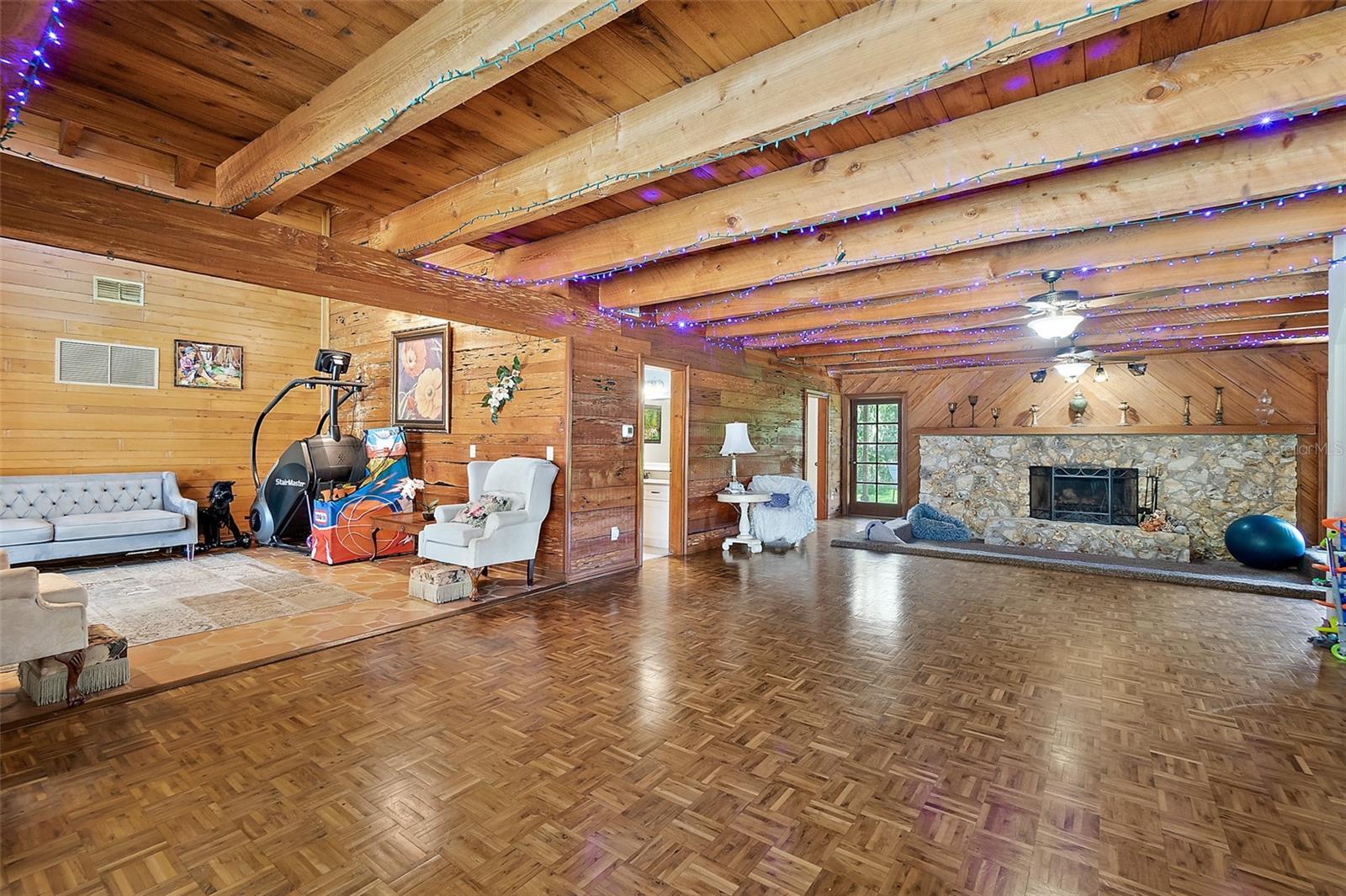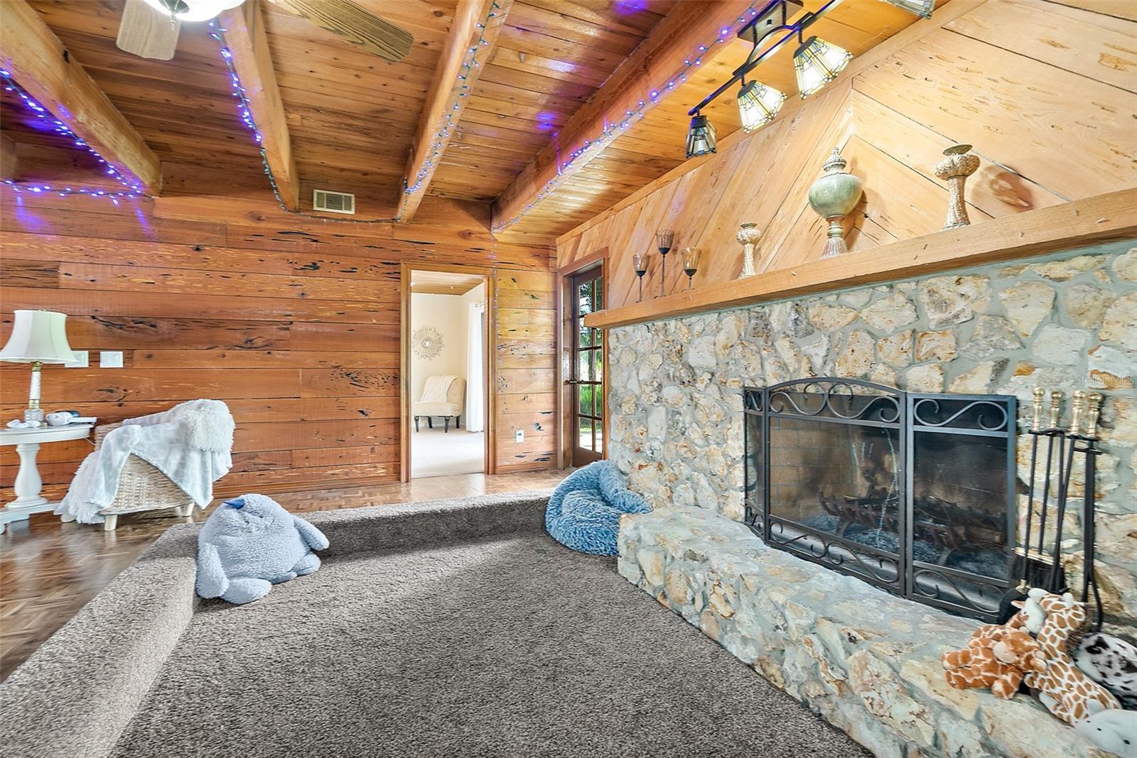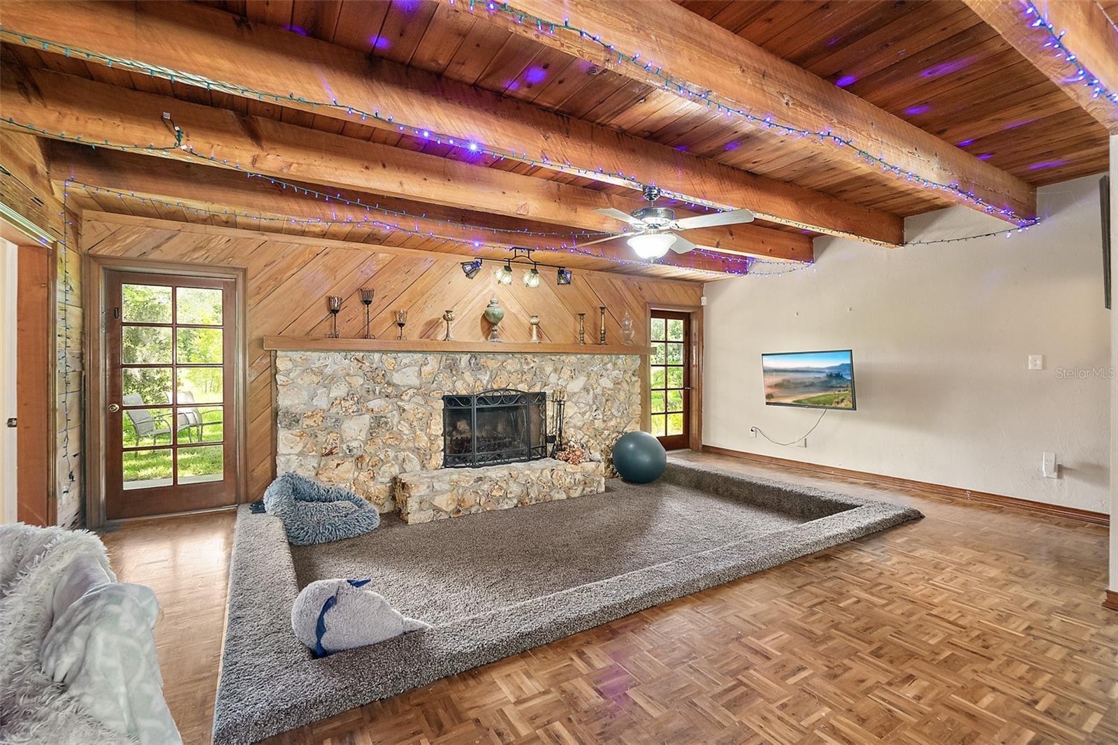 - Family Room, Living Room, Primary Bedroom, Stone, Wood Burning