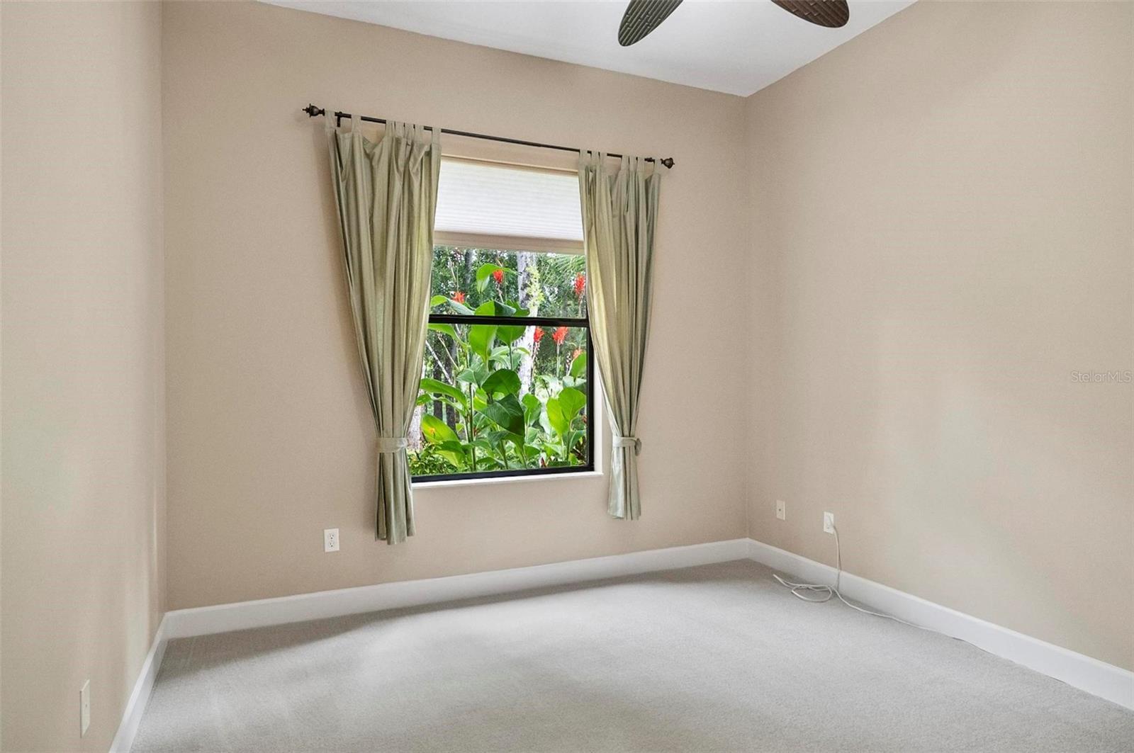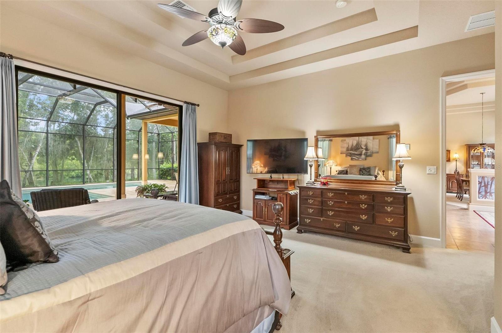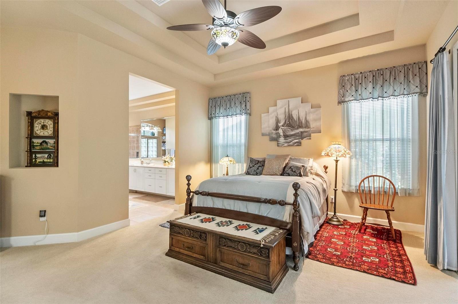 - Solid Wood Cabinets, Tray Ceiling(s), Window Treatments, Ceiling Fans(s), Eat-in Kitchen, High Ceilings, Primary Bedroom Main Floor, Split Bedroom, Stone Counters, Thermostat, Walk-In Closet(s)