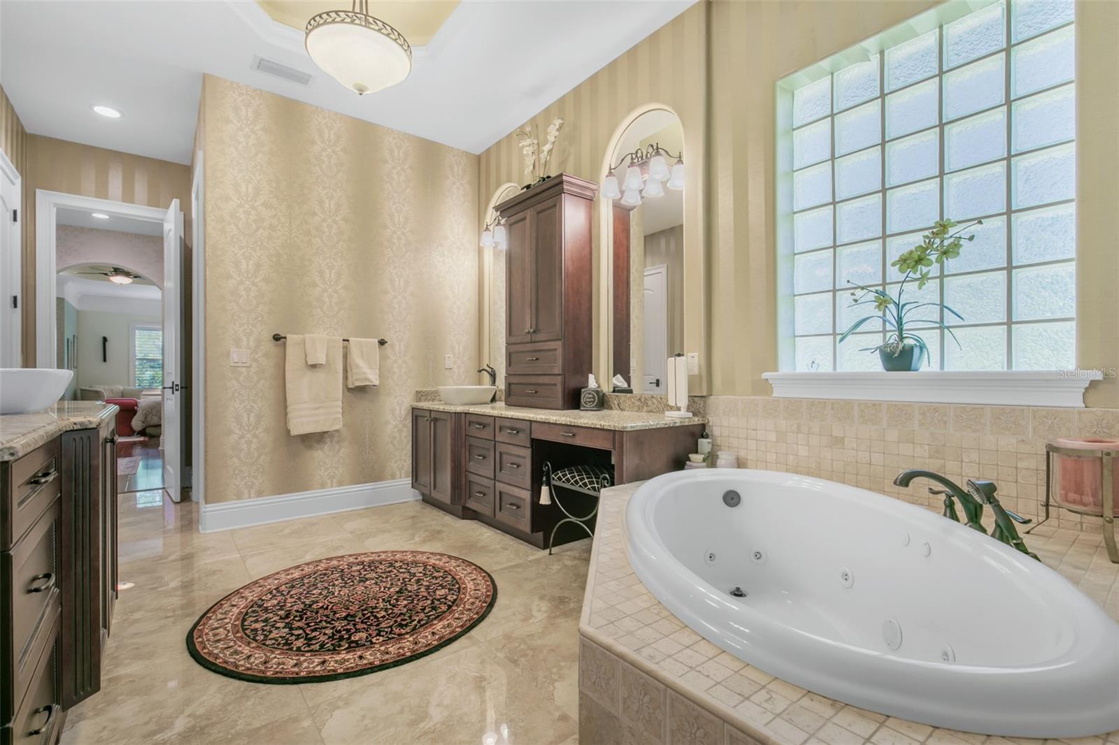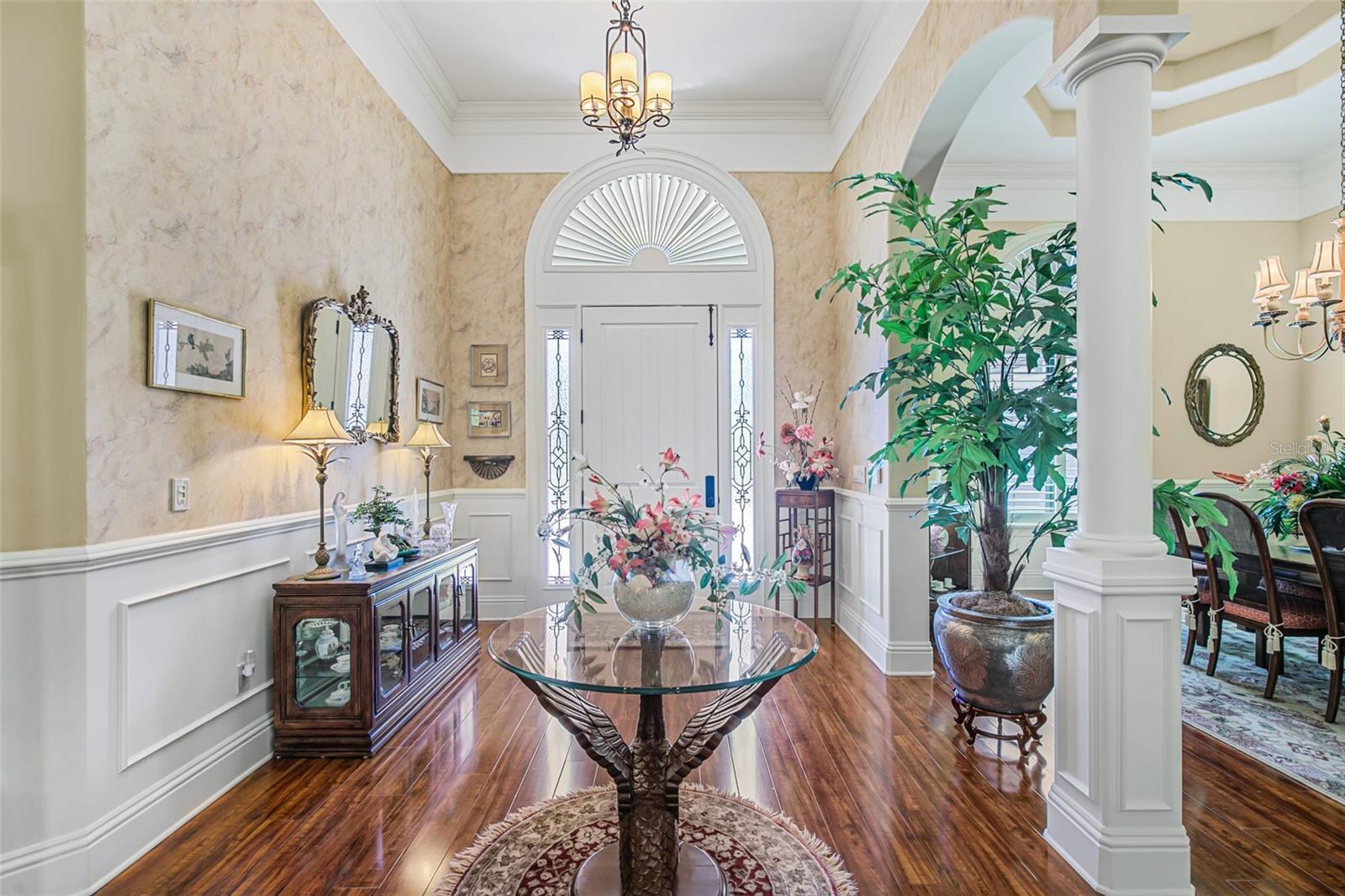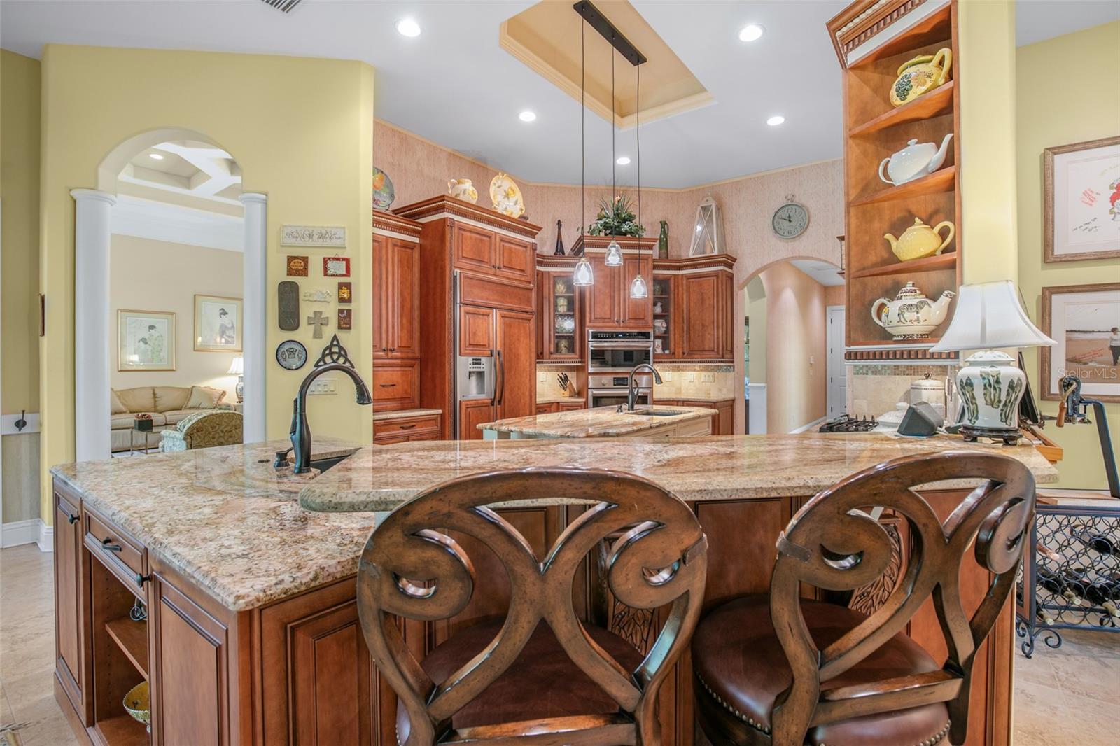 - Built-in Features, Ceiling Fans(s), Chair Rail, Coffered Ceiling(s), Crown Molding, Kitchen/Family Room Combo, Primary Bedroom Main Floor, Solid Surface Counters, Solid Wood Cabinets, Thermostat, Tray Ceiling(s), Walk-In Closet(s), Wet Bar, Window Treatments