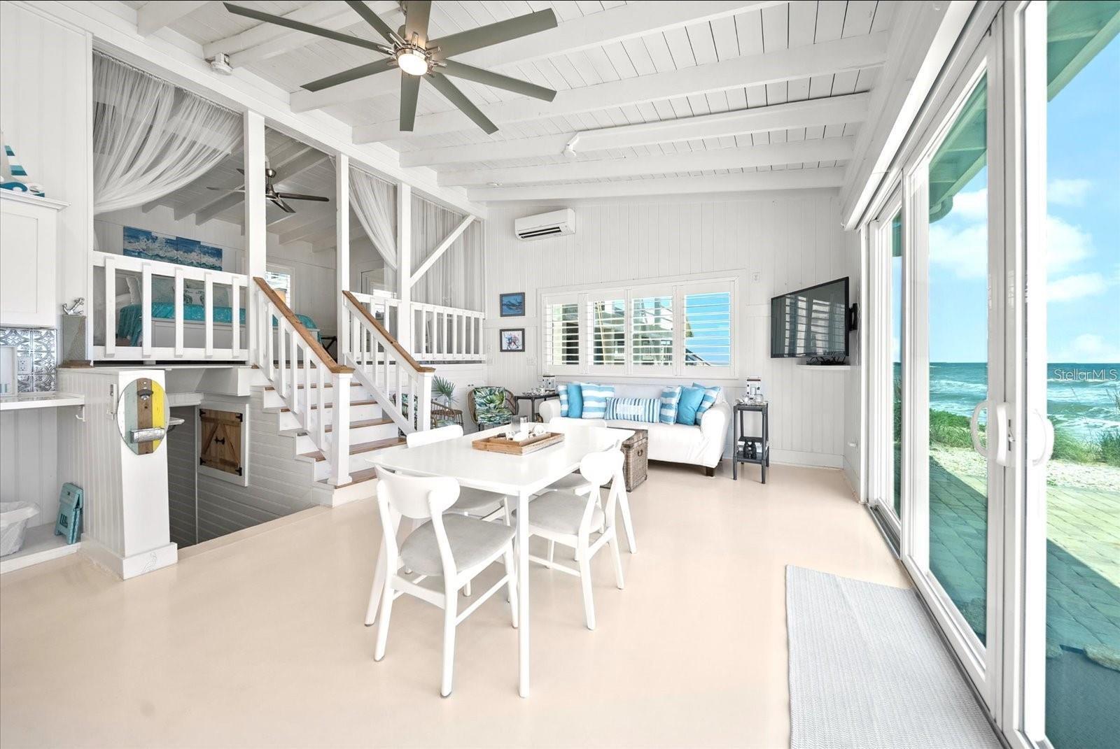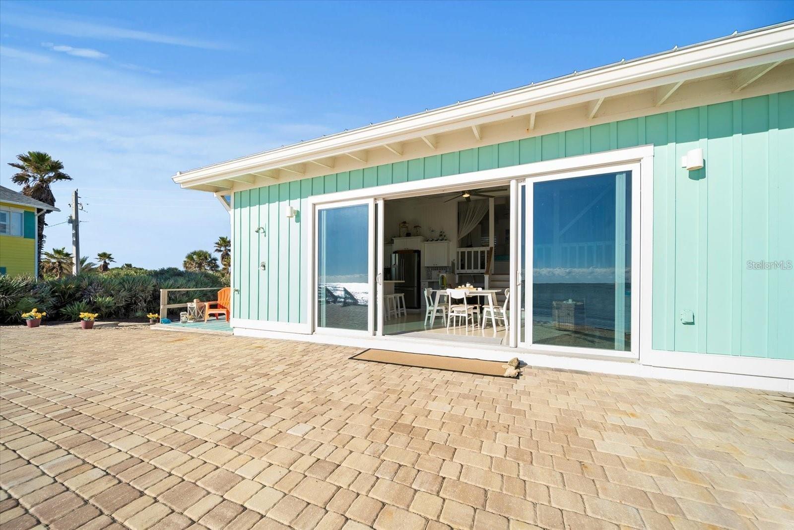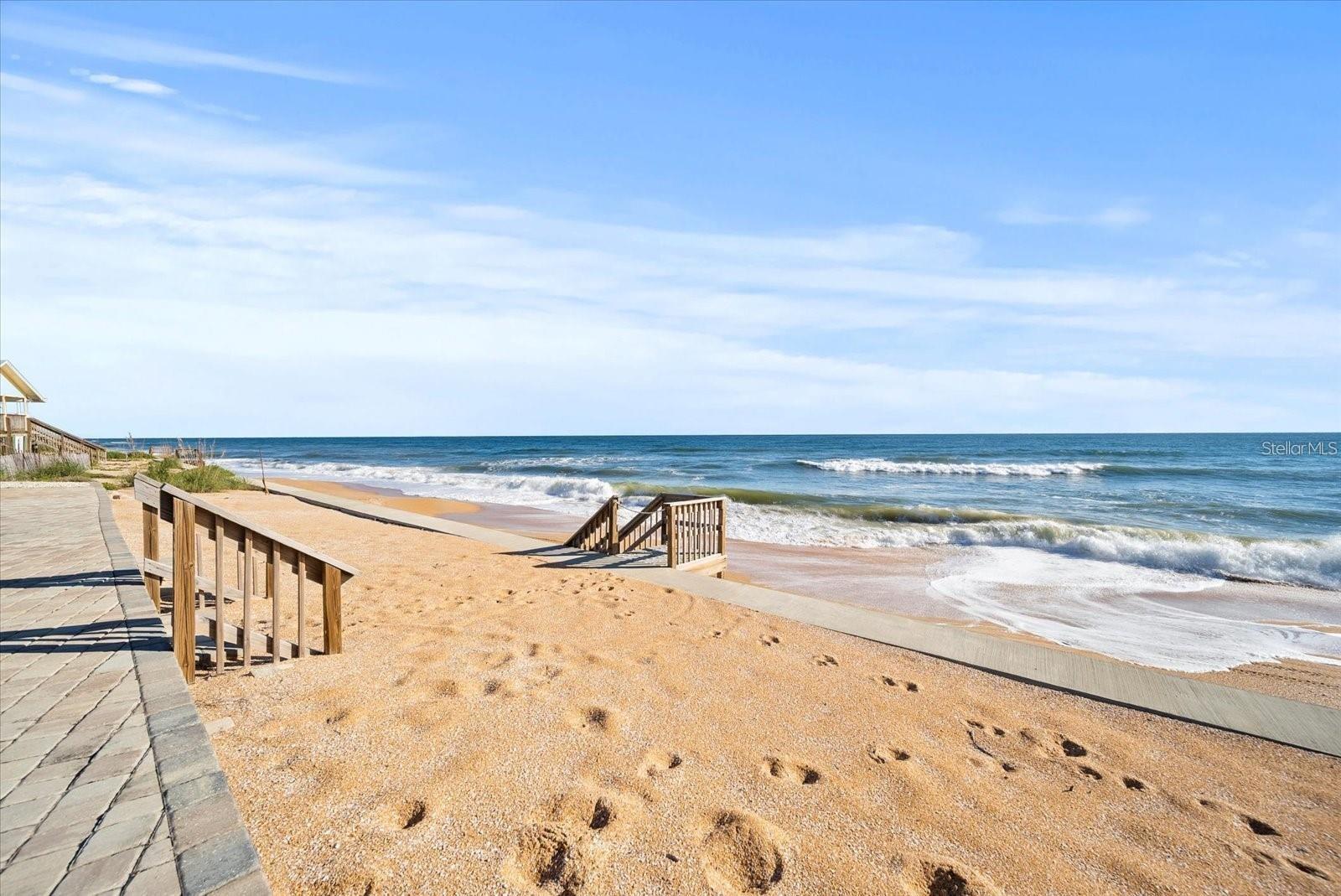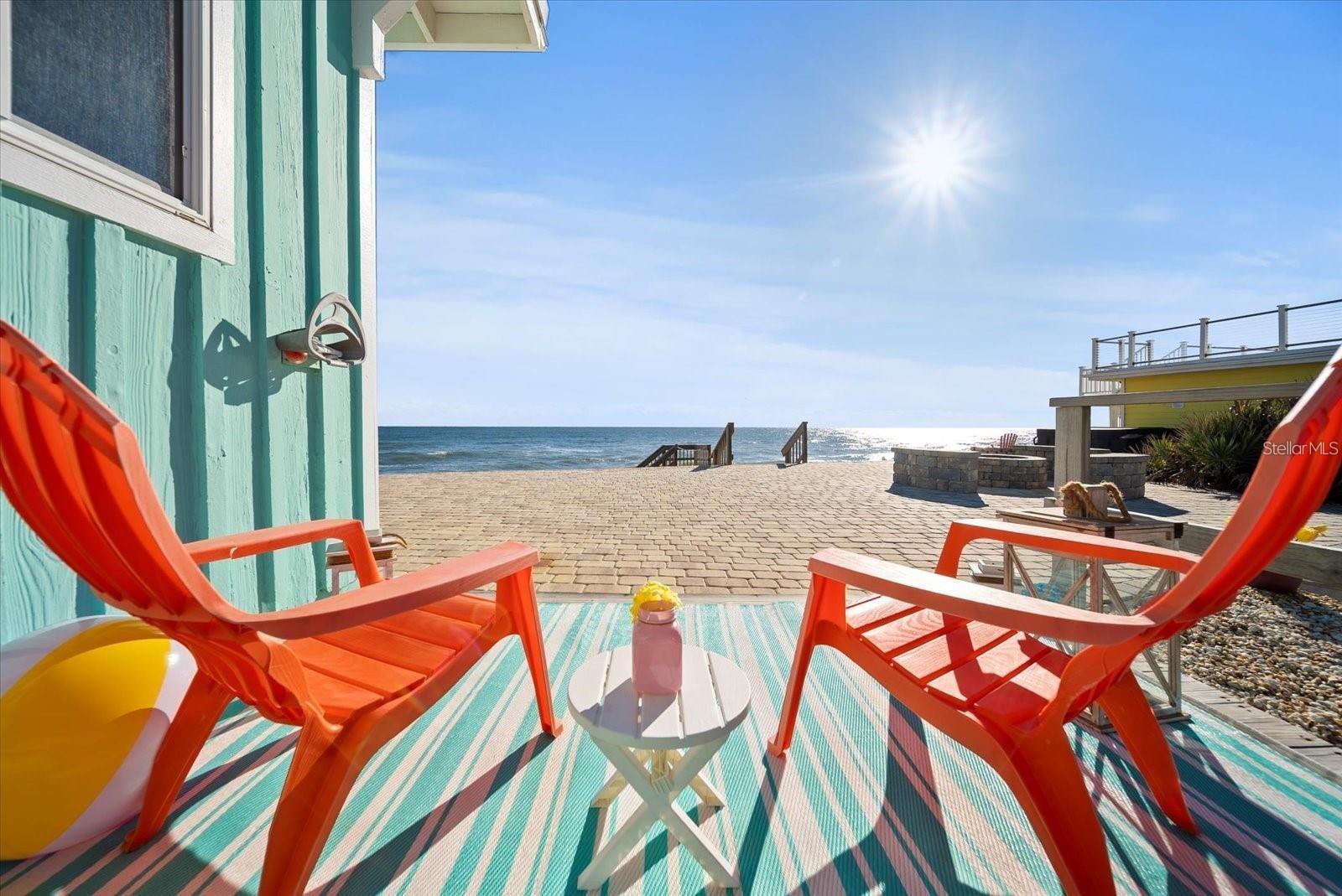 DIRECT OCEAN FRONT! Gorgeously remodeled beachfront home, as seen on HGTV Beachfront Bargain Hunt Restoration. The pictures will excite you, and they speak for themselves. If you are looking for a place to heal your body and soul – this is the place for you! THIS IS A NO PET RENTAL DUE TO OWNER ALLERGIES. This enchanting oceanfront hide-away welcomes you to unplug, relax and de-stress! Panoramic ocean views from the living room beckon you to take in this slice of paradise. The eight-foot sliding glass doors lead to a private expansive paved beachfront patio. The large plantation shutters provide privacy and give the home that island touch! Wake up to breathtaking sunrise views over the Atlantic from your master suite. Breathe in the clean salty ocean air while enjoying coffee on the porch as you listen to the sounds of the surf and watch the dolphins play! This gem of a home is well protected with a sea wall. Wind down your day under the starry skies and balmy breezes by your wood burning fire pit. For your entertainment, fun oceanfront restaurants and establishments are just minutes away. Sidewalk and bike path from county line to county line in place for bike riding or walking on A1A. Being directly on the Atlantic Ocean, there no streets to cross and nothing between you and the cinnamon sands of Flagler Beach except a few steps! This home sleeps 6 with a glorious Master Bedroom on the upper-level, opening to the Ocean view, a guest room on the lower level and 2 bunks tucked away on the lower level as well. This light and bright home is completely furnished in a charming beachside designer style. This is a hypoallergenic home – NO PETS, NO SMOKING ANYWHERE ON PREMISES.