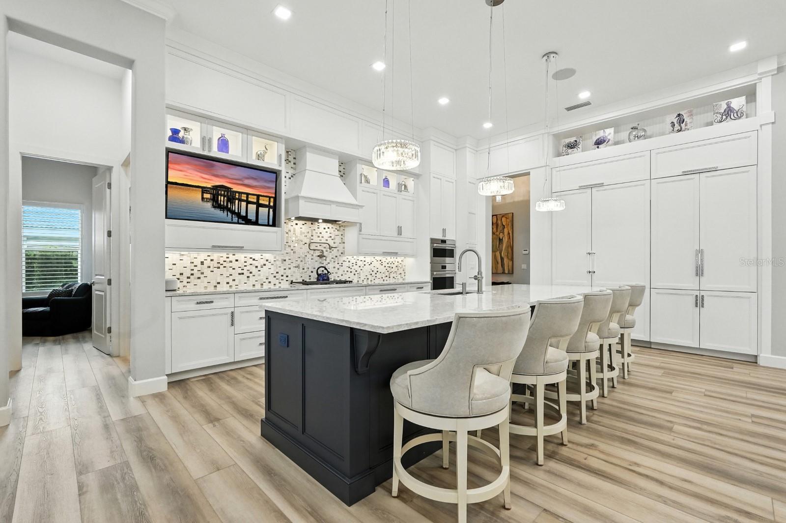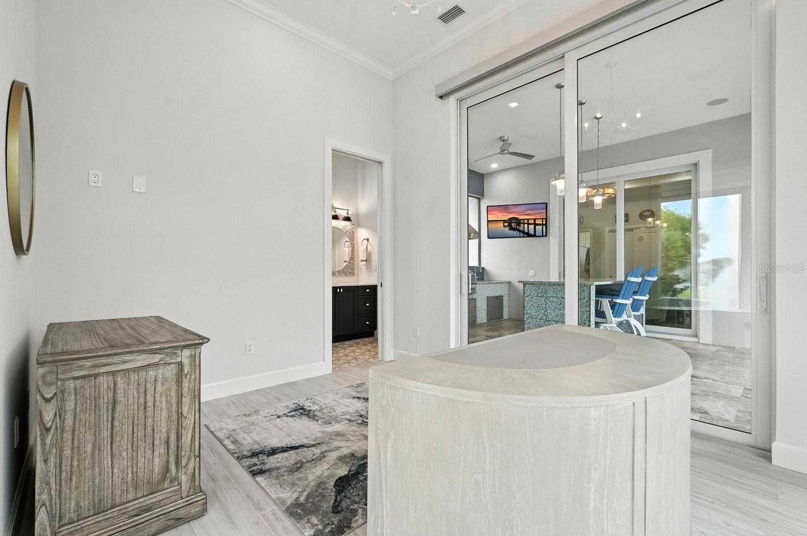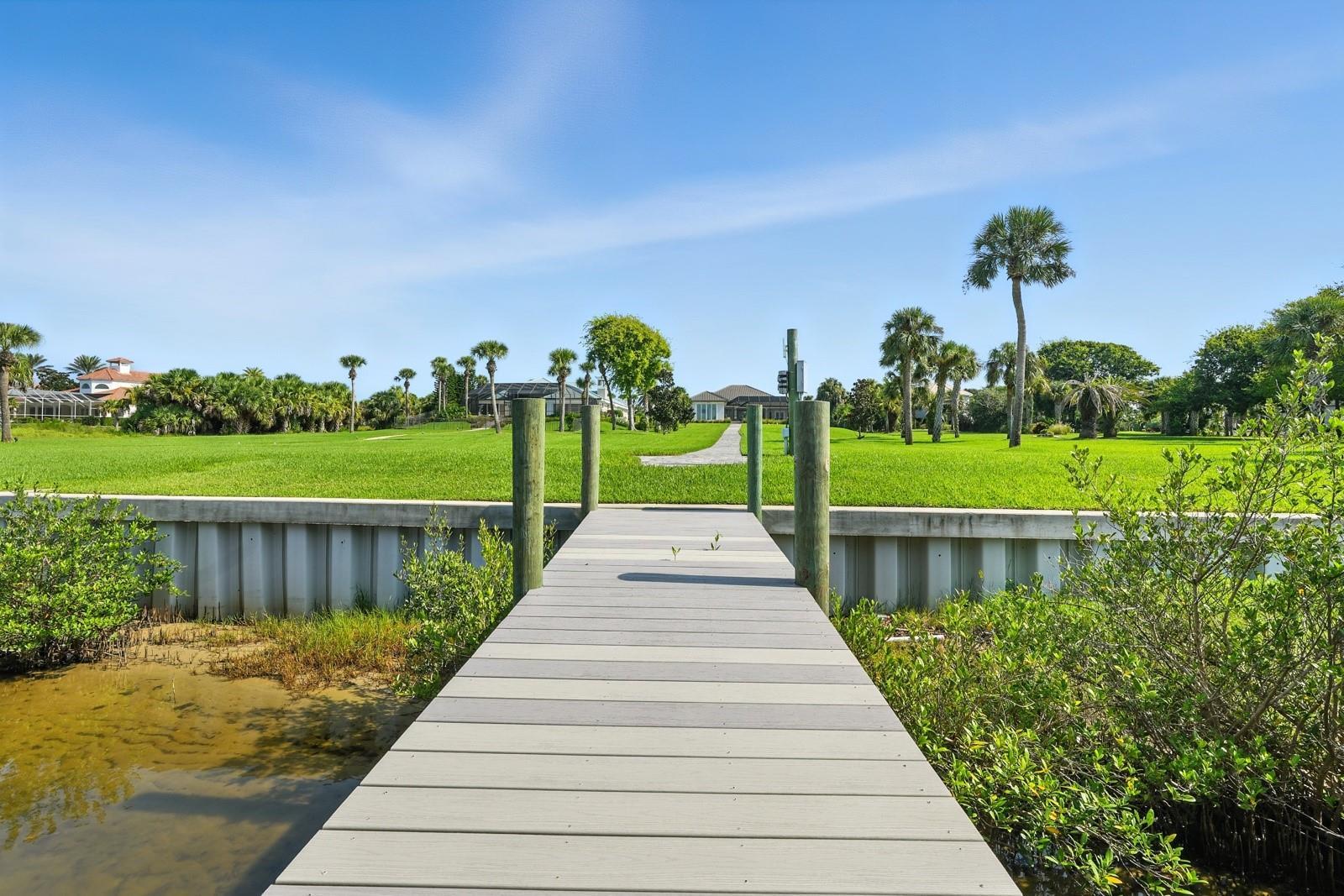 Step into the most exclusive community in Flagler County — Island Estates at Hammock Dunes! This private island enclave is a rare sanctuary where luxury, privacy, and the ultimate Florida lifestyle converge. Completed in 2022, this extraordinary estate is designed for those who dream of boating from their backyard, practicing golf on their own greens, and hosting unforgettable gatherings against a breathtaking waterfront backdrop. From the moment you pass through the double entry doors, sweeping views of the Intracoastal Waterway set the tone for the home’s elegance. Every detail has been thoughtfully curated, and brought to life by master builder Charles Rinek. The open-concept floor plan showcases five bedrooms, four and a half baths, an office, and a private casita, blending expansive entertaining areas with serene private retreats. At the center of it all is the chef’s kitchen, a true showpiece with Sub-Zero, Wolf, and Cove appliances, a massive island with seating, a stylish mosaic backsplash, and designer pendant lighting. A separate butler’s pantry with Sub-Zero wine storage and a prep sink ensures effortless entertaining. Just steps away, the living room stuns with soaring tray ceilings, a custom feature wall with a sleek fireplace, and wide-plank luxury vinyl flooring that flows throughout the home. The dining room is equally memorable with its dramatic onyx-inspired accent wall and contemporary chandelier, creating a striking backdrop for intimate dinners or grand celebrations. The owner’s retreat is a sanctuary of its own, featuring two oversized custom walk-in closets and a spa-like bath with dual vanities, quartz counters, and an oversized glass-enclosed shower with dual shower heads. Guest accommodations are equally luxurious, with a private suite and two spacious bedrooms joined by a Jack-and-Jill bath, all designed to comfortably fit king-sized beds. A detached casita adds even more flexibility with its own private entry, bedroom, full bath, and dedicated office. Outdoors, the property transforms into a private resort. The screened lanai encloses an infinity-edge pool and spa accented by fire bowls and water features, while a sunken firepit creates a dramatic focal point for evening gatherings. Multiple lounging and dining areas, a fully equipped outdoor kitchen, and a built-in misting system make entertaining effortless year-round. Two putting and chipping greens extend the luxury lifestyle, inviting fun between boat rides from your private dock. The covered dock is a tranquil waterfront escape out of your dreams. The massive space with built-in seating offers sweeping views up and down the Intracoastal. Watch the boats pass by and dolphins at play as you relax in the shade! Additional features elevate the home’s prestige even further, including a four-car garage with staircase leading to air-conditioned storage above, an EV charging station, a whole-house generator, and an advanced security system. This home is more than a residence — it is a statement of prestige, where every day feels like a coastal retreat and every moment embodies the ultimate Florida lifestyle.