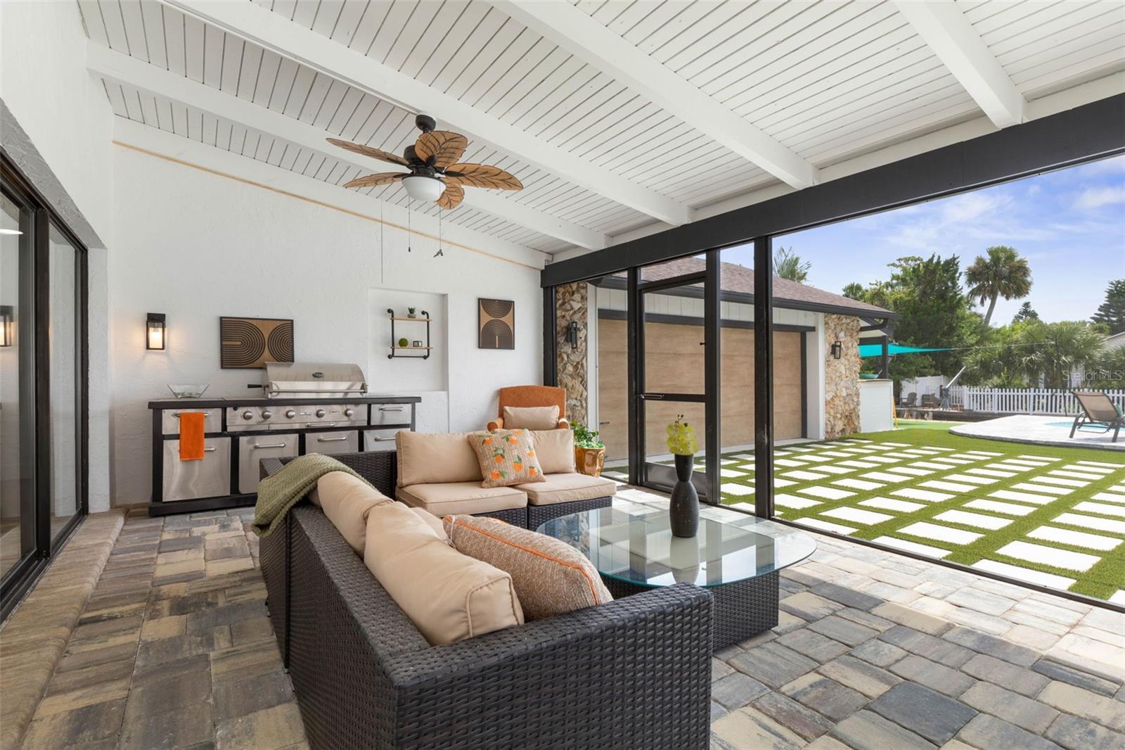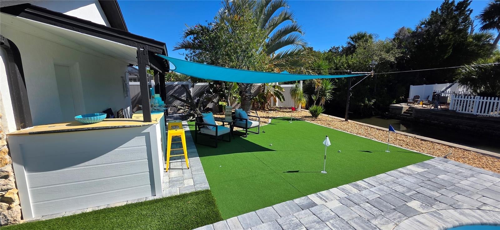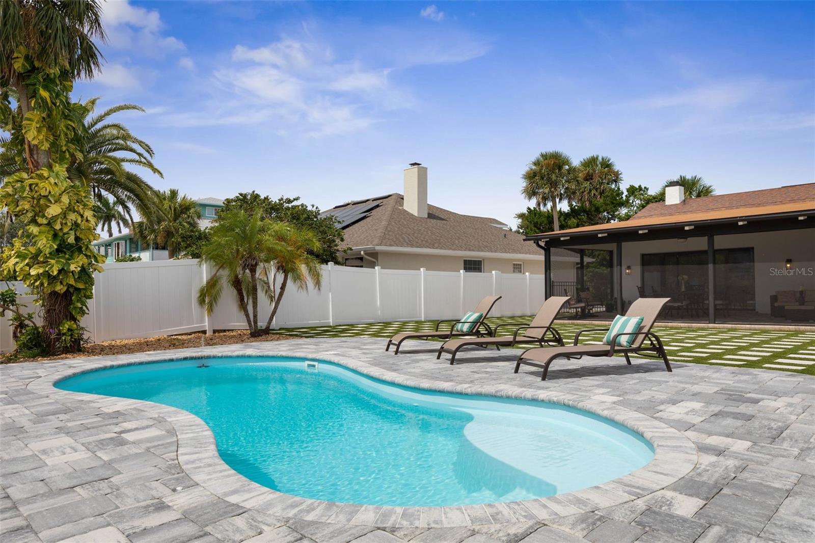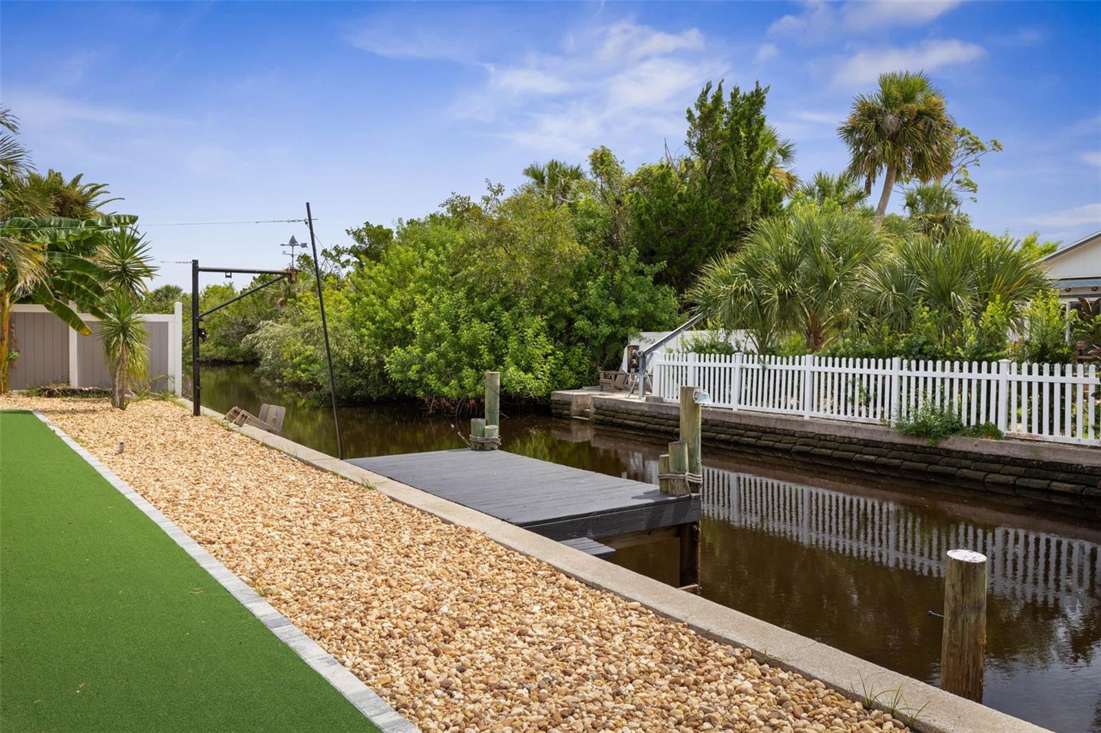 Your coastal lifestyle in Flagler Beach is here — just steps from the sand and only five homes from the Intracoastal. Recent price improvement for this spectacularly remodeled and exquisitely appointed, this waterfront residence on a saltwater canal offers a private dock, new pool and putting green and brand new luxury finishes throughout. The chef’s kitchen is a showpiece, featuring quartz counters, a built-in refrigerator, and a commercial gas range. The dining room includes a built-in wine bar with a double wine refrigerator — perfect for entertaining. An open great room with vaulted ceilings, stone fireplace, and dual sets of sliders seamlessly connect indoor and outdoor living. The thoughtful floor plan includes 4 bedrooms and 3.5 baths. The primary suite is a retreat with dual sinks, a walk-in shower with rain and handheld fixtures, and a large, custom walk-in closet with built-ins. One guest bedroom — large enough to serve as a second primary — enjoys a private ensuite bath, while the remaining two bedrooms share a Jack-and-Jill designed bath, ensuring every bedroom has direct bathroom access. A powder room is conveniently available for guests. Additional features include a separate laundry room with washer, dryer, built-in cabinetry, and folding area, plus an 650 sq. ft. oversized two-car rear accessed garage through with an 18' garage door and access to the backyard bar and entertainment space. Outdoor living is equally impressive. A large screened, pavered and covered lanai with a built-in summer kitchen and your own putting green next to a playful surfboard-topped bar by the pool create an entertainer’s paradise! The property showcases a low-maintenance paver and concrete driveway with an electronic privacy gate, while the backyard and driveway feature modern paver stone inlays surrounded by artificial turf for a clean, upscale finish. Energy-efficient geothermal heat pump systems provide heating and cooling, while new impact-resistant casement windows further enhance comfort and peace of mind. Beyond your dock, enjoy quick access to the Intracoastal Waterway for boating, inshore fishing, or ocean excursions. Just blocks away, Flagler Beach offers a laid-back, golf cart or walkable coastal lifestyle with its iconic pier, vibrant downtown restaurants and shops, and abundant opportunities for recreation on both land and water. This is a rare opportunity to own a fully remodeled, turnkey home that combines premium finishes, thoughtful design, private dockage, and a sought-after coastal location. Owner financing available!