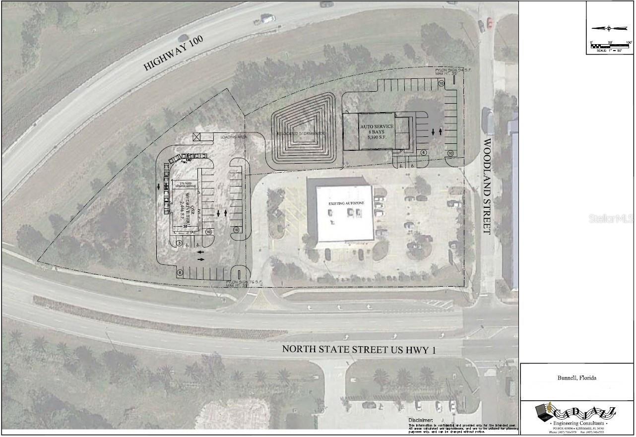 Five parcel assemblage at the junction of N State St (US-1), SR 100 W and E Woodland St. Total of 3.37 acres pad-ready for development with utilities at the site. Conceptual plan for two buildings. 300+ feet of frontage on US-1, 700+ feet of frontage on SR 100 W, 100+ feet of frontage on E Woodland St. Directly adjacent to Advance Auto Parts and across from O’Reilly Auto Parts. Zoned City of Bunnell B-1 (Business) which allows retail, service, restaurant, automotive uses, etc. FLDOT AADT 19,600 on US-1 and 10,100 on SR 100W.