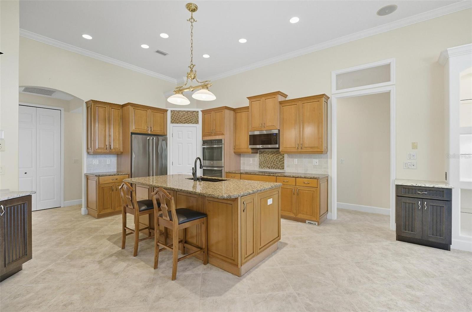- Built-in Features, Ceiling Fans(s), Crown Molding, Eat-in Kitchen, High Ceilings, Kitchen/Family Room Combo, Other, Primary Bedroom Main Floor, Solid Wood Cabinets, Split Bedroom, Stone Counters, Thermostat, Tray Ceiling(s), Walk-In Closet(s), Wet Bar, Window Treatments