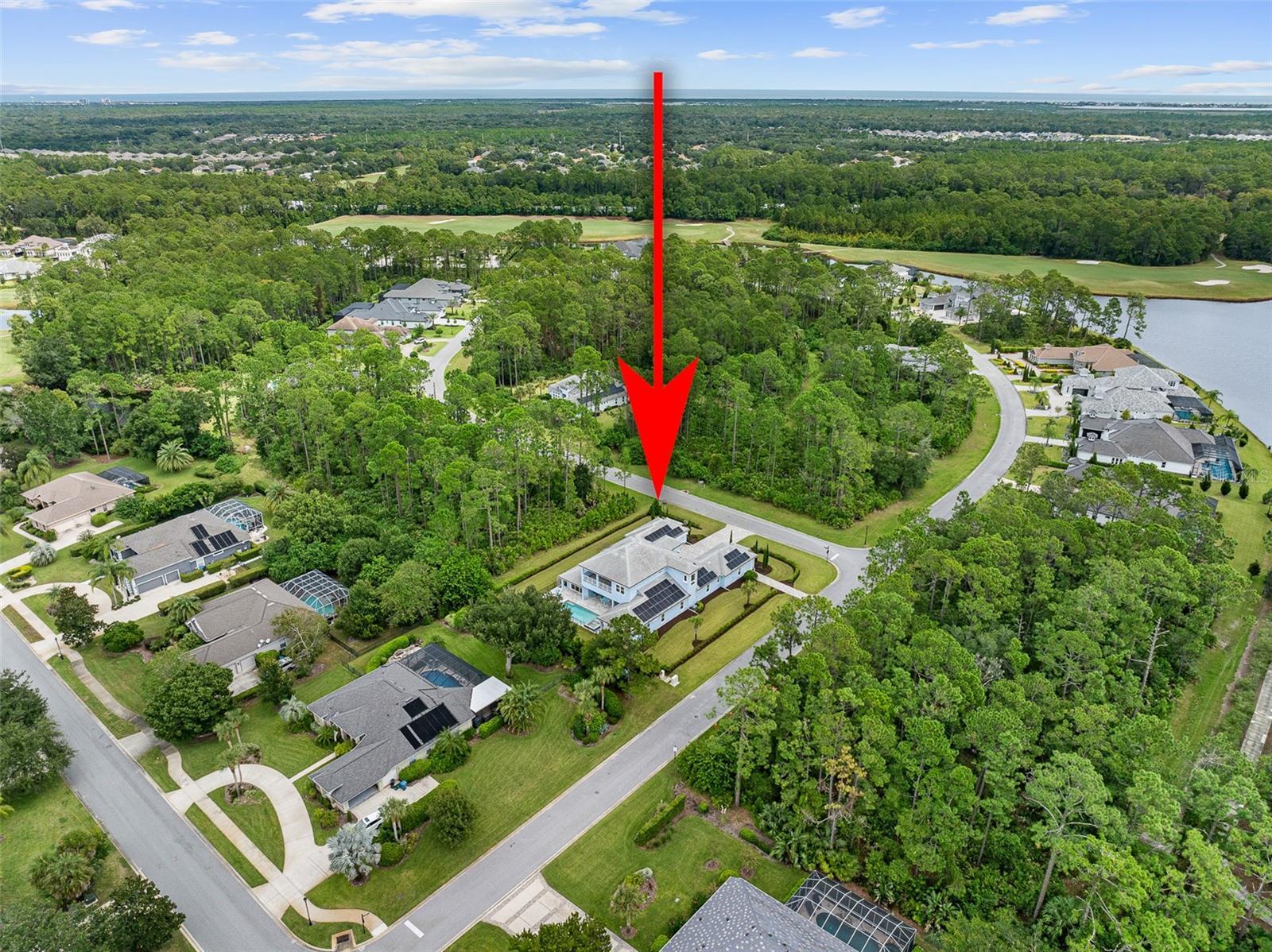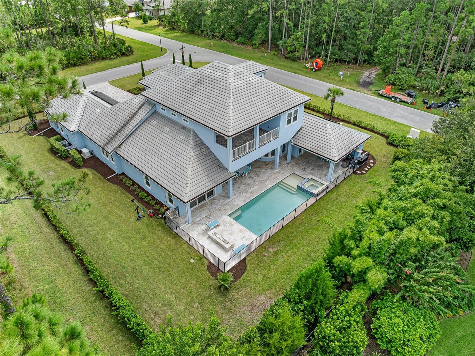 One or more photo(s) has been virtually staged. Stunning estate home offering an expansive 5,454 square feet of luxury living in the Plantation Bay fully SOLAR POWERED. Perfectly situated on a private corner lot of over half an acre, featuring 5 bedrooms, office, loft, bonus room, and 4 full baths, along with a rare 6+ car garage. Enter into a grand foyer adorned with a crystal chandelier & crown molding. The family room boasts soaring coffered ceilings, custom built-ins, and a striking linear gas fireplace set on a full stone wall, with four vanishing sliders that seamlessly open to the lanai with electric blinds. The gourmet kitchen showcases granite countertops, double-stacked cabinetry, GE Profile stainless steel appliances including gas range & convection oven, an oversized drop-edge granite island with charging towers, walk-in pantry, and storage features such as pull-out spice racks & two-tone cabinetry. A breakfast nook with rounded windows overlooks the pool & the formal dining room is appointed with porcelain tile floors, crown molding, tray ceiling, & crystal chandelier. The expansive primary suite offers a private foyer entrance, crown molding, plantation shutters, triple sliders with electric blinds to the lanai, and dual custom walk-in closets. The master bath features dual floating vanities with granite, a soaking tub, walk-in shower, & private commode with electric bidet. A private exercise room/sauna extends the suite's retreat. Bedroom 2,3,& 4 are all on the first floor. Each with custom closets & electric blinds, Bedroom 4 featuring en-suite bath with lanai access. Upstairs, a loft/library space leads to a massive bonus room with theater setup, triple sliders to a private balcony, and full bath connecting to the fifth bedroom with walk-in closet & balcony access. 2nd story balcony features pavers and expansive bird's eye views of the pool and yard. The outdoor living space is an entertainer's paradise, with extended pool & elevated spa with LED lighting, travertine decking, & remote-control systems. A full cabana kitchen includes a grill, sink, cabinetry, beverage fridges, fire pit, all overlooking the private backyard with lush landscaping for ultimate privacy. Fully fenced in yard, anchored on a corner lot with privacy hedges surrounding the home. This home has full house solar creating the ultimate energy efficiency and excellent cost of living. Additional highlights include 10'-14' ceilings, custom closet systems throughout, Control4 home automation with integrated lighting/audio/security, propane tank on remote for range/grill/heater on jacuzzi/fireplace/firepit, tile roof, gutters system, whole house generator, whole house water filtration system, extensive camera system, custom light fixtures throughout, expansive built-ins, excellent storage with 2 large storage closets, and pavers driveway surrounded by manicured privacy hedges, plus more. All located in GATED, golf cart friendly community of Plantation Bay with optional memberships available. Membership to include 45 hole of private golf, 9 tennis courts, 10 pickleball courts, new 30 million dollar Founders Clubhouse, additional Prestwick Clubhouse, fitness/spa center, 2 pools with cabana bar & grill, full events calendar, plus more! Buyers of this home to receive substantial discount on initiation fee at the club. Ask listing agent for details. This remarkable residence embodies the true essence of estate living-grand in scale, rich in detail, and designed for both family comfort and entertainment.