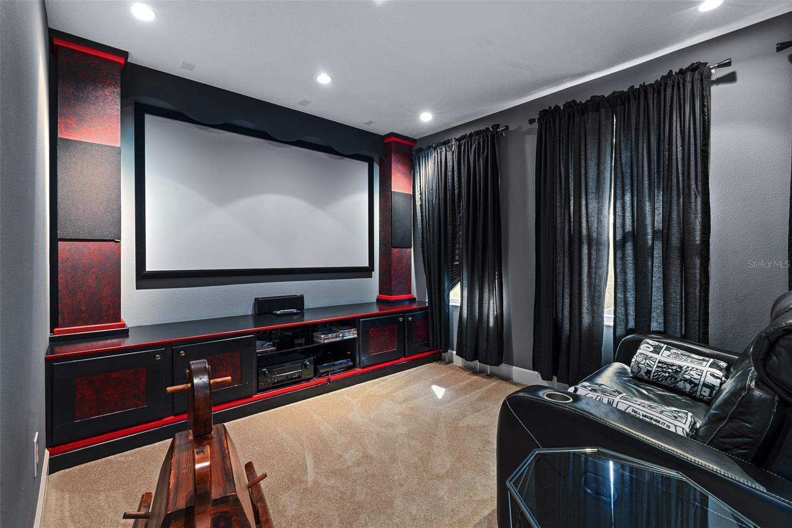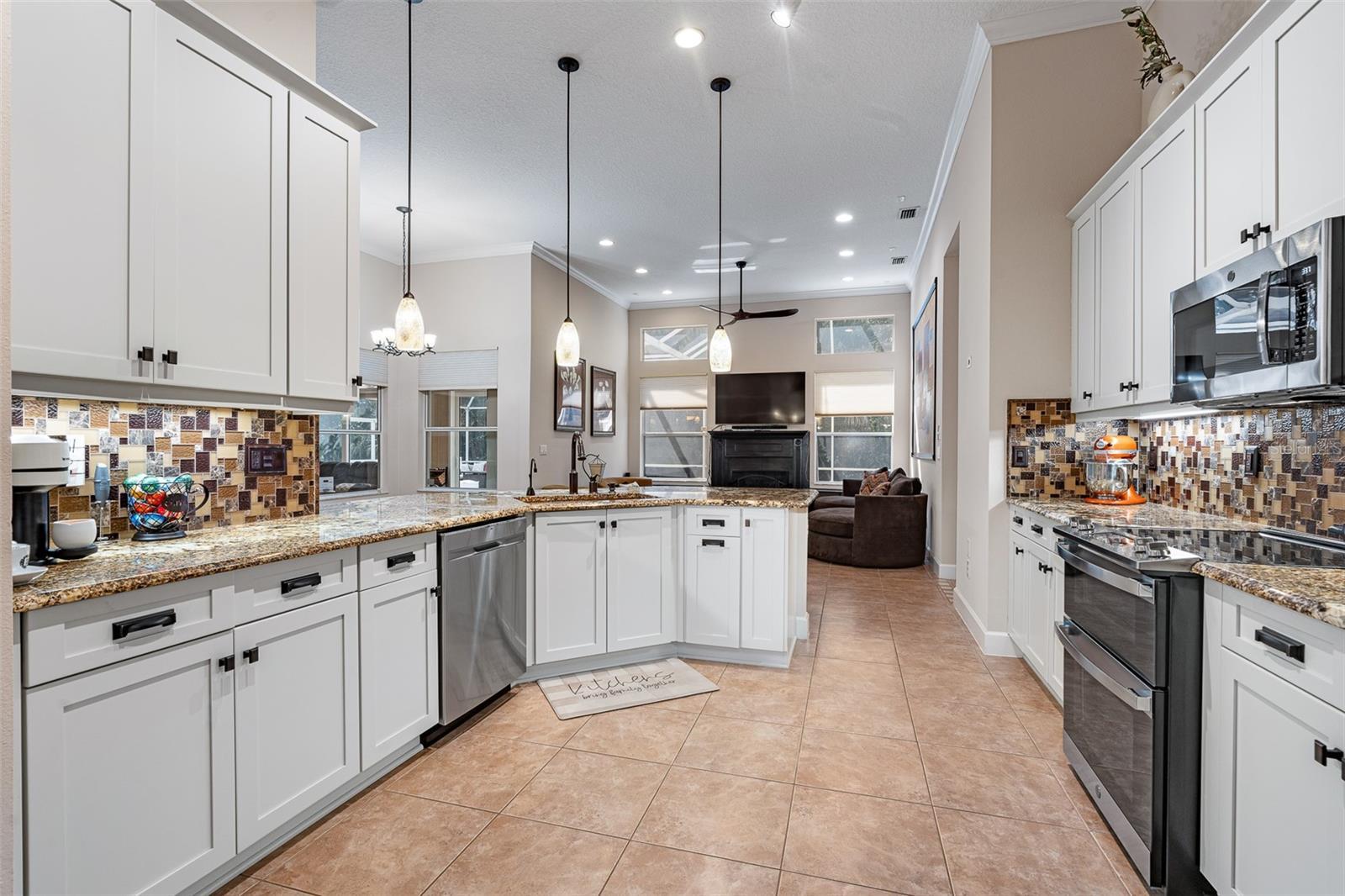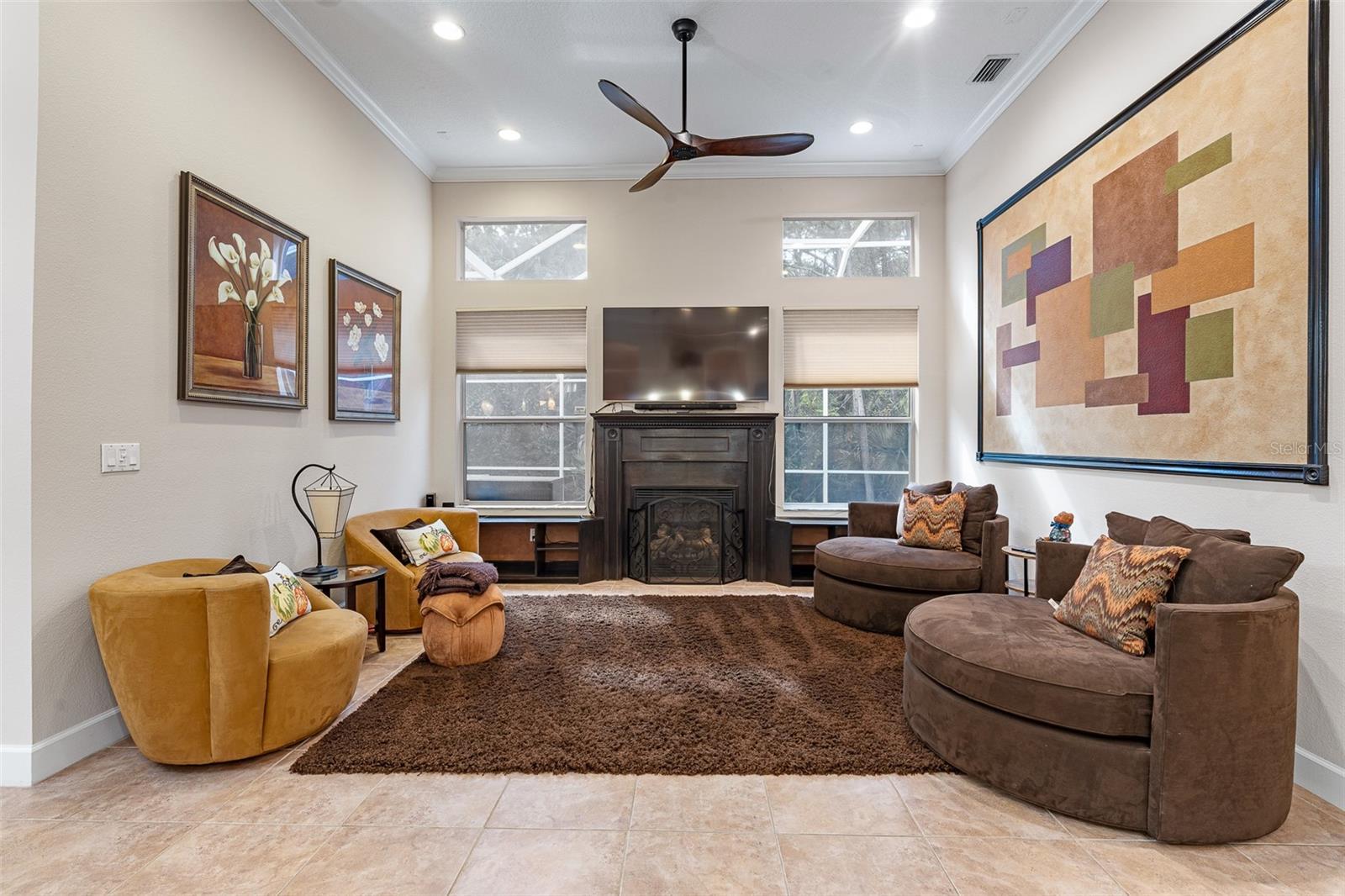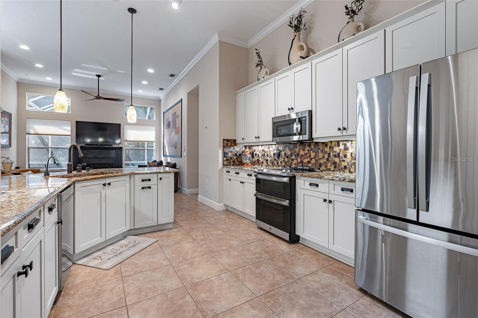 One or more photo(s) has been virtually staged. Welcome to 945 Stone Lake Drive in the prestigious gated community of Plantation Bay, offering a $25,000 ROOF CREDIT to make this already impressive property even more appealing. This spacious home has four bedrooms plus a private theater room, along with an extended air-conditioned Florida room that adds incredible flexibility for entertaining, relaxing, or creating an additional office or fitness space all overlooking your SOLAR heated POOL. Step inside through double glass entry doors to find tile floors with mosaic tile accents. The formal dining room boasts a large window, crown molding, and plush carpet, while the formal living room offers high ceilings, crown molding, and comfortable finishes. The renovated kitchen is a showpiece with 42-inch white cabinetry featuring soft-close dovetail construction and pull-outs, complemented by a mosaic tile backsplash, granite countertops, and a copper sink. Stainless steel apps include a double oven, and a pantry closet provides excellent storage. The breakfast nook opens to the Florida room and features additional countertop and breakfast bar seating that flows into the family room, where you'll enjoy tile floors, gas fireplace, crown molding, and serene views of the pool. The master suite is a retreat with upgraded carpet, tray ceiling with crown molding, surround sound, and dual walk-in closets with built-ins. The spa-inspired bath includes dual sinks with granite countertops, walk-in tile shower, soaking tub, and private commode. With a split floor plan, bedrooms 2-4 are on the other wing of the home. Each with custom built-ins with closet, one with walk-in closet. Sharing Bathroom 2 with granite countertop with 2 sinks, tile tub/shower and door to pool area. Upstairs, the bonus theater room has built-in chairs, blackout curtains, projection screen, mini-split AC, and full surround sound connected to the Control4 system. Upstairs completed with a third bathroom with quartz vanity and tile tub/shower combo. Outdoors, enjoy your private oasis with a four-year-old solar-heated screened pool, extended paver lanai, and preserve views for ultimate privacy. The extended Florida room with its own AC is the perfect spot for entertaining or relaxing year-round. Other upgrades include Control4 smart-home integration with surround sound, lighting, and cameras; mini-split AC units in the master, and upstairs; paver driveway and walkway, laundry room with cabinetry, and widened 2-car garage with built-ins, sink, hot water heater (2021), ceiling racks, generator plug, AC system from 2019, and whole-house water filtration system. Living in Plantation Bay means enjoying one of Florida's premier golf and country club communities. 45 holes of championship golf, 9 lighted Har-Tru tennis courts, 10 pickleball courts, new 30-million-dollar Founders Clubhouse, additional Prestwick Clubhouse, a state-of-the-art fitness center and spa, multiple resort-style pools with cabana bar and grill, miles of walking and biking paths and fully activities calendar. Memberships are available at various levels, from full golf privileges to social memberships for dining and club events. Buyers of this home, who want to receive a substantial discount on initiation fee at the club, ask listing agent for details. This home combines spacious living, luxury amenities, and a prime location with an unbeatable community lifestyle-plus the added value of a $25,000 roof credit. Don't miss your chance to make it yours.