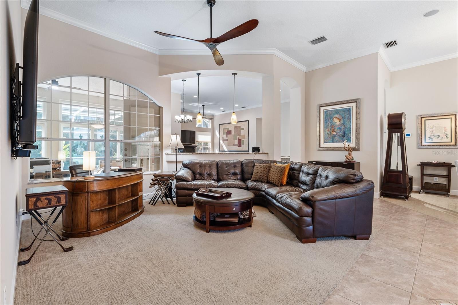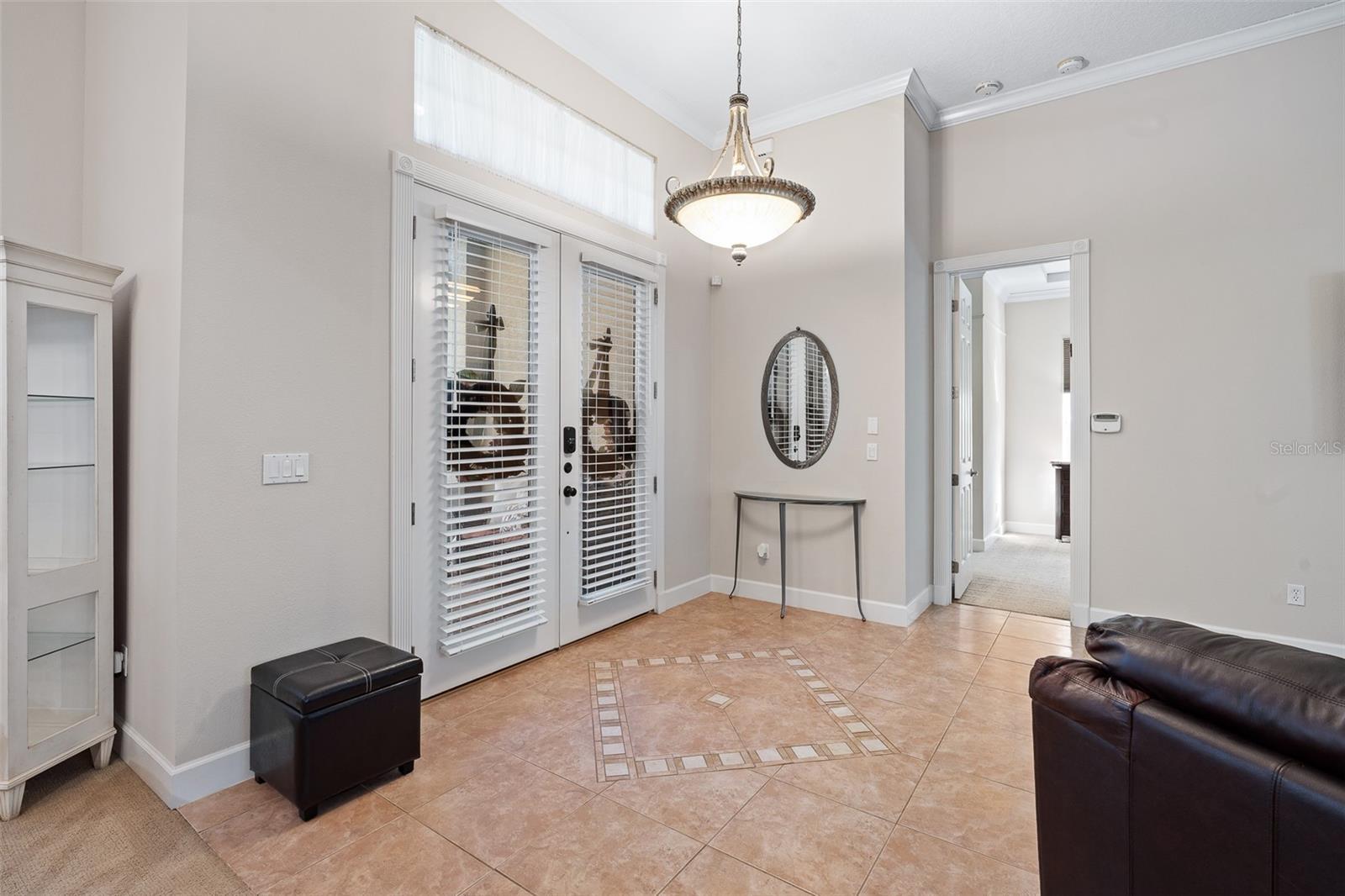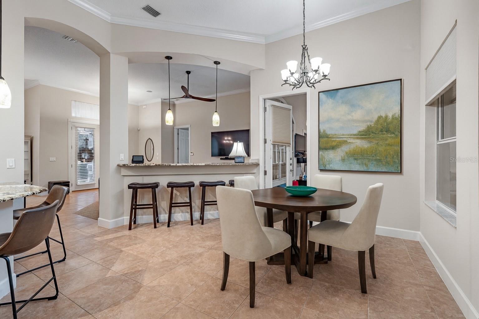One or more photo(s) has been virtually staged. Welcome to 945 Stone Lake Drive in the prestigious gated community of Plantation Bay, offering a $25,000 ROOF CREDIT to make this already impressive property even more appealing. This spacious home has four bedrooms plus a private theater room, along with an extended air-conditioned Florida room that adds incredible flexibility for entertaining, relaxing, or creating an additional office or fitness space all overlooking your SOLAR heated POOL. Step inside through double glass entry doors to find tile floors with mosaic tile accents. The formal dining room boasts a large window, crown molding, and plush carpet, while the formal living room offers high ceilings, crown molding, and comfortable finishes. The renovated kitchen is a showpiece with 42-inch white cabinetry featuring soft-close dovetail construction and pull-outs, complemented by a mosaic tile backsplash, granite countertops, and a copper sink. Stainless steel apps include a double oven, and a pantry closet provides excellent storage. The breakfast nook opens to the Florida room and features additional countertop and breakfast bar seating that flows into the family room, where you'll enjoy tile floors, gas fireplace, crown molding, and serene views of the pool. The master suite is a retreat with upgraded carpet, tray ceiling with crown molding, surround sound, and dual walk-in closets with built-ins. The spa-inspired bath includes dual sinks with granite countertops, walk-in tile shower, soaking tub, and private commode. With a split floor plan, bedrooms 2-4 are on the other wing of the home. Each with custom built-ins with closet, one with walk-in closet. Sharing Bathroom 2 with granite countertop with 2 sinks, tile tub/shower and door to pool area. Upstairs, the bonus theater room has built-in chairs, blackout curtains, projection screen, mini-split AC, and full surround sound connected to the Control4 system. Upstairs completed with a third bathroom with quartz vanity and tile tub/shower combo. Outdoors, enjoy your private oasis with a four-year-old solar-heated screened pool, extended paver lanai, and preserve views for ultimate privacy. The extended Florida room with its own AC is the perfect spot for entertaining or relaxing year-round. Other upgrades include Control4 smart-home integration with surround sound, lighting, and cameras; mini-split AC units in the master, and upstairs; paver driveway and walkway, laundry room with cabinetry, and widened 2-car garage with built-ins, sink, hot water heater (2021), ceiling racks, generator plug, AC system from 2019, and whole-house water filtration system. Living in Plantation Bay means enjoying one of Florida's premier golf and country club communities. 45 holes of championship golf, 9 lighted Har-Tru tennis courts, 10 pickleball courts, new 30-million-dollar Founders Clubhouse, additional Prestwick Clubhouse, a state-of-the-art fitness center and spa, multiple resort-style pools with cabana bar and grill, miles of walking and biking paths and fully activities calendar. Memberships are available at various levels, from full golf privileges to social memberships for dining and club events. Buyers of this home, who want to receive a substantial discount on initiation fee at the club, ask listing agent for details. This home combines spacious living, luxury amenities, and a prime location with an unbeatable community lifestyle-plus the added value of a $25,000 roof credit. Don't miss your chance to make it yours.